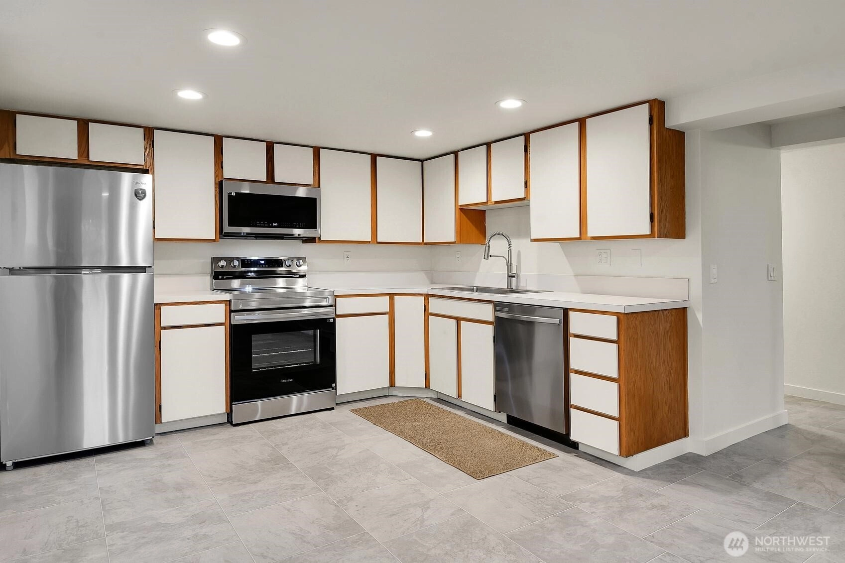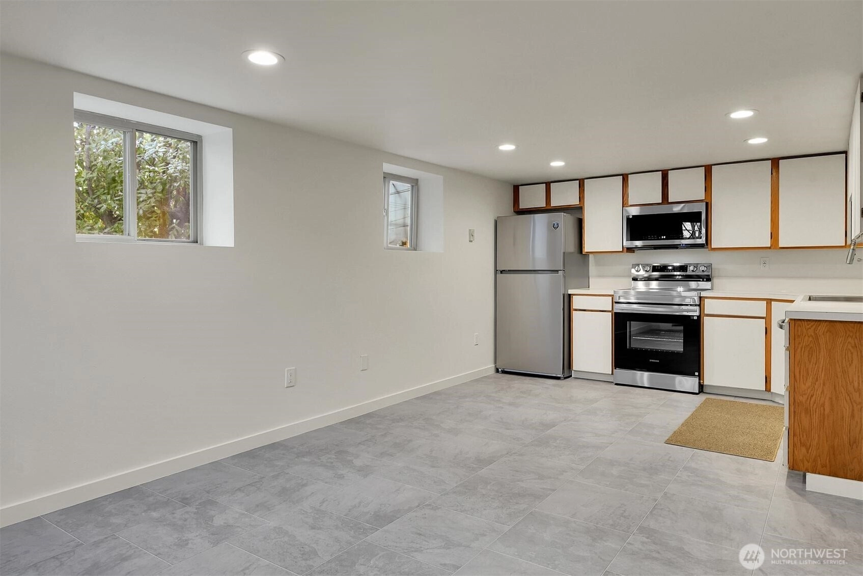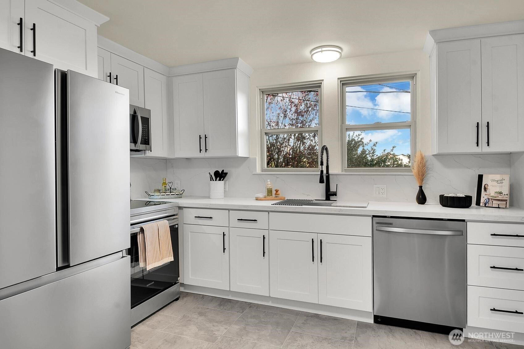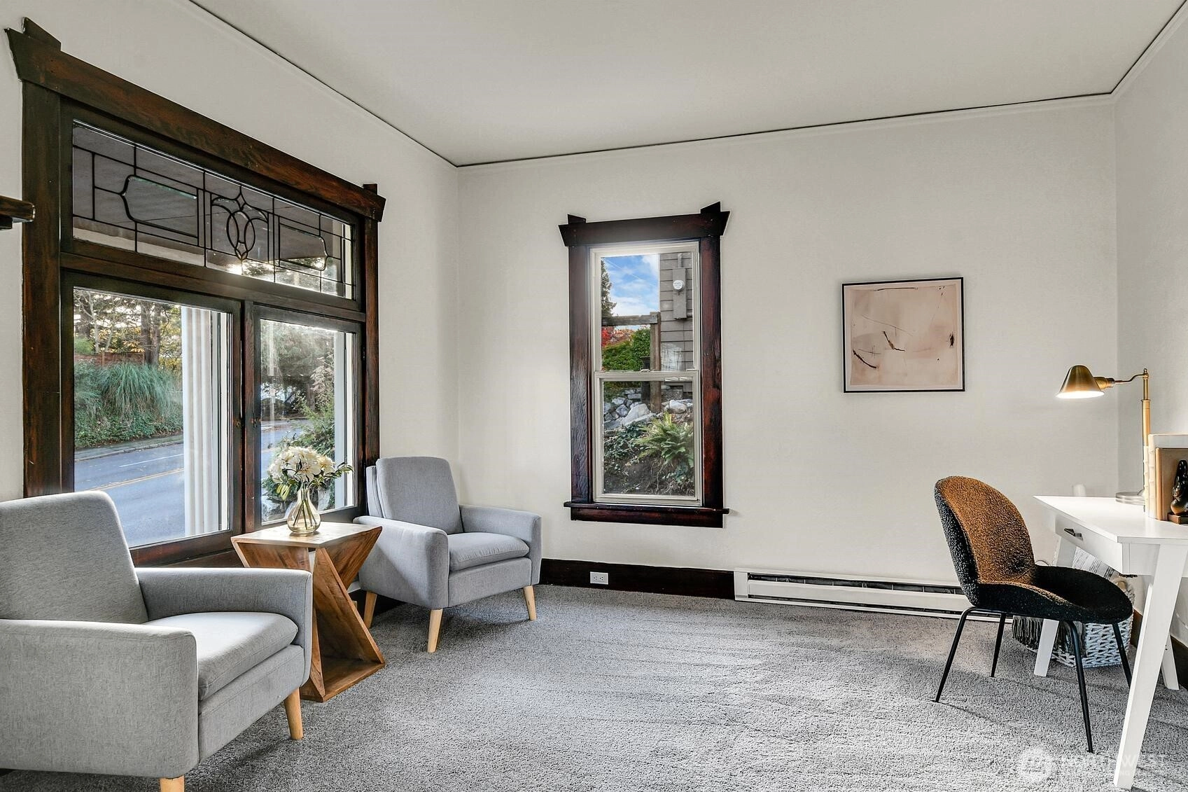Wallingford 6-bed Craftsman lives like a duplex. Original dark-stained wainscoting, rich millwork, box-beam ceilings & built-in cabinetry lend true Craftsman charm. Light-filled living room features fireplace (sealed) & decorative leaded-glass transom windows throughout. Formal dining. All-new kitchen w/ white shaker-style cabinetry, quartz countertops, new sink, Samsung range & all SS appliances. New carpet & vinyl throughout. Upstairs captures city & territorial views. Lower level w/ separate entry & full 2nd kitchen offers great rental or multi-gen potential. Long private driveway w/ ample parking. Owner financing available. Moments to UW, DT Seattle & Green Lake the best of in-city living.