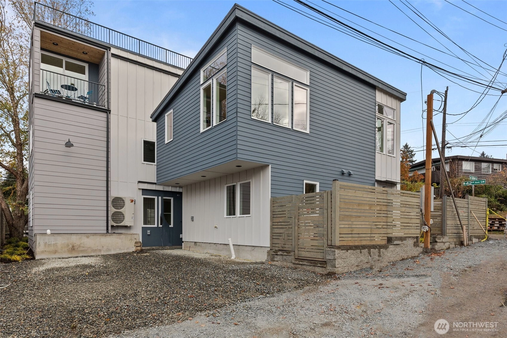 Contemporary design and quality craftsmanship define this stand-alone 3-bedroom DADU delivering light, volume, and privacy. Vaulted ceilings and real hardwoods set a warm tone for the open living and designer kitchen featuring Belmont cabinetry, quartz surfaces, induction range, and elegant fixtures. The primary suite boasts a walk-in closet and custom-tiled bath, complemented by two additional bedrooms and full guest bath below. High-efficiency HVAC and water systems ensure year-round comfort, with no-carpet interiors, a fully fenced private yard, and dedicated off-street parking. A rare fusion of independence, sustainability, and West Seattle charm just minutes from Lincoln Park, shops, and waterfront trails.