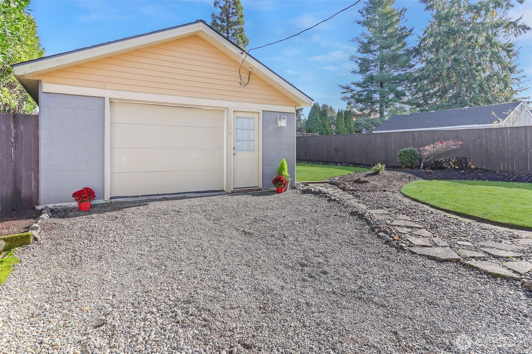 Classic Clinker brick home in the desirable University Place school district. Three bedrooms: two on the main level and one upstairs, used as a home office, with a cozy loft across from it. A compact kitchen with an open concept dining/living room to relax by this winter, from the warmth of the pellet stove. Private, large, maintained yard that is fully fenced. Spacious detached garage (600) sq ft. for all your hobbies and room for a trailer with its own clean out. Great location, close to all the amenities. Walk, bike, or take a short drive to Titlow and Chambers Bay Park. Come and see for yourself.