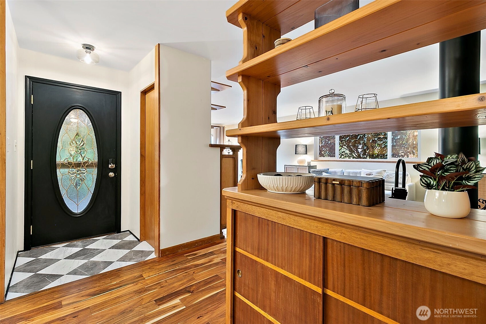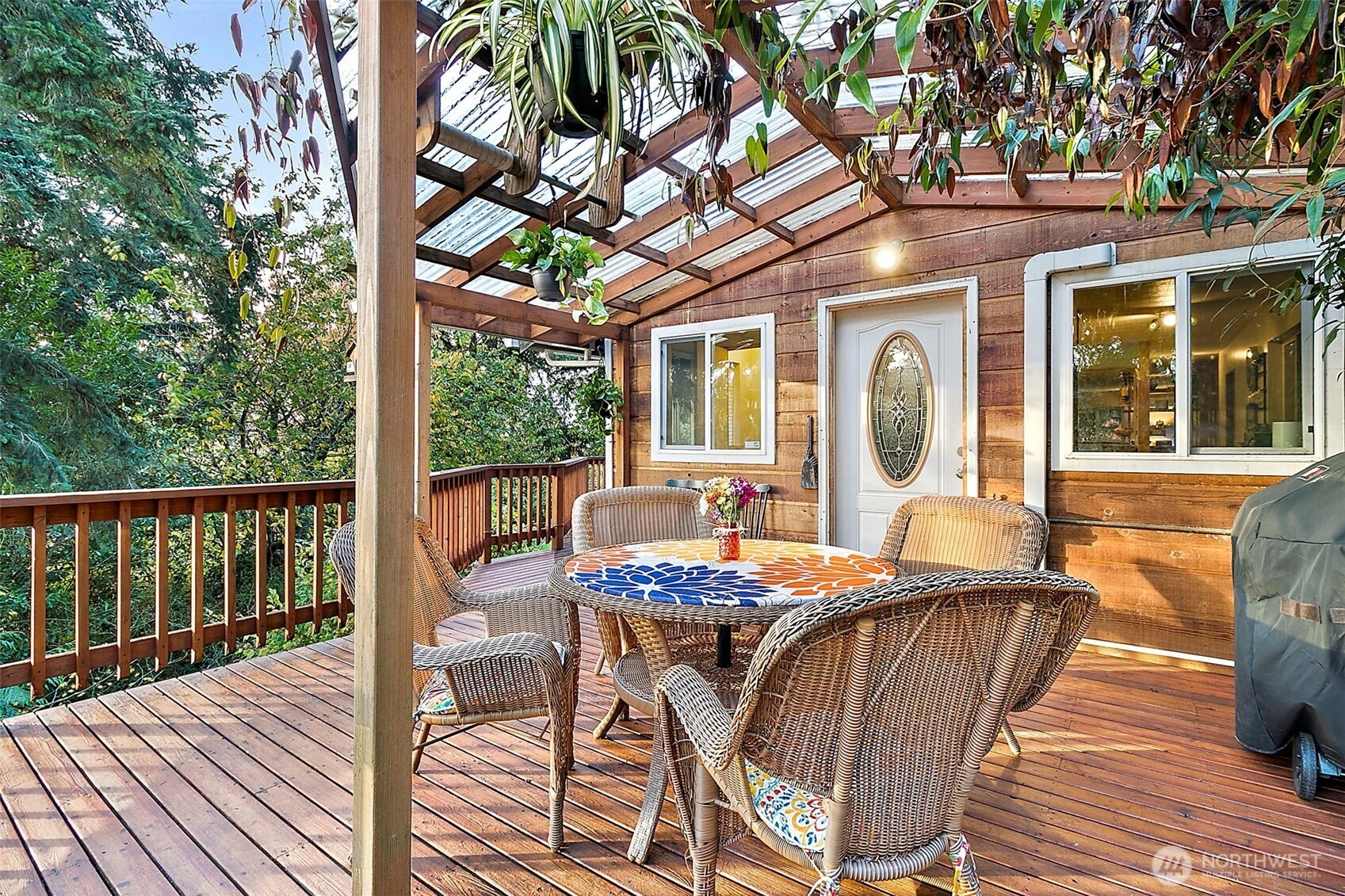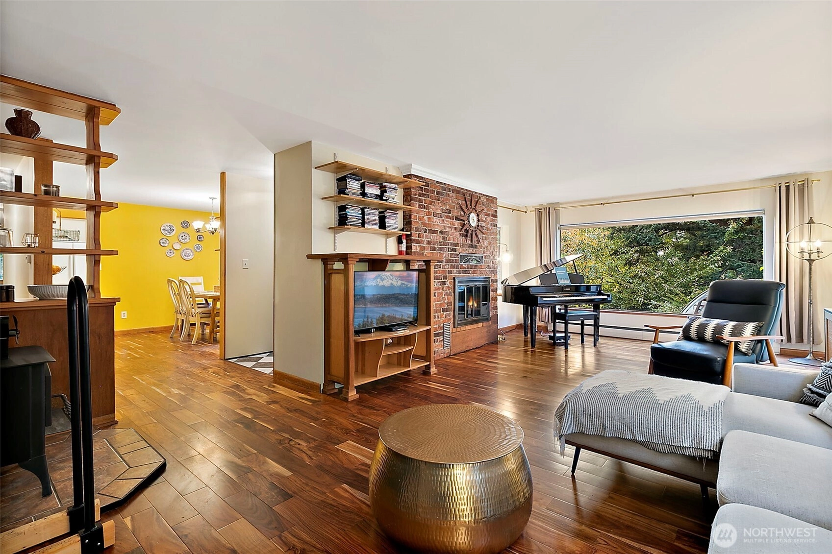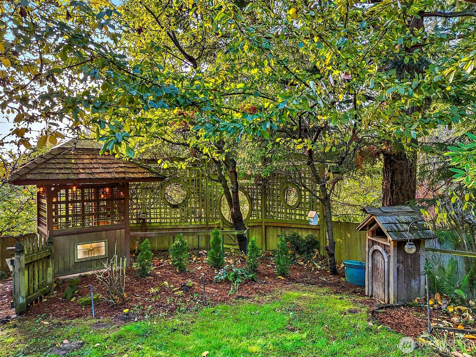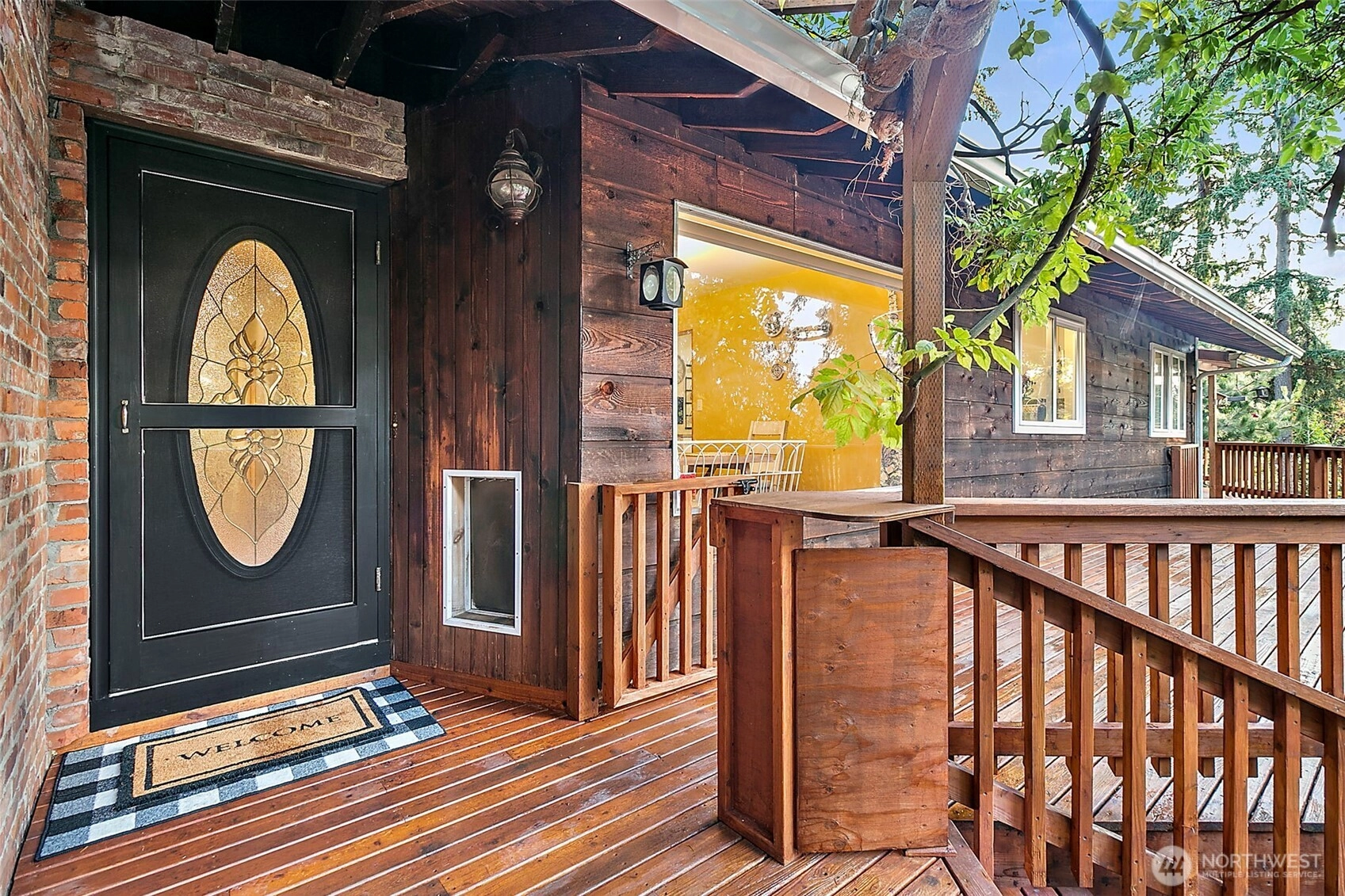 Privacy abounds on this rare double-sized lot in coveted Seahurst! Tucked at the end of a quiet cul-de-sac, this 3 bedroom, 1.5 bath mid-century modern retreat feels like living in a treehouse-surrounded by a lush greenbelt & wrap-around deck. Showcasing beautiful mid-century wood built-ins, wood burning stove + 2 fireplaces, glimpses of the Puget Sound, a new roof ('23), & a fully fenced gardener's dream w/magical landscape. The lower level offers full-height ceilings, flex/bonus rm ideal for office or play, plus huge storage/workshop area. Easy access to downtown Burien shops, the beach, dining & Seahurst waterfront park. À well-maintained vintage gem offering space, serenity & style.