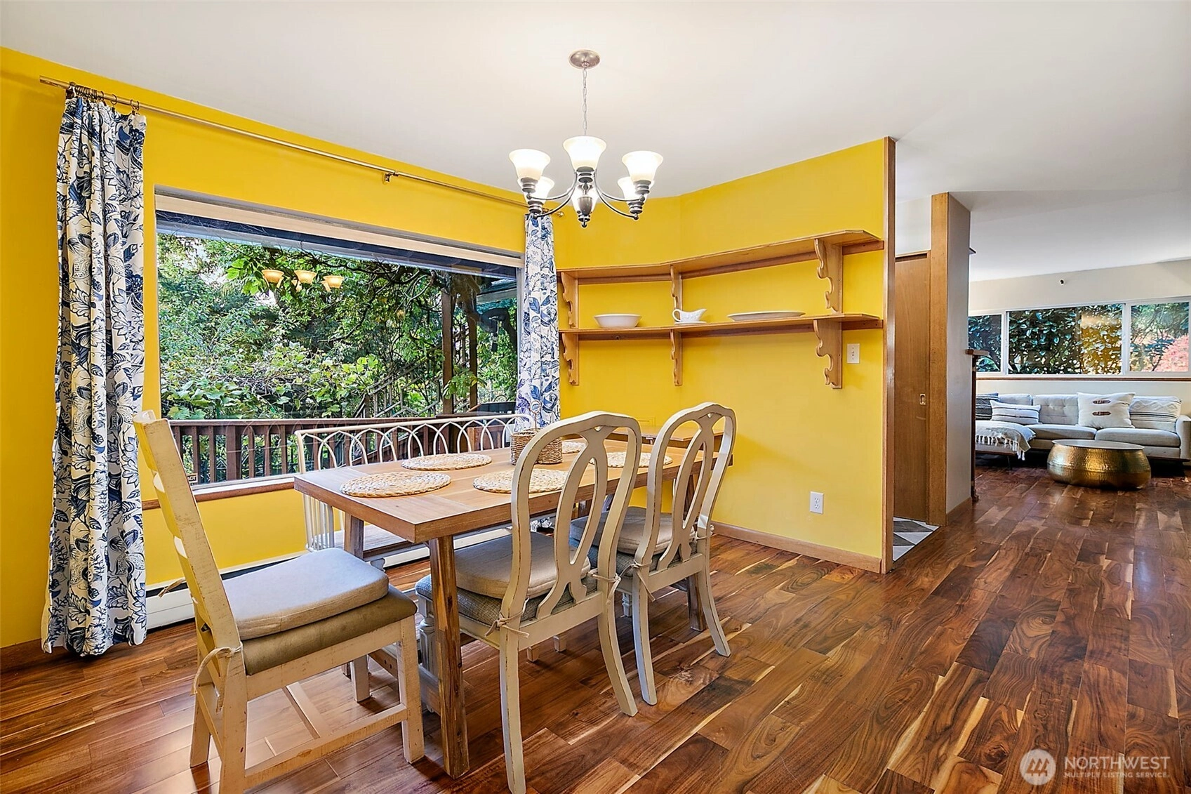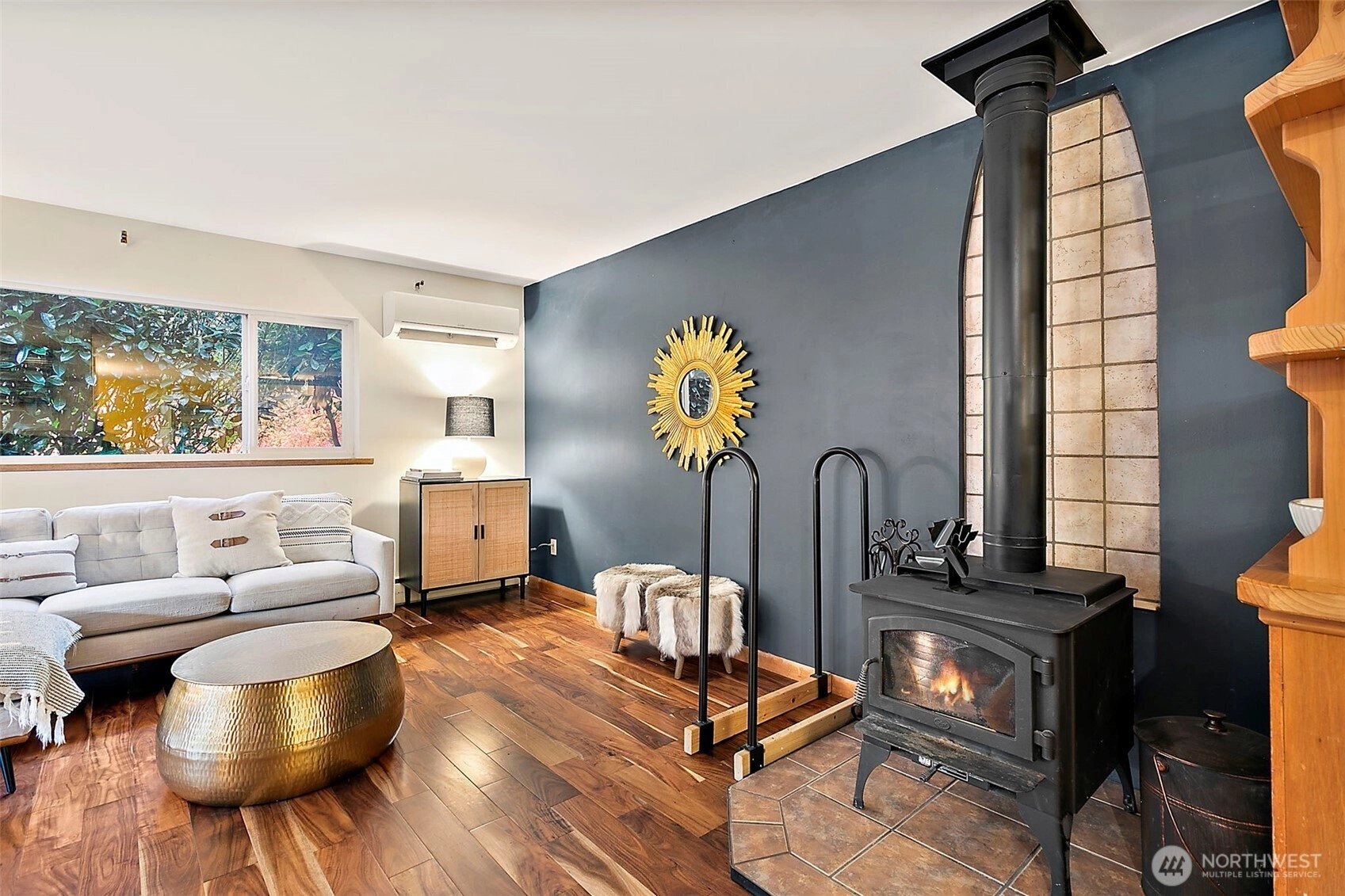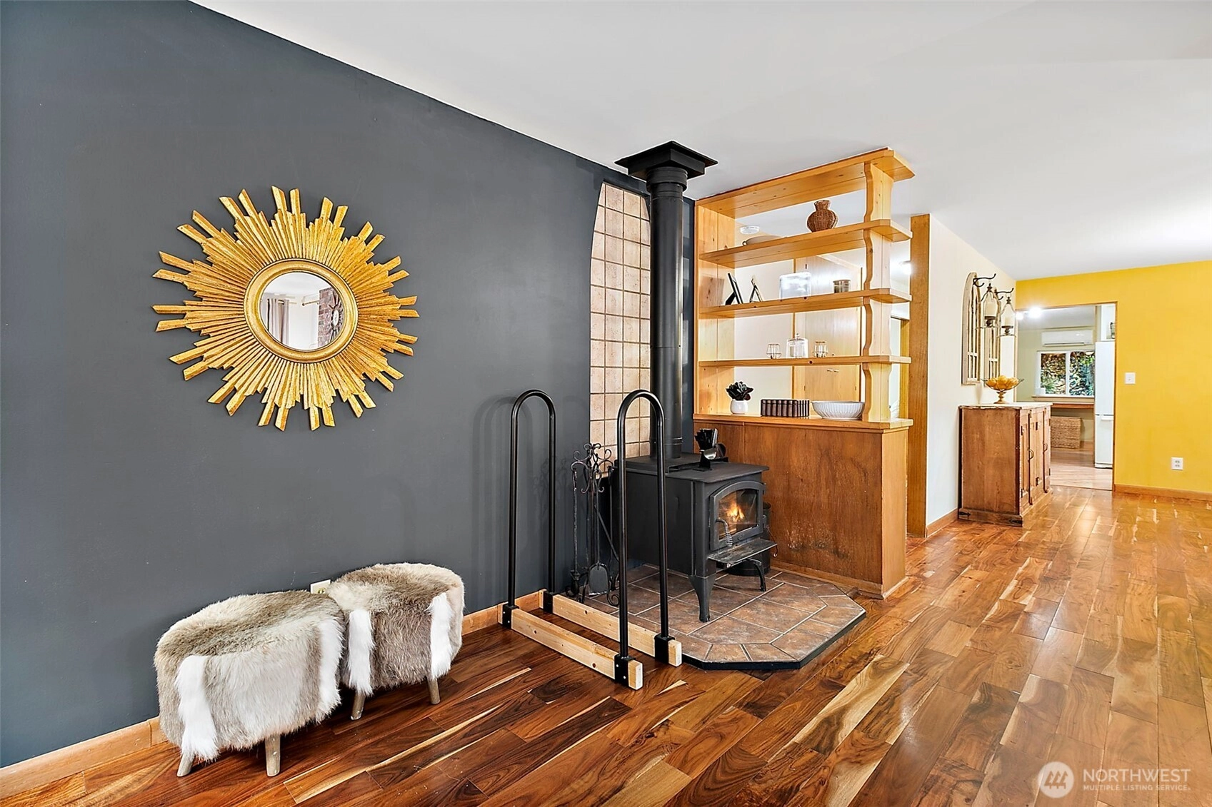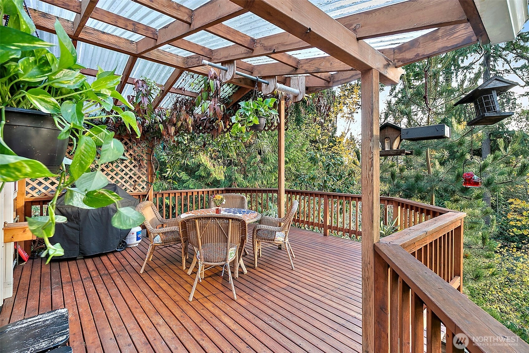 Privacy abounds on this rare double-sized lot in coveted Seahurst! Tucked at the end of a quiet cul-de-sac, this 3 bedroom, 1.5 bath mid-century modern retreat feels like living in a treehouse-surrounded by a lush greenbelt & wrap-around deck. Showcasing beautiful mid-century wood built-ins, wood burning stove + 2 fireplaces, glimpses of the Puget Sound, a new roof ('23), & a fully fenced gardener's dream w/magical landscape. The lower level offers full-height ceilings, flex/bonus rm ideal for office or play, plus huge storage/workshop area. Easy access to downtown Burien shops, the beach, dining & Seahurst waterfront park. À well-maintained vintage gem offering space, serenity & style.