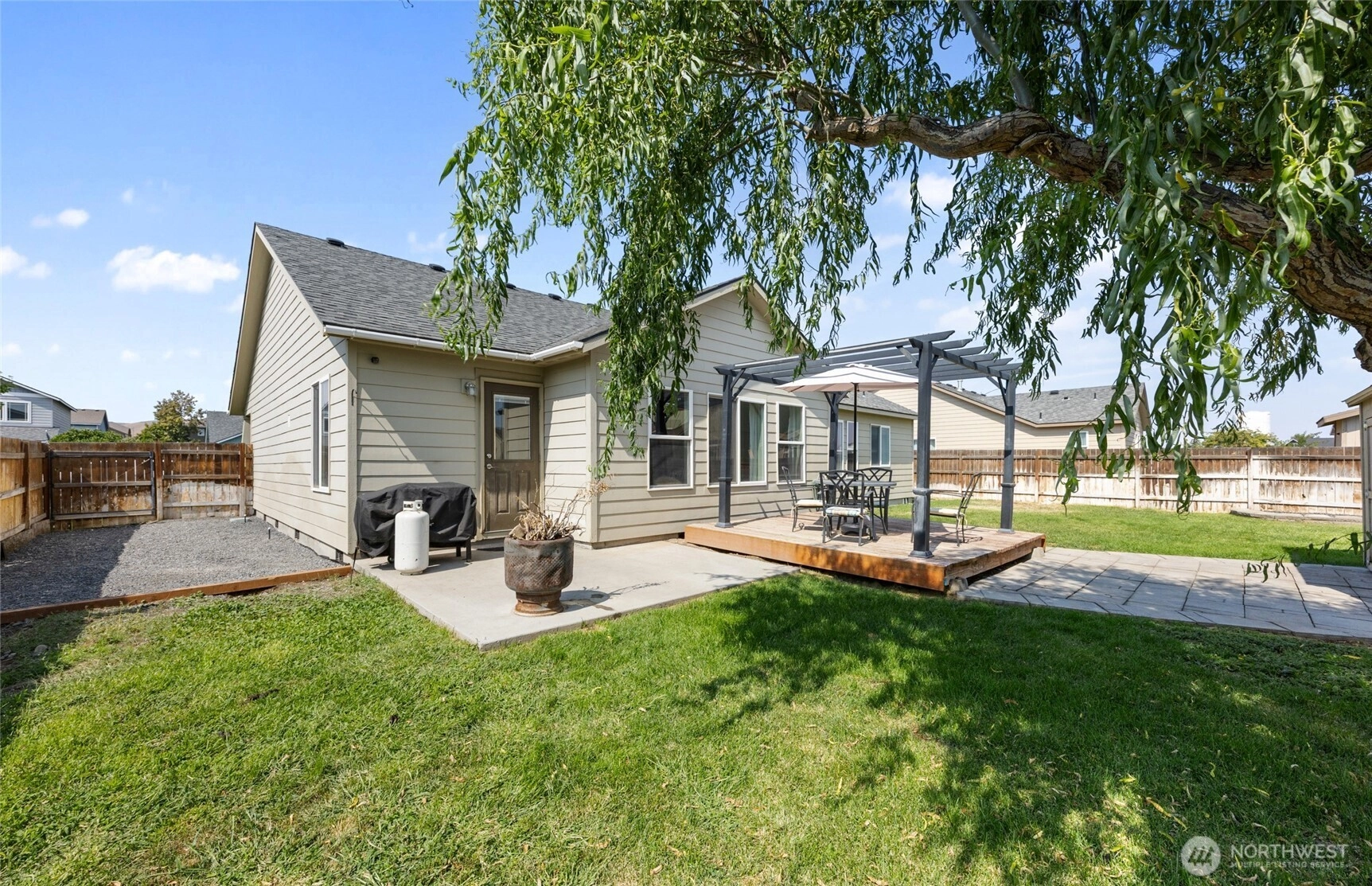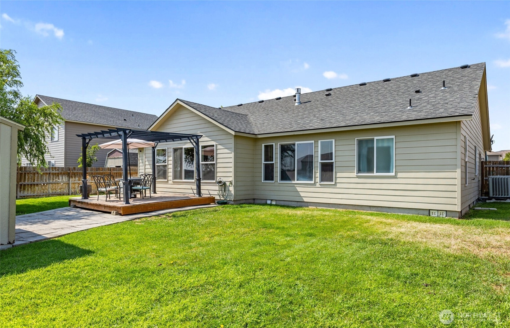 Beautiful Alderbrook built home located in a quiet cul-de-sac. This 3 bed, 2 bath, 1,617 sq. ft. home offers an open-concept layout with a versatile front bedroom/den featuring French doors. The primary suite includes a walk-in closet, dual sinks, soaking tub & separate shower. Kitchen boasts a counter-height eating bar, ample counter space & walk-in pantry. All kitchen appliances included. Exterior features include a fully fenced backyard with shed, large deck with pergola & sunshade and underground sprinklers and RV/boat parking.