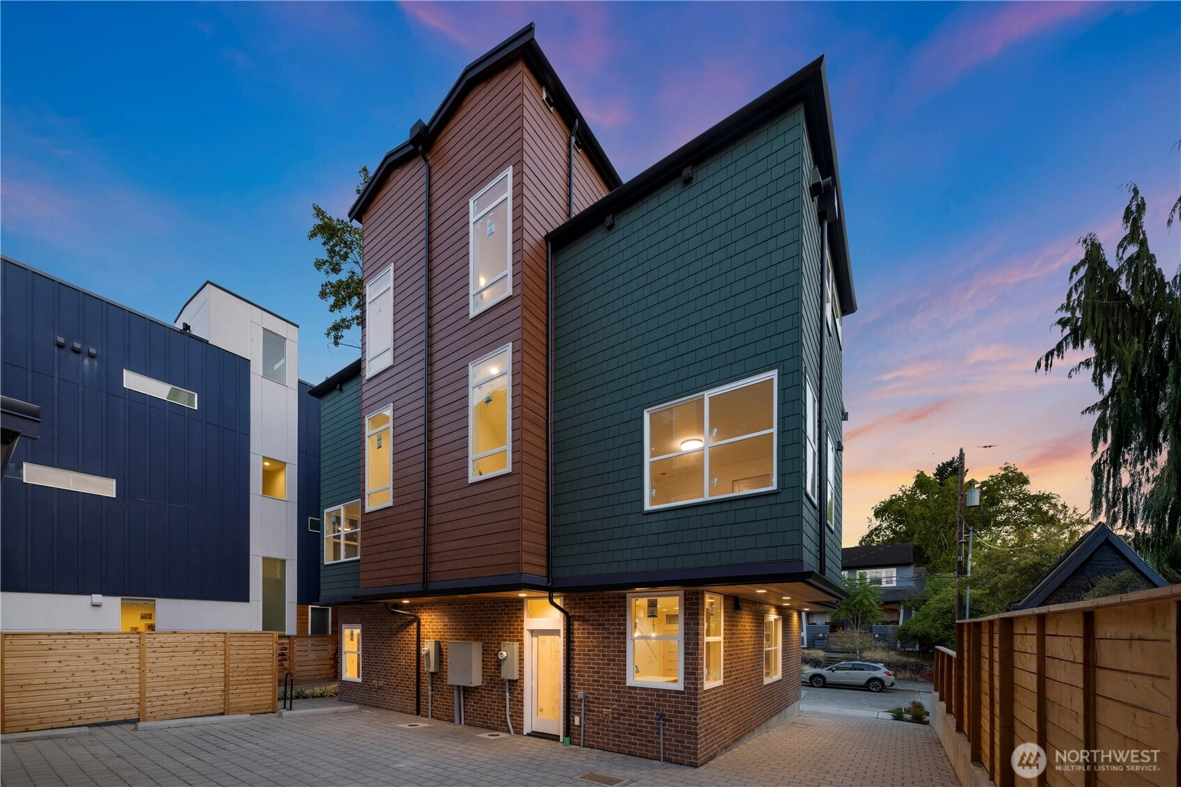 Move-in ready residence by MRN Homes, tucked along one of Wallingford’s most coveted, tree-lined streets— mins to Green Lake, the Zoo, charming cafes & top neighborhood amenities. Rare EV-ready parking space included. Striking green façade paired w/classic brick accents create a rare fusion of craftsmanship & contemporary design. Walls of glass flood the expansive living area & designer-curated kitchen w/exceptional natural light, highlighting the Belmont cabinetry, premium Fisher & Paykel appliances & generous island. Top-floor primary retreat w/spa-caliber bath &grand walk-in closet. Flex space ideal for office/lounge. Lower level features two spacious bedrooms. Fenced back patio! Enjoy an expansive private rooftop deck w/panoramic views!