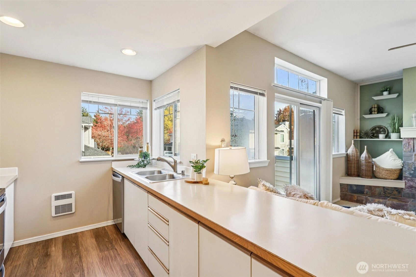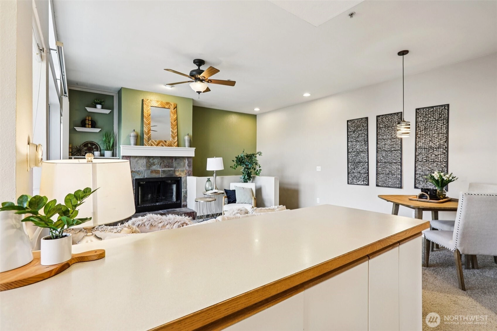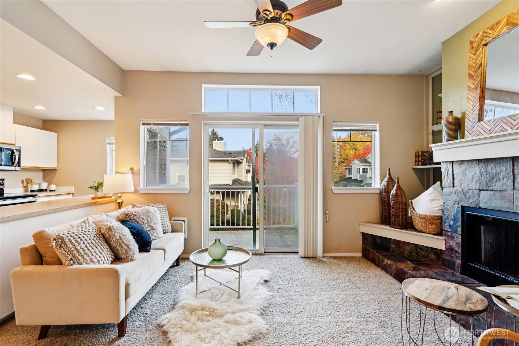 Welcome to Harbor Reach - an exceptional condominium complex at The Lakes. Enjoy a spacious Kitchen w/open living space, designated Dining area, Primary Bed with a large custom California Closet. All appliances stay. Enjoy a cozy wood-burning fireplace, private patio, attached individual garage with extra storage space w/built-in shelving, and nearby visitors' parking. Recently updated with fresh interior paint and new windows. The community features a clubhouse with a kitchen and gathering area, exercise room, hot tub, and sauna. Great location close to Kent Station, Riverbend Golf Complex, and the ShoWare Center. This is a must-see condo!!