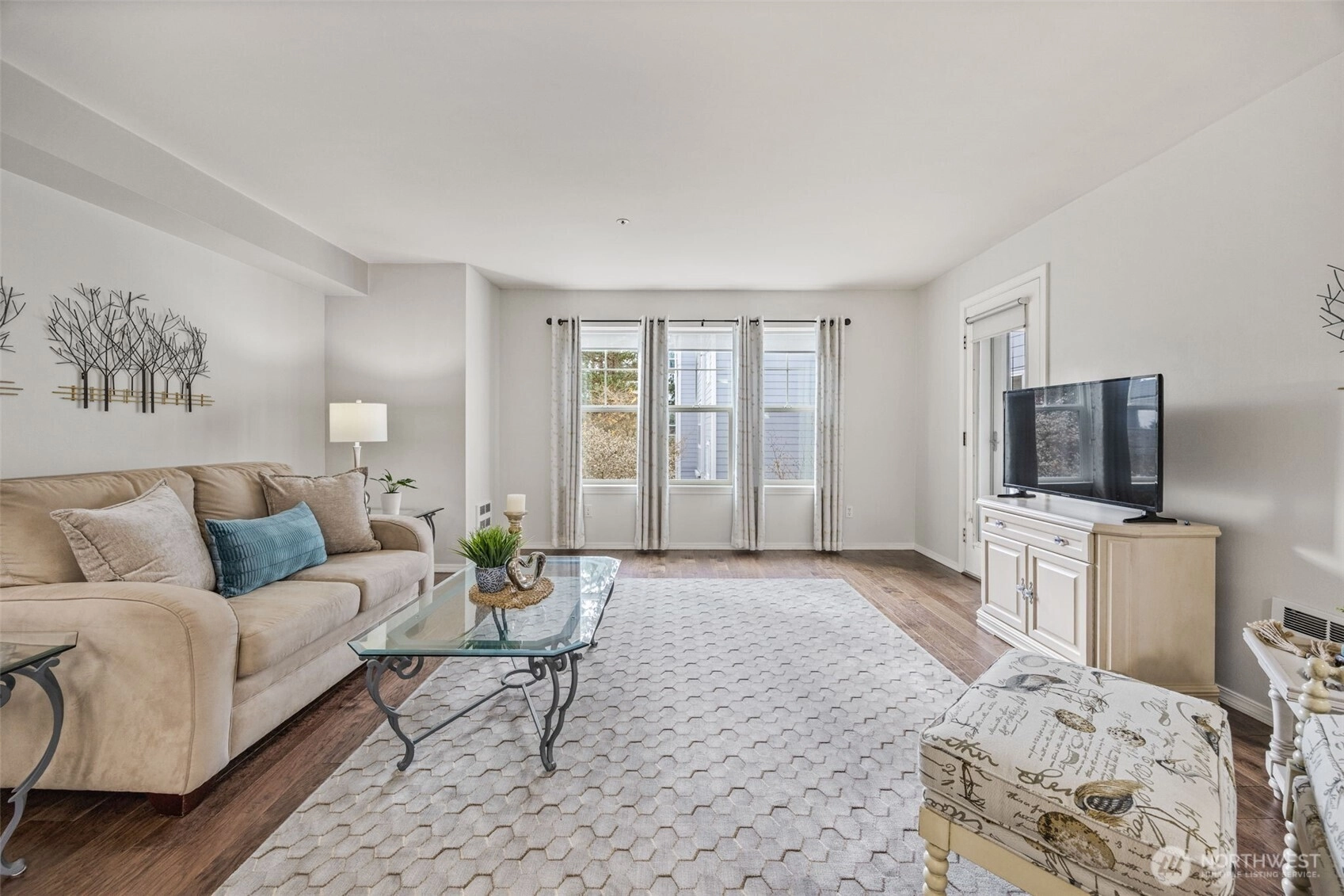Beautifully updated and well-maintained home featuring engineered hardwood floors and an attractive kitchen with stainless steel appliances, quartz counters, subway tile backsplash, under-cabinet lighting, and a breakfast bar. Open floor plan w newer vinyl windows, interior paint, & updated lighting throughout. Enjoy custom closets & sunshades. Updated bath w quartz vanity, vessel sink, & a step-in shower w a new, attractive glass door. Front-load washer and dryer are tucked behind a stylish barn door. Private covered deck overlooking a serene community patio, plus a storage closet & 1-car garage. Set within park-like grounds in the gated 55+ Providence Point community offering resort-style amenities galore & vibrant social opportunities!