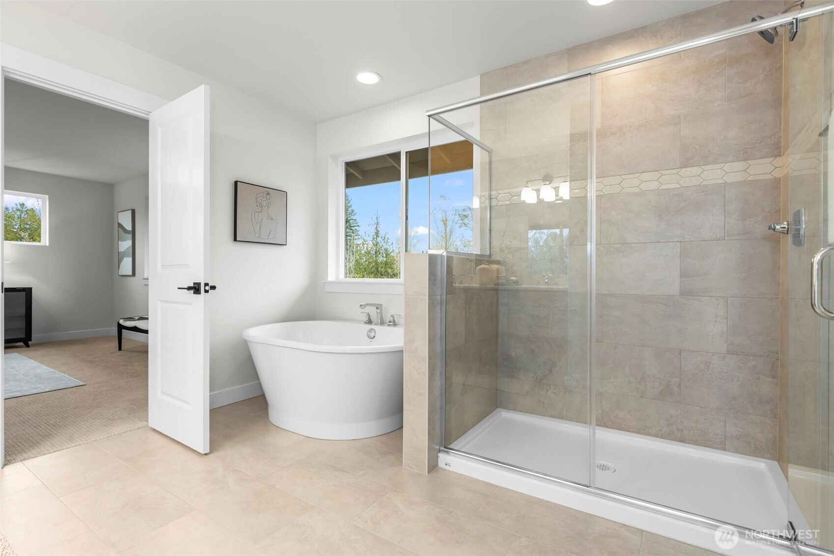 Experience modern Northwest living at its finest in this stunning new construction home tucked away in a peaceful Kent neighborhood. With no home behind, this property offers rare privacy & serene views from your covered patio. Step inside to discover a bright, open-concept floorplan where the kitchen boasts quartz countertops, SS appls & large island perfect for gatherings. Main-level guest rm/den has adjacent 3/4BA. Upstairs, the spacious primary suite includes a spa-like bath w/ dual vanities & soaking tub. 3 addtl bdrms, bonus loft & full bath complete the upper level. Built w/ energy efficiency in mind, this home includes a heat pump for year-round comfort. Easy access to shopping, schools & commuter routes to Seattle & Bellevue.