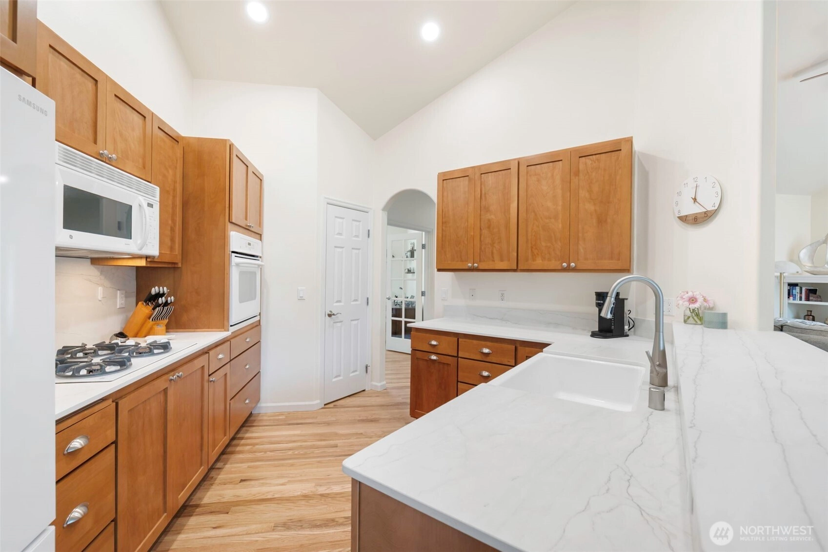 Welcome to Dunraven at McCormick Woods! This beautifully updated rambler sits on a desirable corner lot in the gated Dunraven community. Offering 2 bedrooms plus an office/den with lovely french doors, this home features easy single-level living with timeless style. Enjoy newly installed hardwood floors throughout, a gas fireplace, and vaulted ceilings in the living room that create a spacious, inviting feel. The cook’s kitchen shines with new countertops, quality cabinetry, and an open layout perfect for entertaining. Experience the best of McCormick Woods living—golf, trails, and a vibrant community atmosphere with new retail shopping and eateries coming soon to McCormick Village!