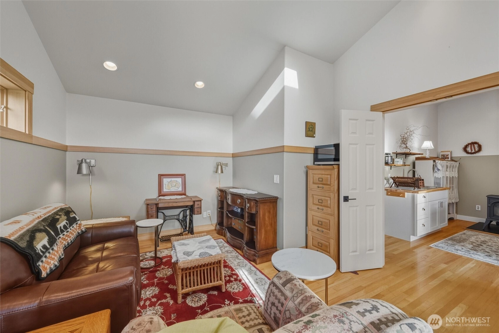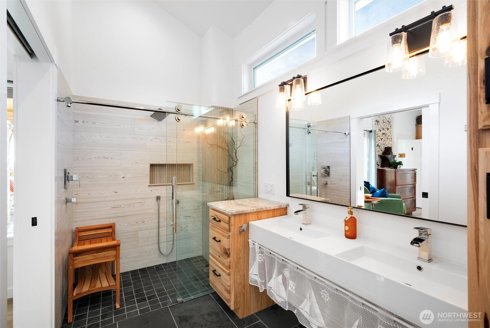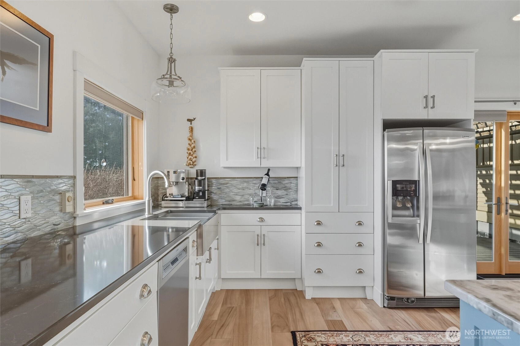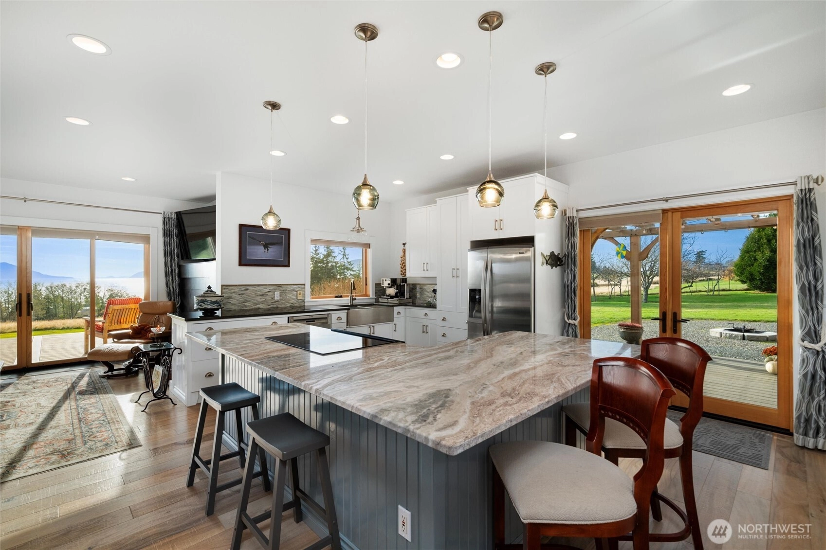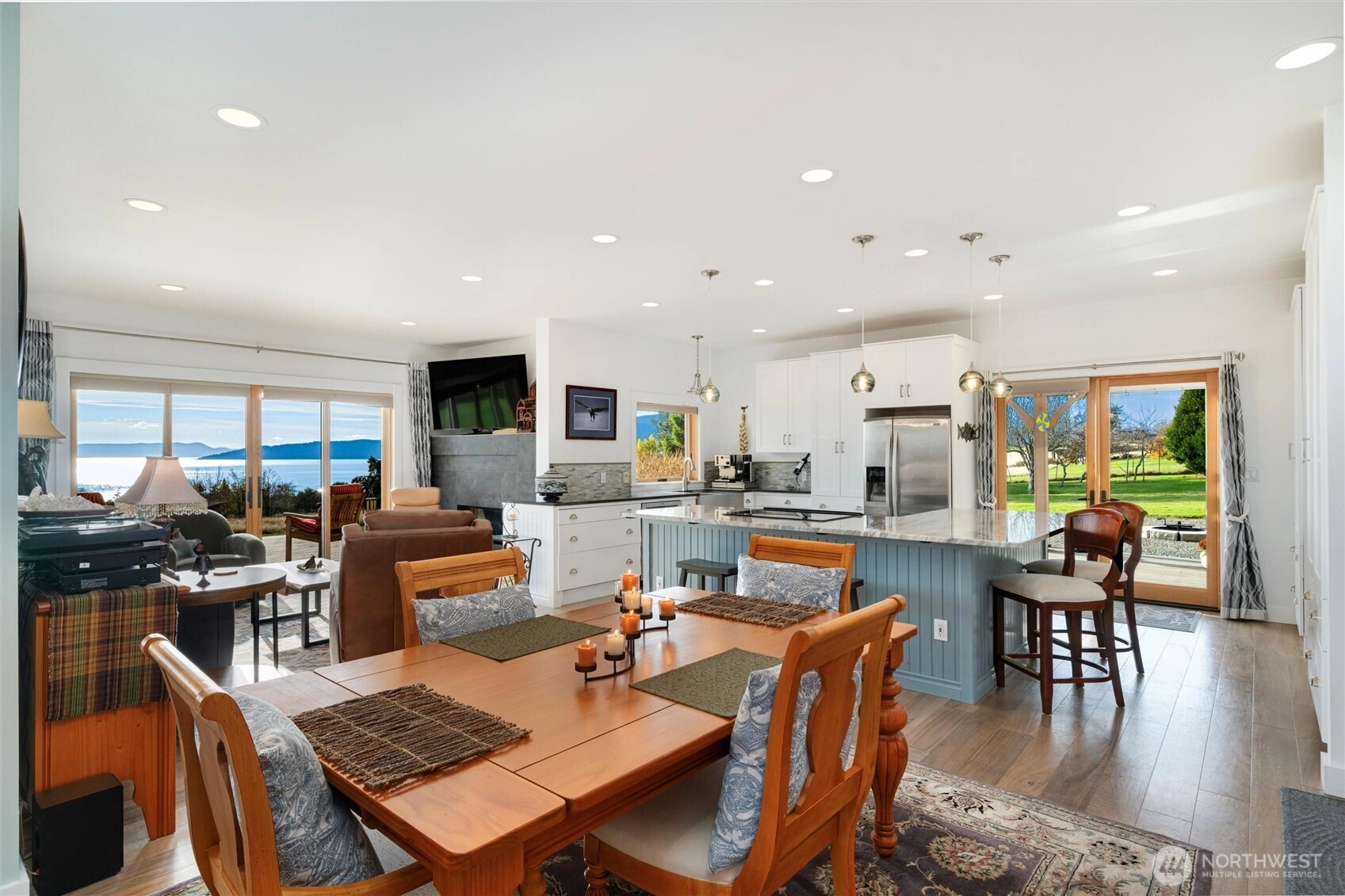A tranquil, sun-filled, & highly sought-after location, this private 3.2-acre property captures the wild beauty overlooking the San Juan Islands and sweeping views of the Strait of Georgia. The main home offers easy living w/ a peaceful primary suite, harmonious indoor–outdoor flow, & a large garage ideal for storage, projects, or gear. Upstairs, a flexible second suite; w/bedroom, bath, living room,& multi-use kitchen provides excellent private apartment potential via optional exterior access. The beautifully maintained cottage features reclaimed barn beams, window seat, soaking tub, cozy fireplace, Pella windows, french door, JennAir range, Bosch dishwasher, attached laundry, shop, & patio, while the grounds include multiple outbuildings.
