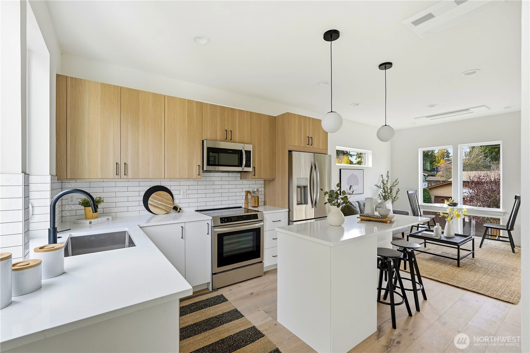 Thoughtfully crafted townhome by Upper Left Living, a trusted West Seattle builder known for quality and detail. Enjoy real wood floors, tile baths, and modern finishes that create a warm, welcoming vibe. Well-separated bedrooms offer comfort and privacy, and the luxe primary suite features a custom-tiled shower with glass door. The spacious kitchen boasts locally made Belmont cabinets, quartz counters, prep island with seating, induction range, stainless appliances, and under-cabinet lighting. Efficient heating and AC, a fully fenced yard, EV-ready parking, and a prime West Seattle location near parks, trails, Westwood Village shops & dining, Myrtle Reservoir Park, Lincoln Park, 35th Ave SW, the bridge, downtown, and transit.