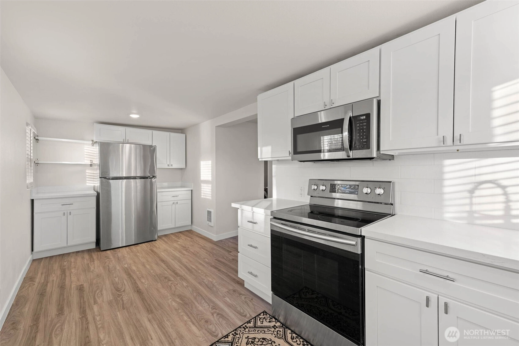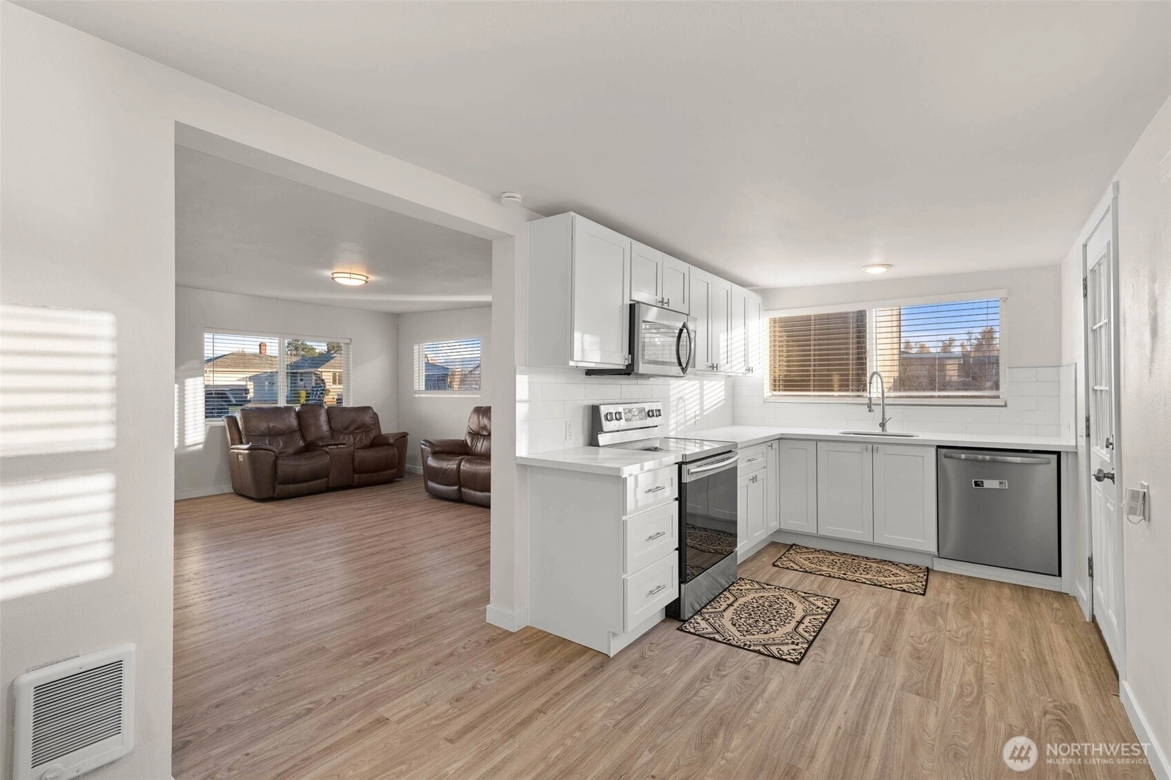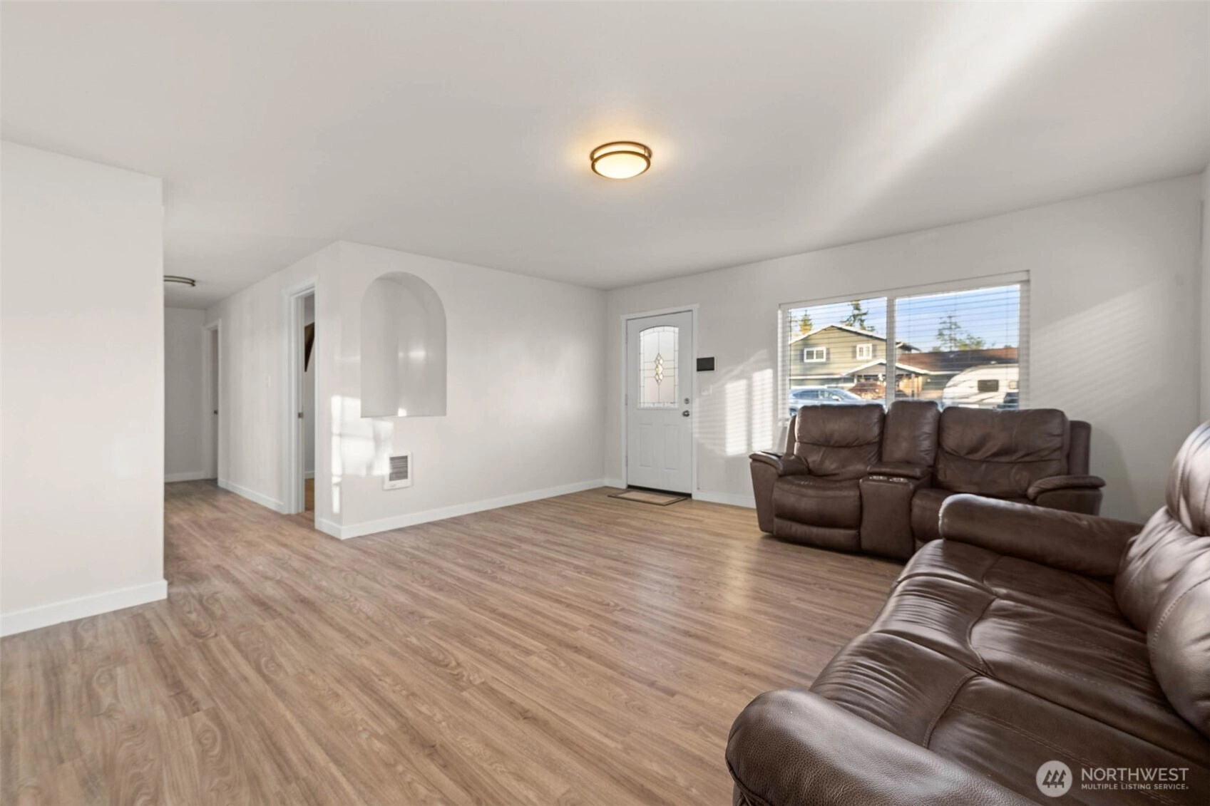 Don't miss this beautifully updated, move-in-ready rambler situated on a spacious lot with mountain views in Orting! Recent updates include fresh paint inside and out, new laminate flooring, updated kitchen cabinets, quartz countertops throughout, a stylish backsplash, and a remodeled bathroom. Additional improvements feature new windows, a sliding glass door, new recessed lighting, a security system, and updated appliances. The large Tuff shed, just two years old and with garage access, provides extra storage for all your toys, along with gated RV storage. This charming home feels expansive with three generously sized bedrooms, an eat-in kitchen, and nearly 1/3 acre of land. You’ll love enjoying the vast yard on warm summer days.