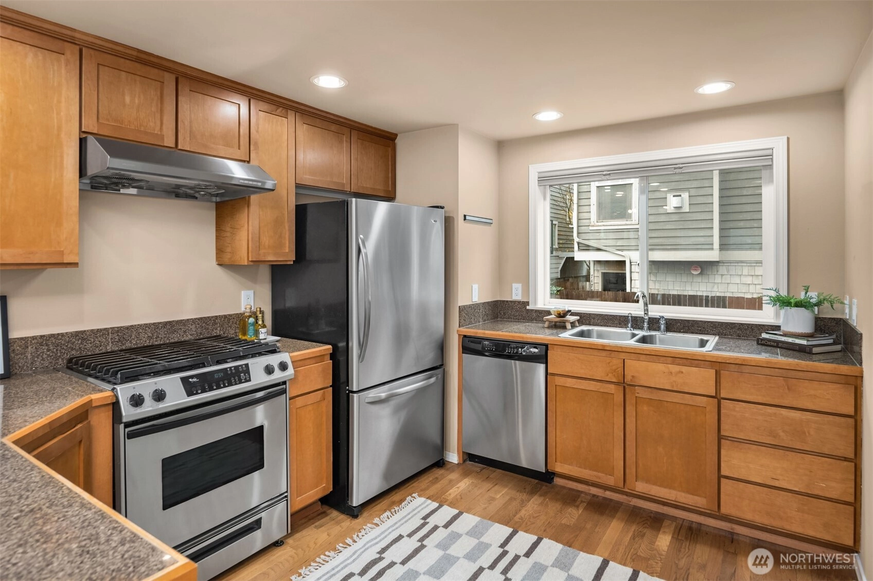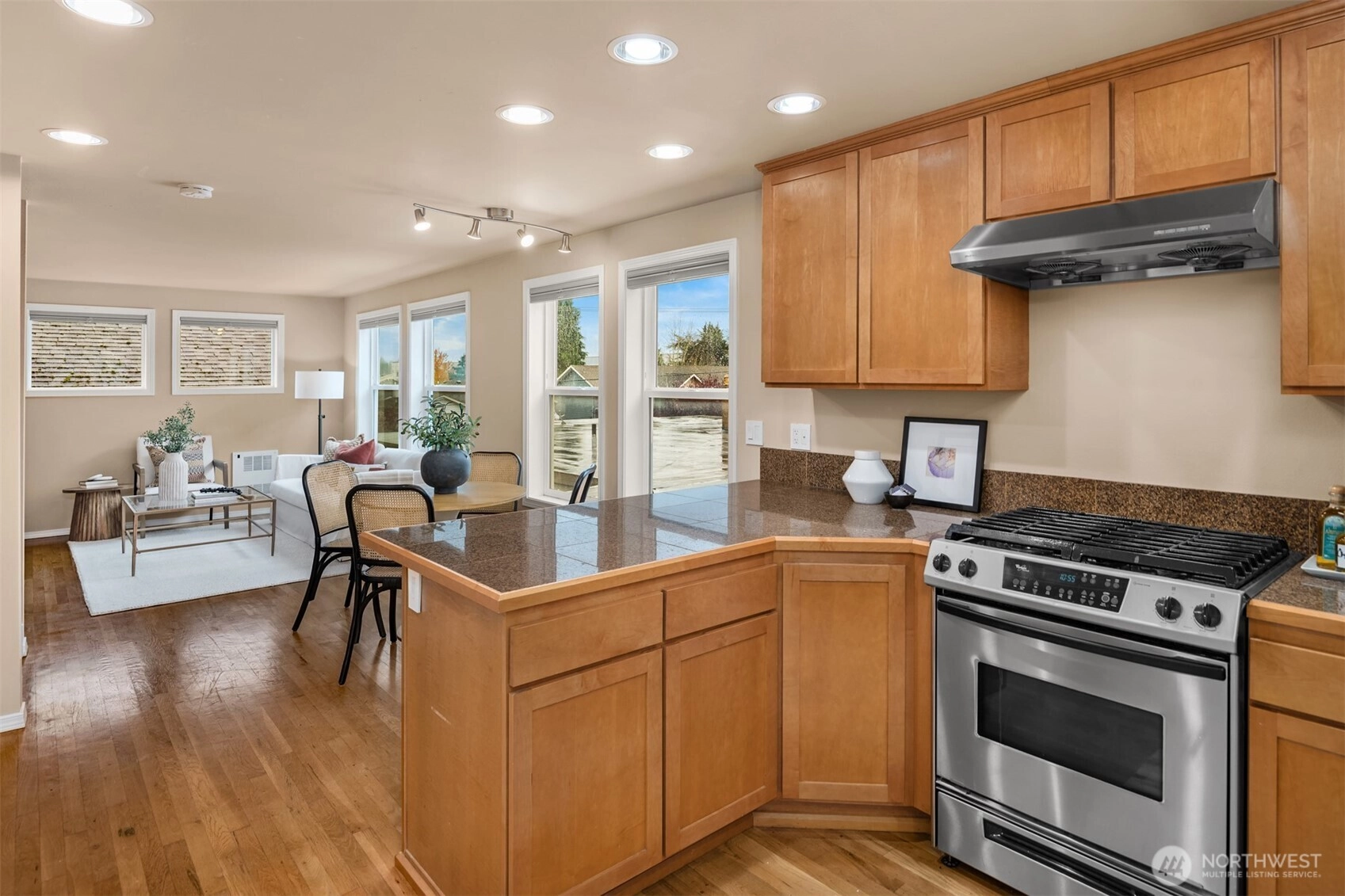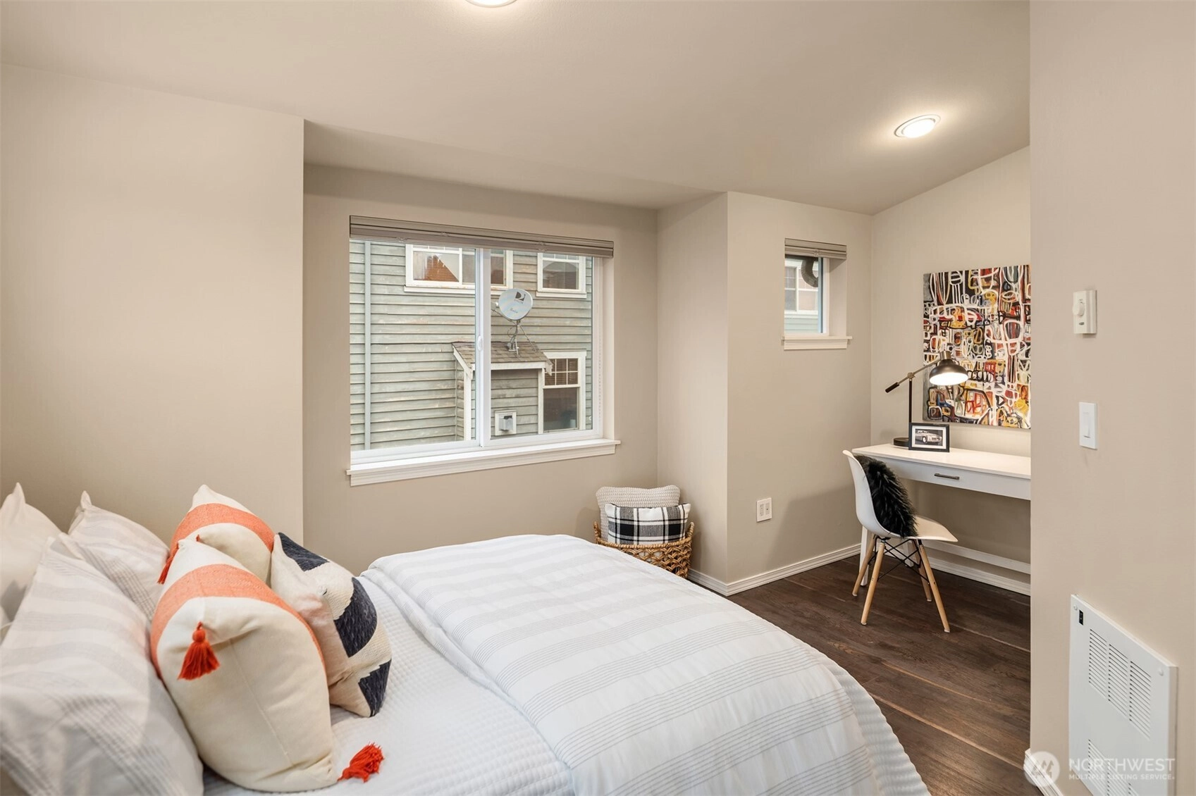 Discover this Craftsman-style end-unit townhome located in Greenwood offering 3 bedrooms & 2.25 bathrooms across 1,230 sq ft. Features include a sizeable kitchen with granite countertops, gas range & stainless steel appliances. An abundance of natural light throughout home with natural hardwood floors on the main level, cozy living area with a gas fireplace & mini-split A/C for comfort. Entry level includes bedroom & attached 3/4 bath. Upper level features large primary bedroom & generous sized guest bedroom & full bath. Attached garage w/ extra parking in front of unit, fenced backyard with patio, & freshly painted interiors add to its appeal. No HOA. Located near Green Lake & local restaurants. A perfect blend of style and functionality!