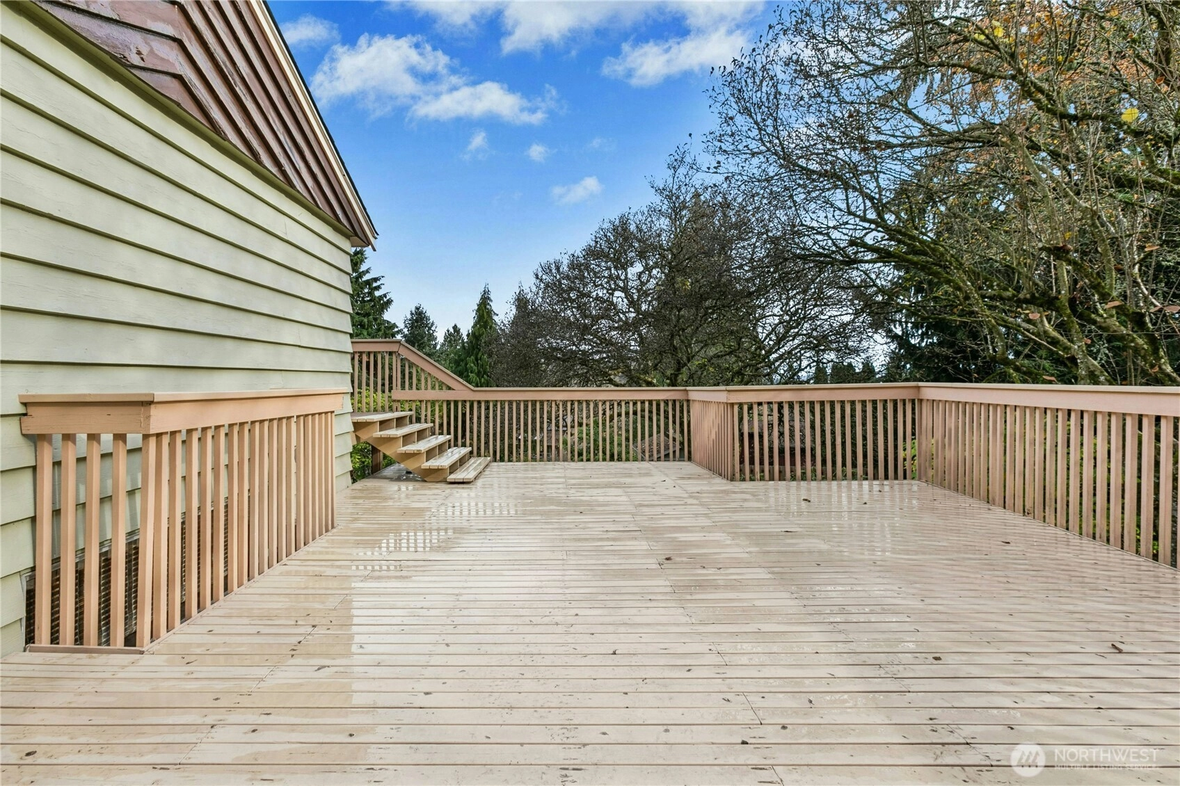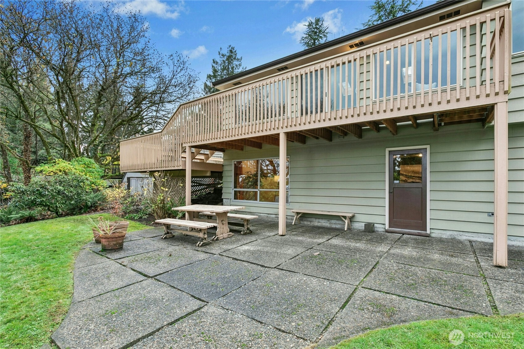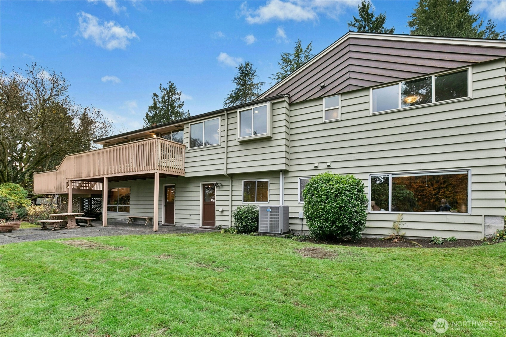 Mid-century character shines in this well-maintained 4BD/2.75BA, 2,170 sq ft home. Updated in 1987 with vaulted ceilings, an expanded kitchen layout, and natural light through skylights. Move-in ready with excellent potential for buyers planning to personalize the kitchen or reimagine the lower level. Enjoy a large entertainment deck overlooking native landscaping, a terraced backyard, and glimpses of mountain views from the yard. The quiet, wooded setting offers privacy and space for gardening and gatherings. Lower level features a separate entry for guests or flexible use. Additional highlights include extensive built-ins, a 10x16 shed, and a sprinkler system, and a security system. 5 min from Town Center, Grace Cole Park. No HOA.