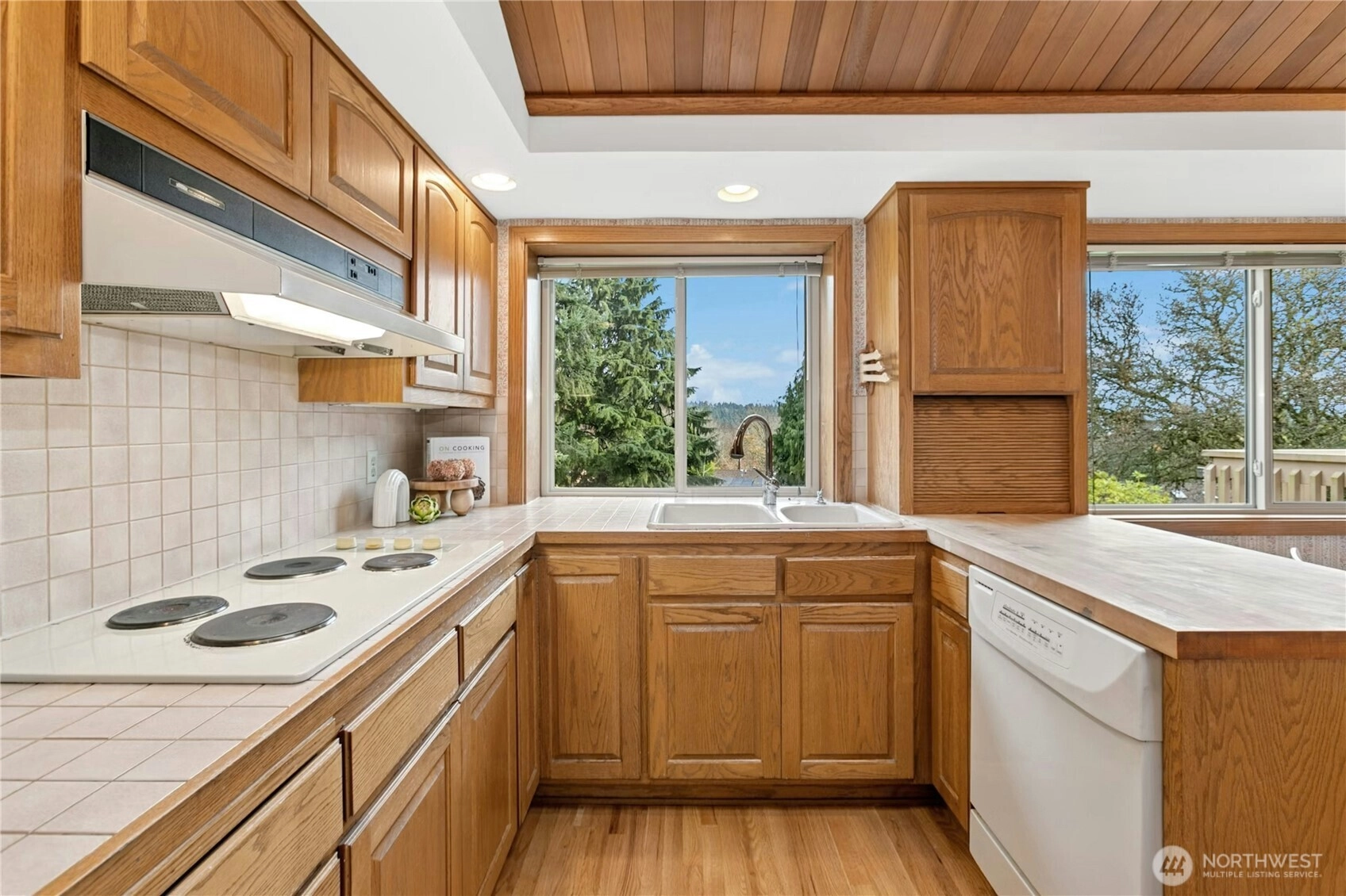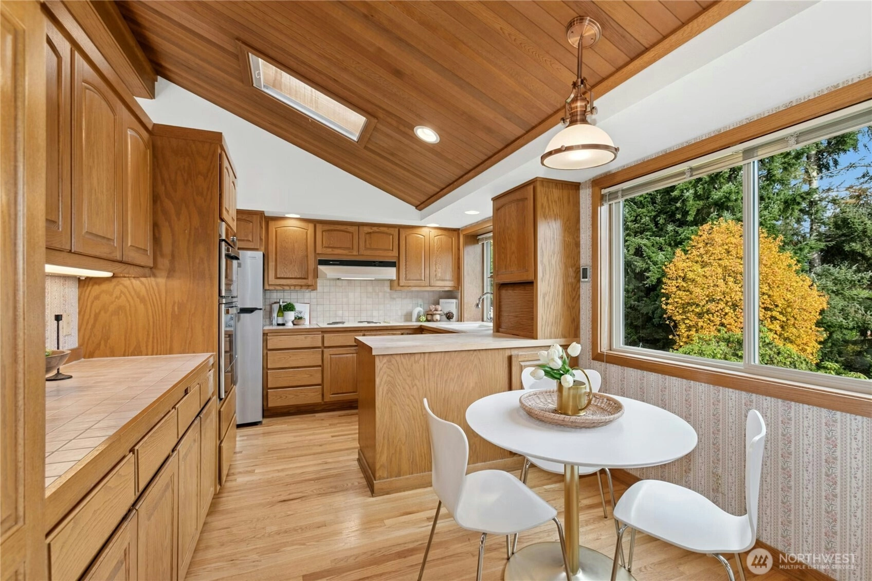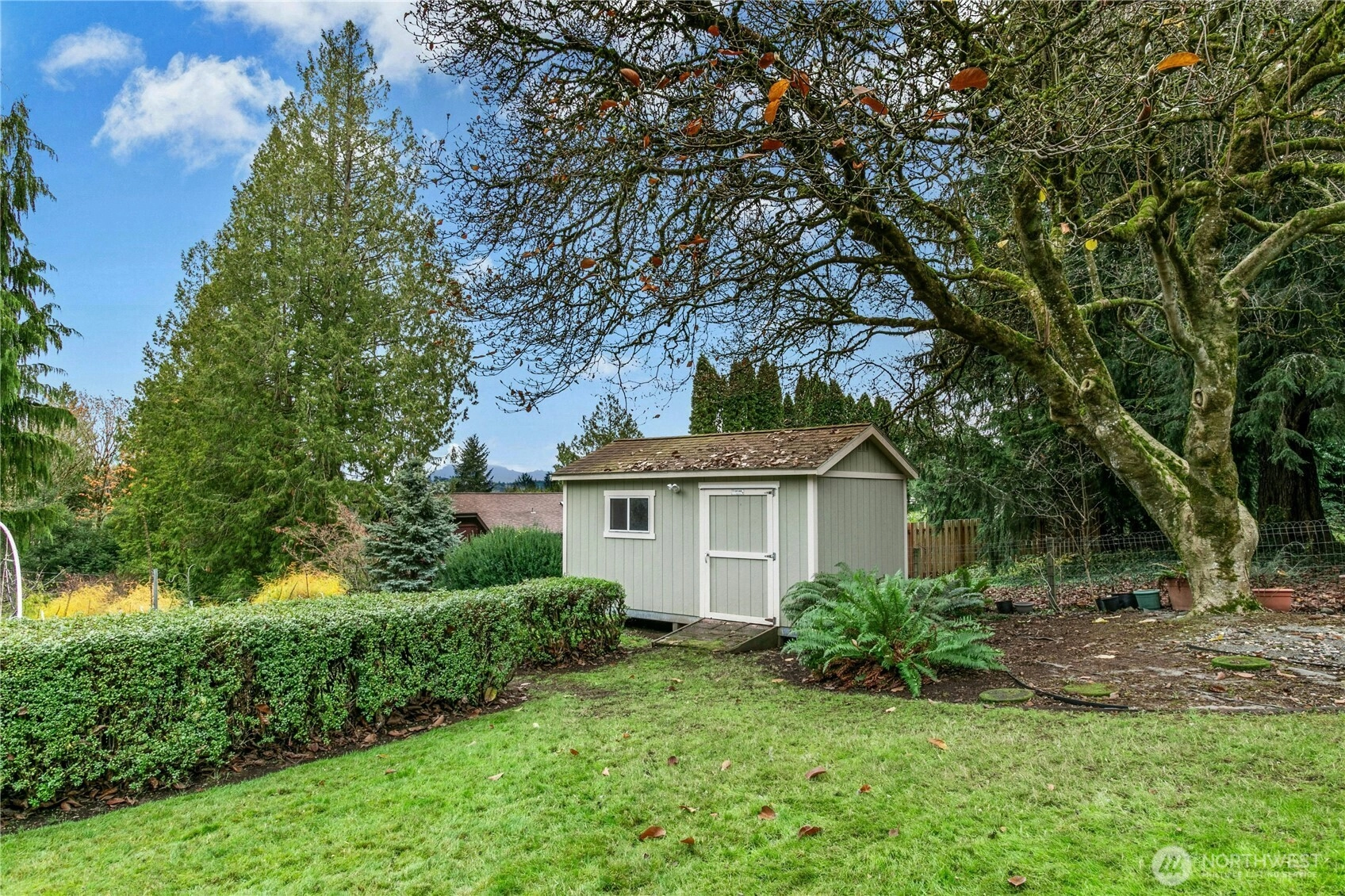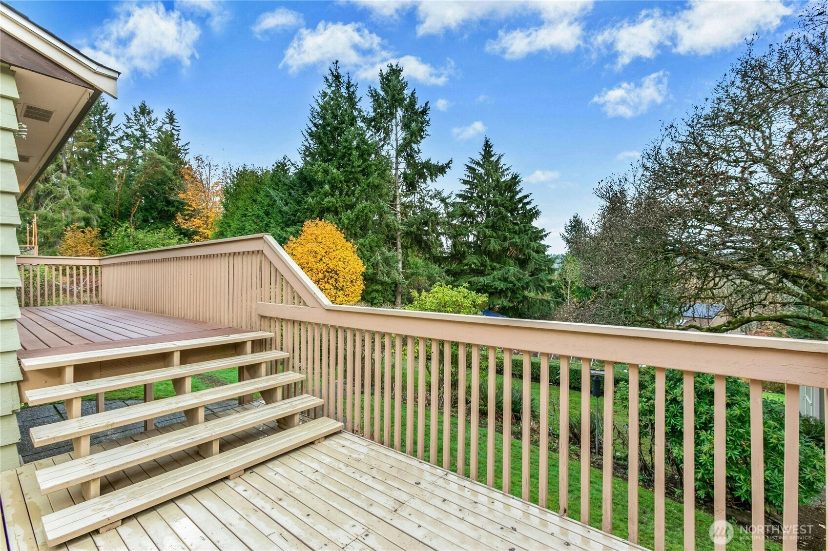 Mid-century character shines in this well-maintained 4BD/2.75BA, 2,170 sq ft home. Updated in 1987 with vaulted ceilings, an expanded kitchen layout, and natural light through skylights. Move-in ready with excellent potential for buyers planning to personalize the kitchen or reimagine the lower level. Enjoy a large entertainment deck overlooking native landscaping, a terraced backyard, and glimpses of mountain views from the yard. The quiet, wooded setting offers privacy and space for gardening and gatherings. Lower level features a separate entry for guests or flexible use. Additional highlights include extensive built-ins, a 10x16 shed, and a sprinkler system, and a security system. 5 min from Town Center, Grace Cole Park. No HOA.