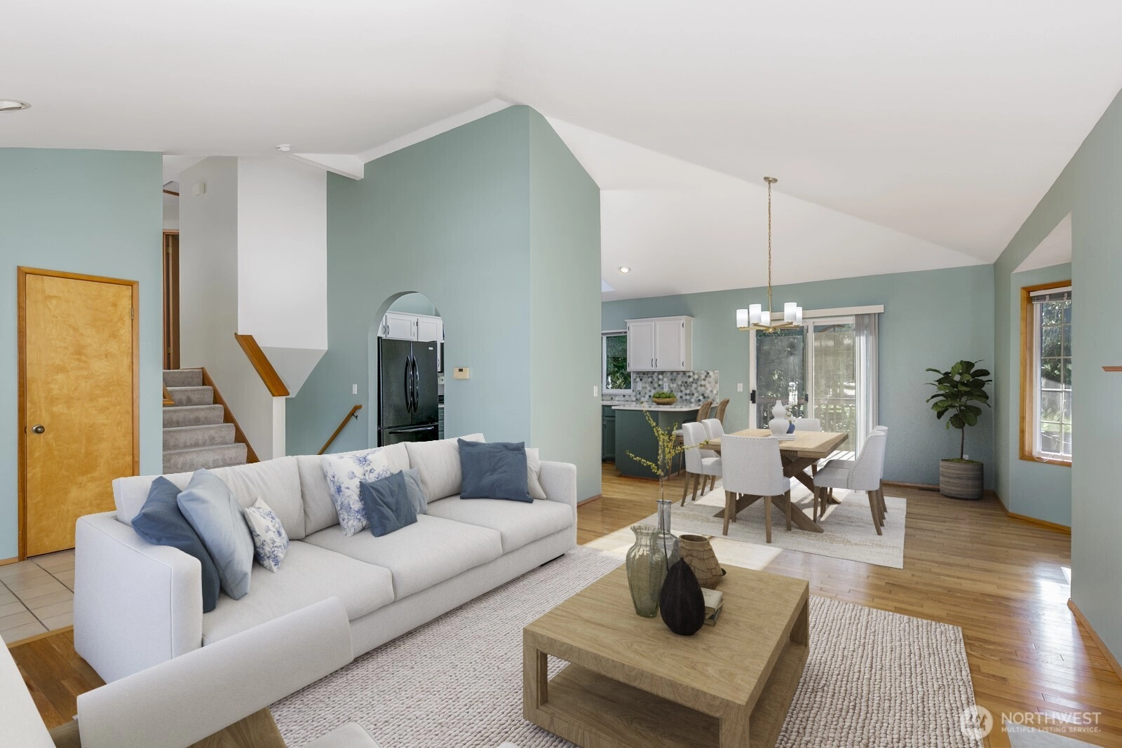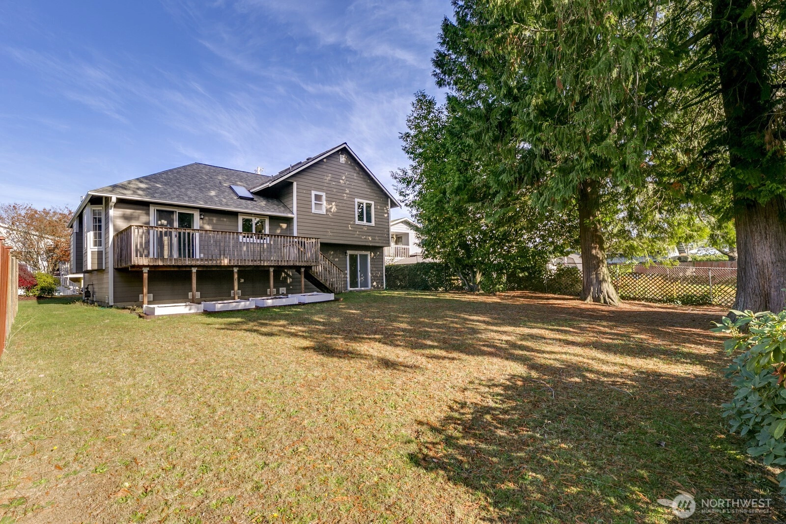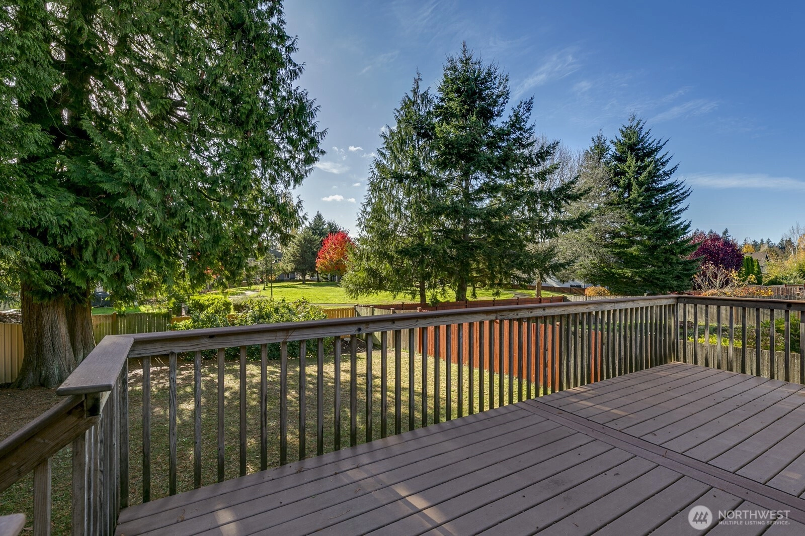 Step inside and be greeted by hardwood floors, vaulted ceilings and living room equipped with a gas fireplace and bay window. Dining room is open to kitchen with eating bar. The heart of the home is the updated kitchen, featuring luxurious quartz countertops including a premium gas range. Whether you're a culinary enthusiast or simply love gathering with friends and family, the open kitchen, dining and living room promises to be a hub for gatherings. Primary bedroom is complete with full bath and walk in closet. Updates include new carpet, lighting, fresh interior and exterior paint. Enjoy your morning coffee or have a BBQ on the Trex deck overlooking the level backyard perfect for play or gardening and backs up to a picturesque park.