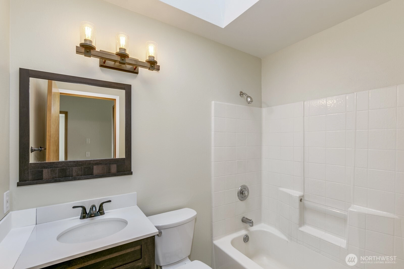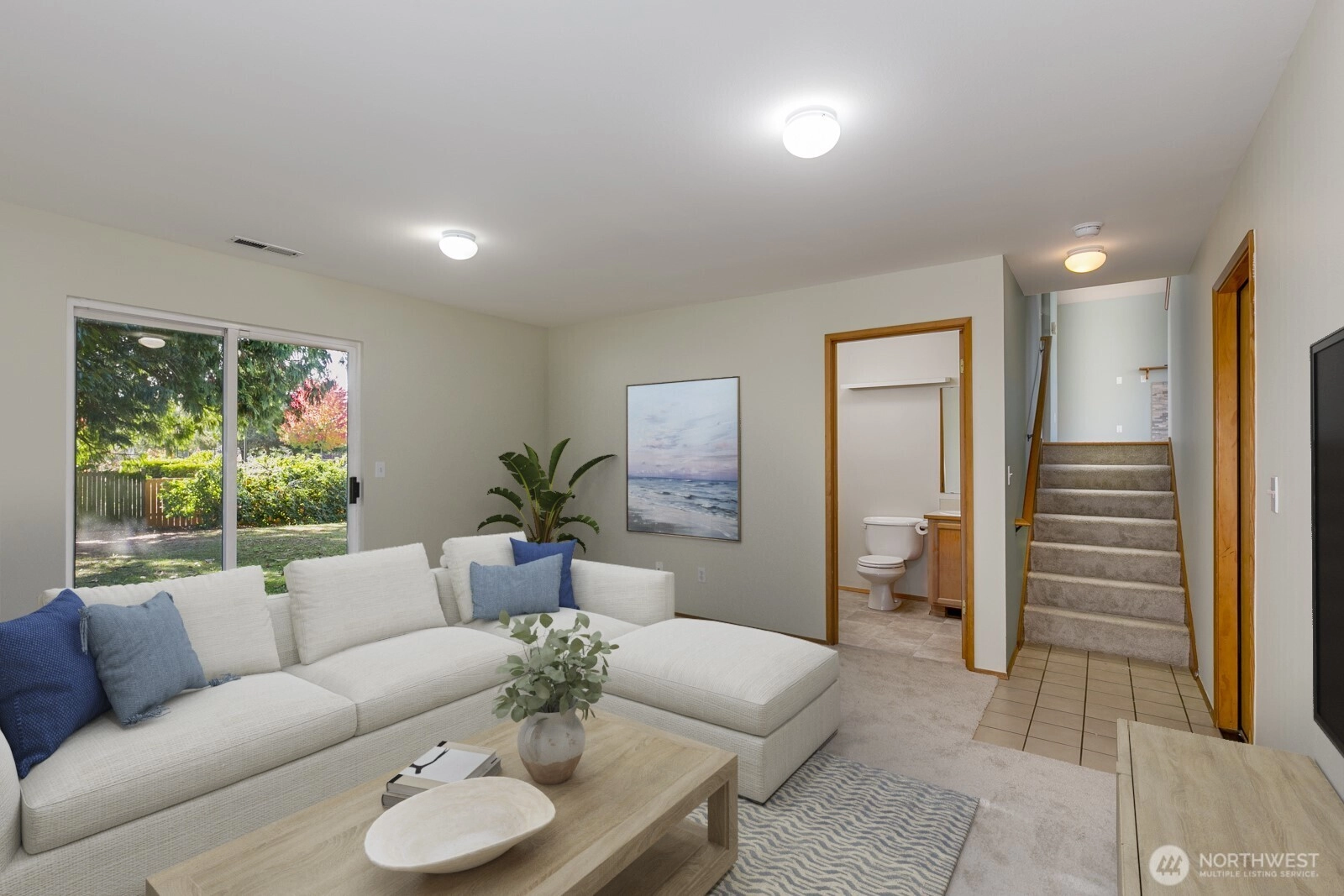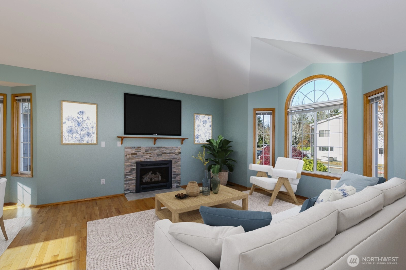 Step inside and be greeted by hardwood floors, vaulted ceilings and living room equipped with a gas fireplace and bay window. Dining room is open to kitchen with eating bar. The heart of the home is the updated kitchen, featuring luxurious quartz countertops including a premium gas range. Whether you're a culinary enthusiast or simply love gathering with friends and family, the open kitchen, dining and living room promises to be a hub for gatherings. Primary bedroom is complete with full bath and walk in closet. Updates include new carpet, lighting, fresh interior and exterior paint. Enjoy your morning coffee or have a BBQ on the Trex deck overlooking the level backyard perfect for play or gardening and backs up to a picturesque park.