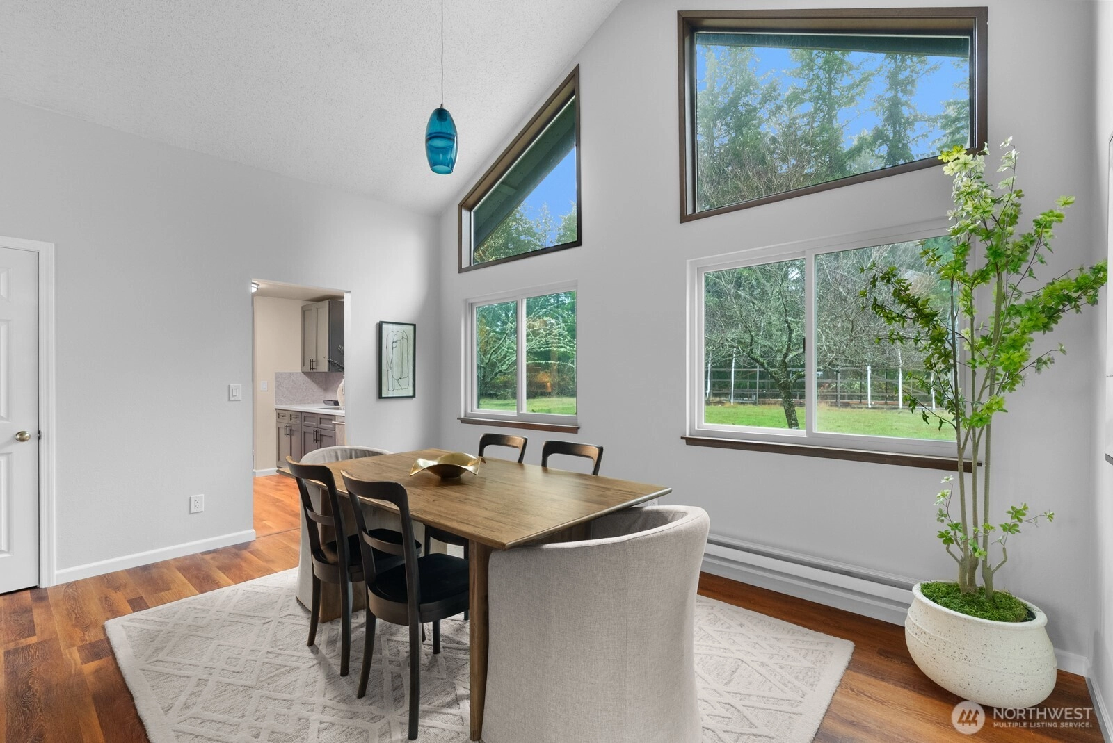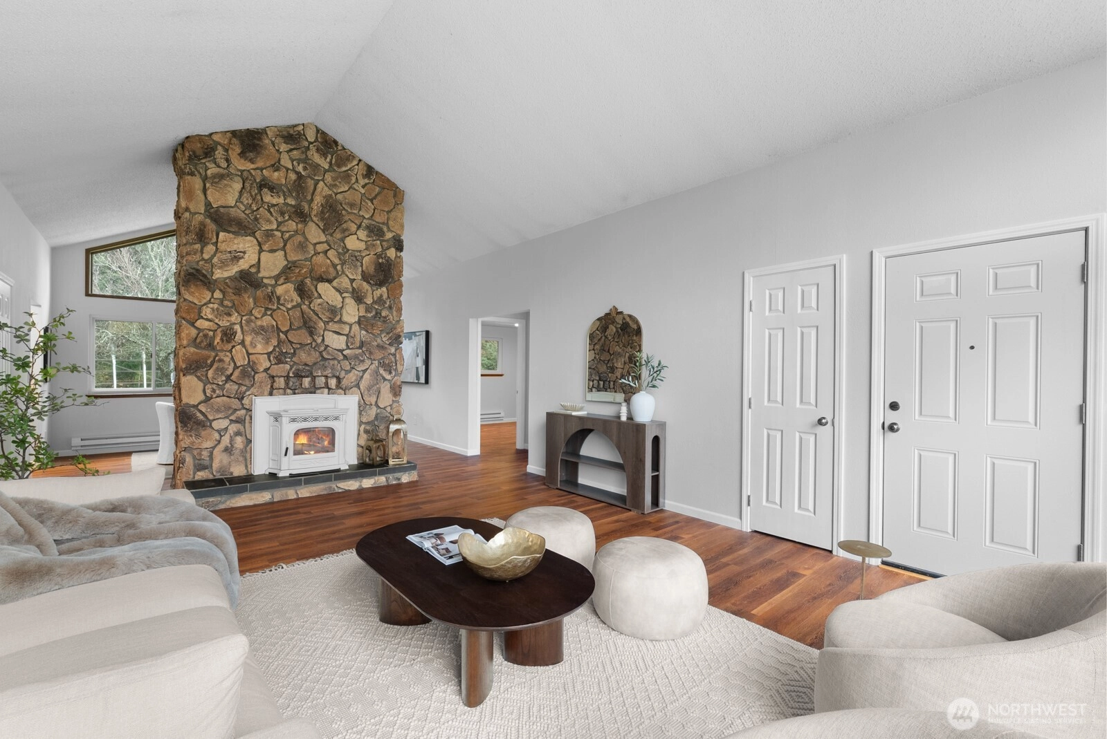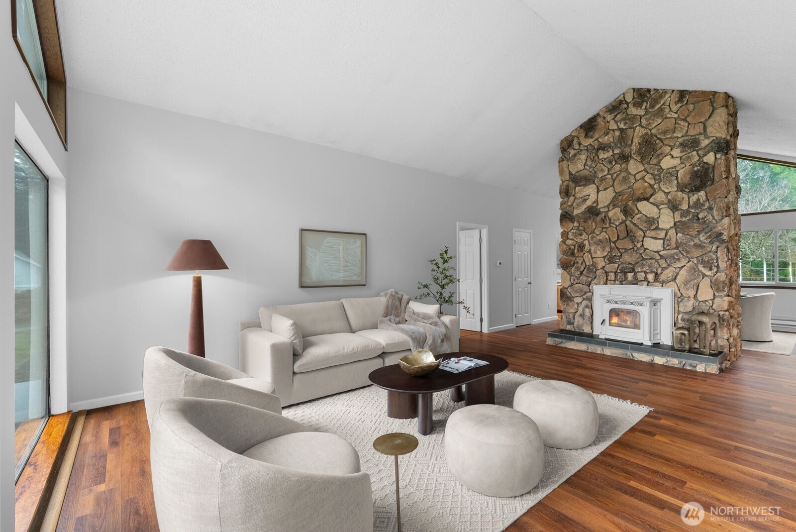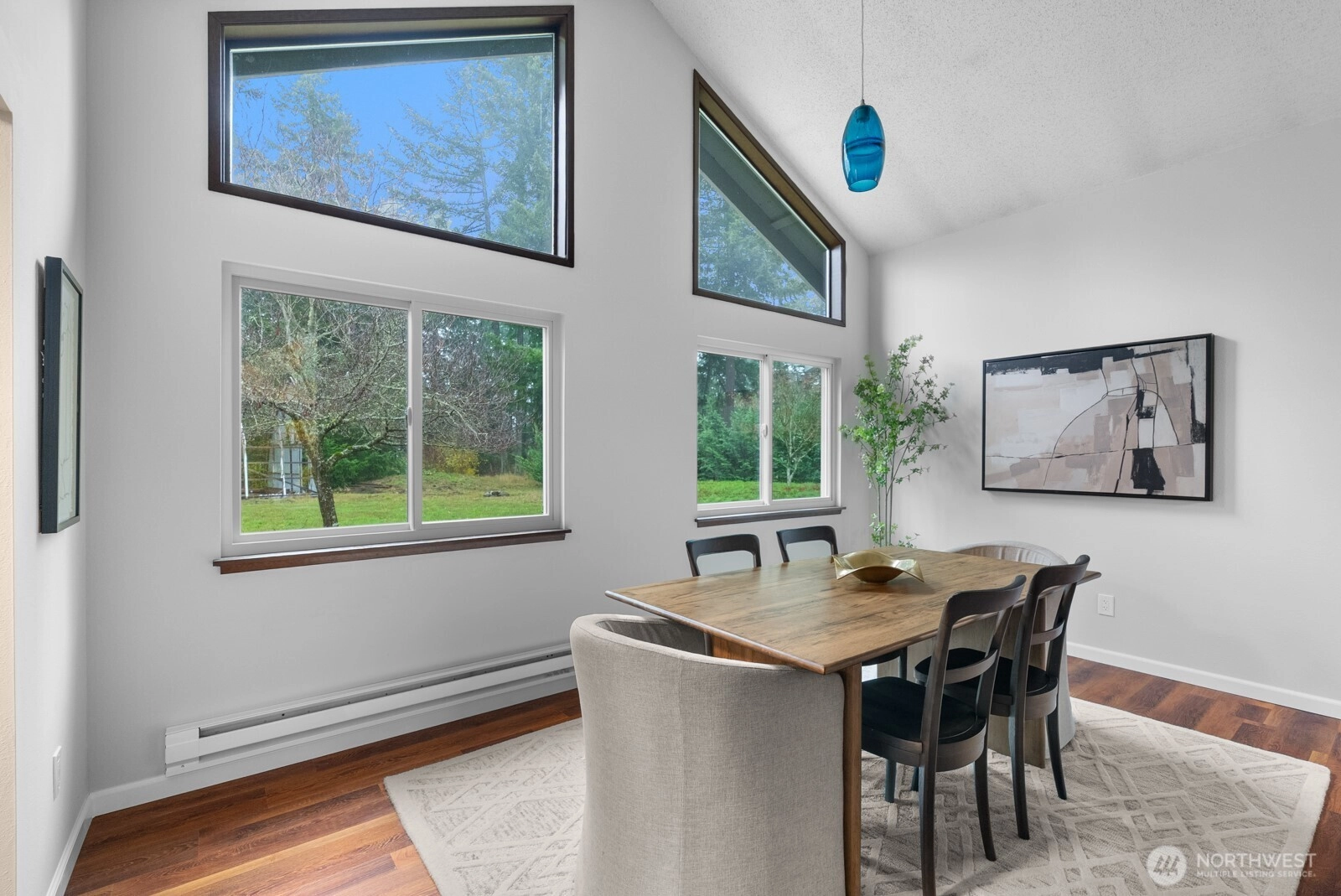 Discover this inviting 3-bedroom, 1.75-bath Mid-Century Modern home tucked away on just over an acre in Tenino! Thoughtful architectural details shine throughout, including vaulted ceilings and expansive living-room windows that fill the space with natural light! Enjoy two pellet fireplaces—one in the additional living room and one connecting the living and dining areas—perfect for warmth and ambiance. A fully wired generator system is already in place, ensuring power is always available! Home also features an updated kitchen, new LVP flooring throughout, updated bathrooms and a spacious garage/workshop ideal for projects or extra storage. Peaceful setting with room to breathe, yet close to town conveniences. A must-see sanctuary!