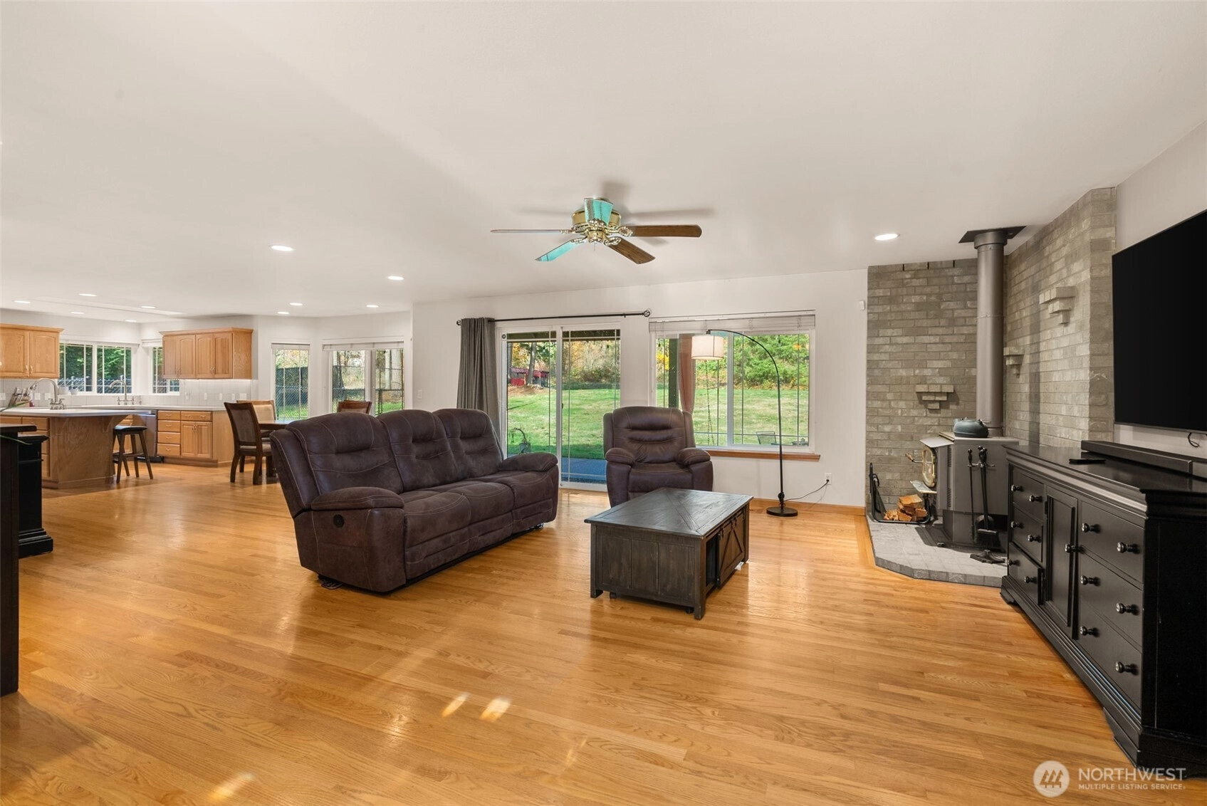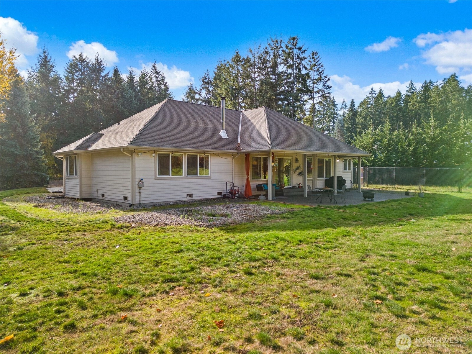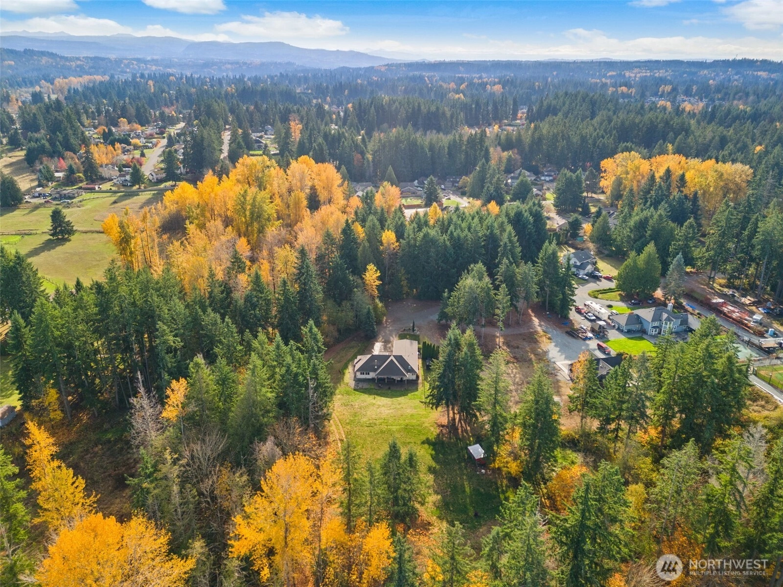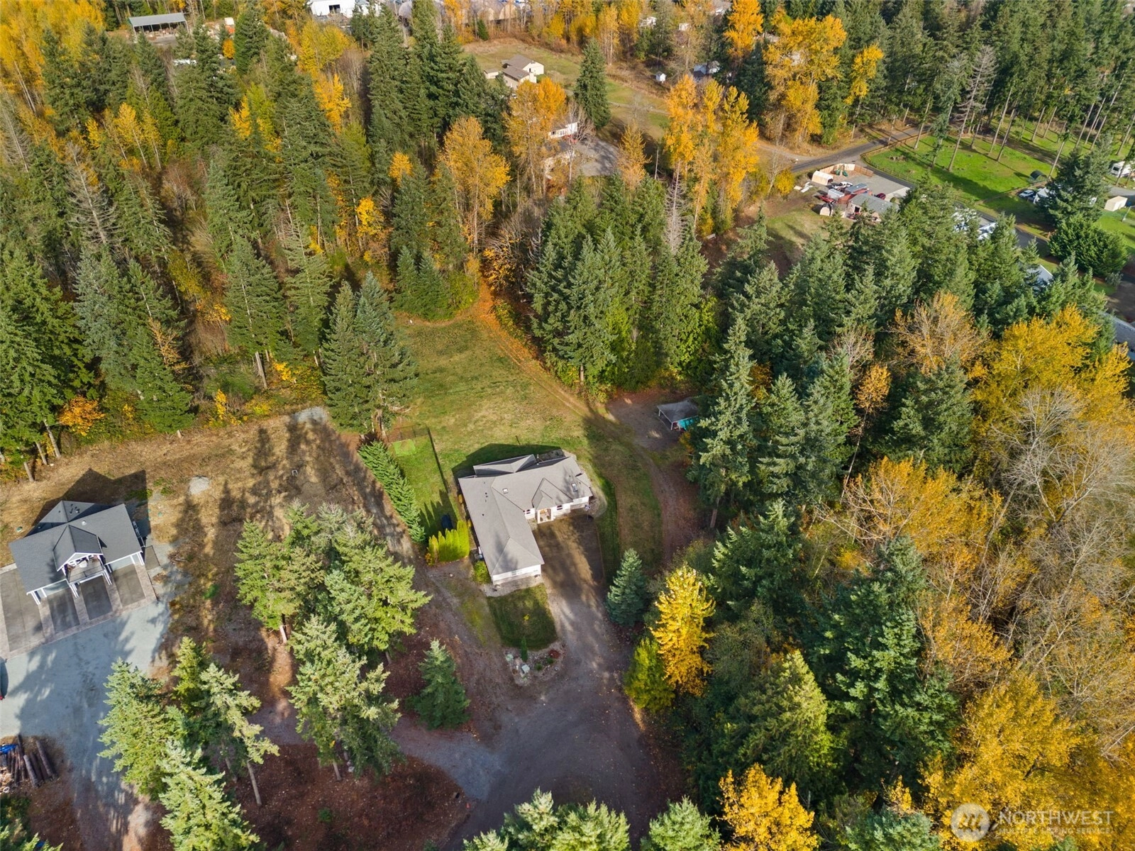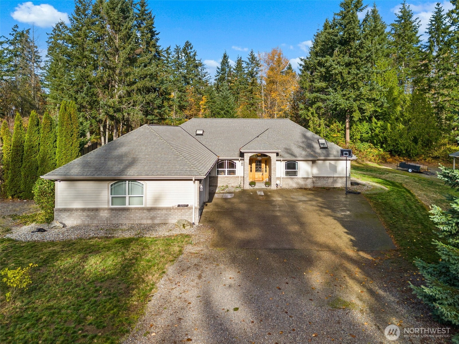 Escape to this private retreat on over 4 acres w/ this well-maintained rambler offering 3 bedrooms, 2 baths, and TWO versatile offices/flex rooms—ideal for remote work or hobbies. Enjoy spacious single-level living w/ a wide-open great room, hardwood floors, & a cozy wood-burning stove framed by large windows overlooking serene wooded surroundings. The kitchen features a large island, solid cabinetry, & newer appliances. The primary suite includes a spa-style bath w/ tiled walk-in shower, jetted tub, dual vanities, & a generous walk-in closet. Outdoors, enjoy the covered patio, large dog run, usable acreage, detached outbuilding, & room for gardens, animals, or a future shop. Bonus: direct back-road access to Bonney Lake with total privacy.