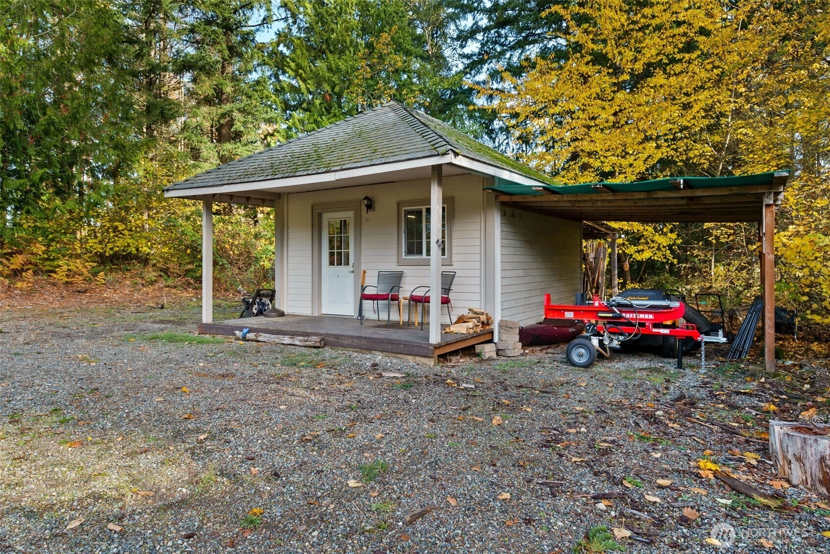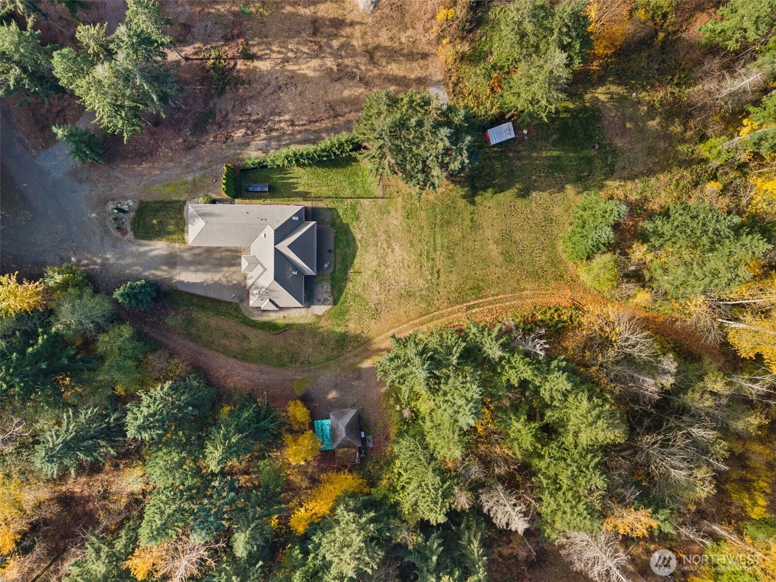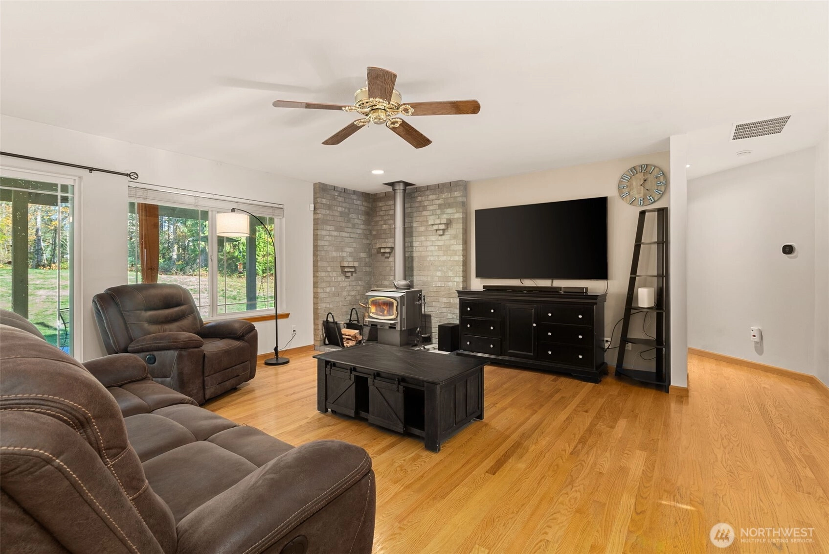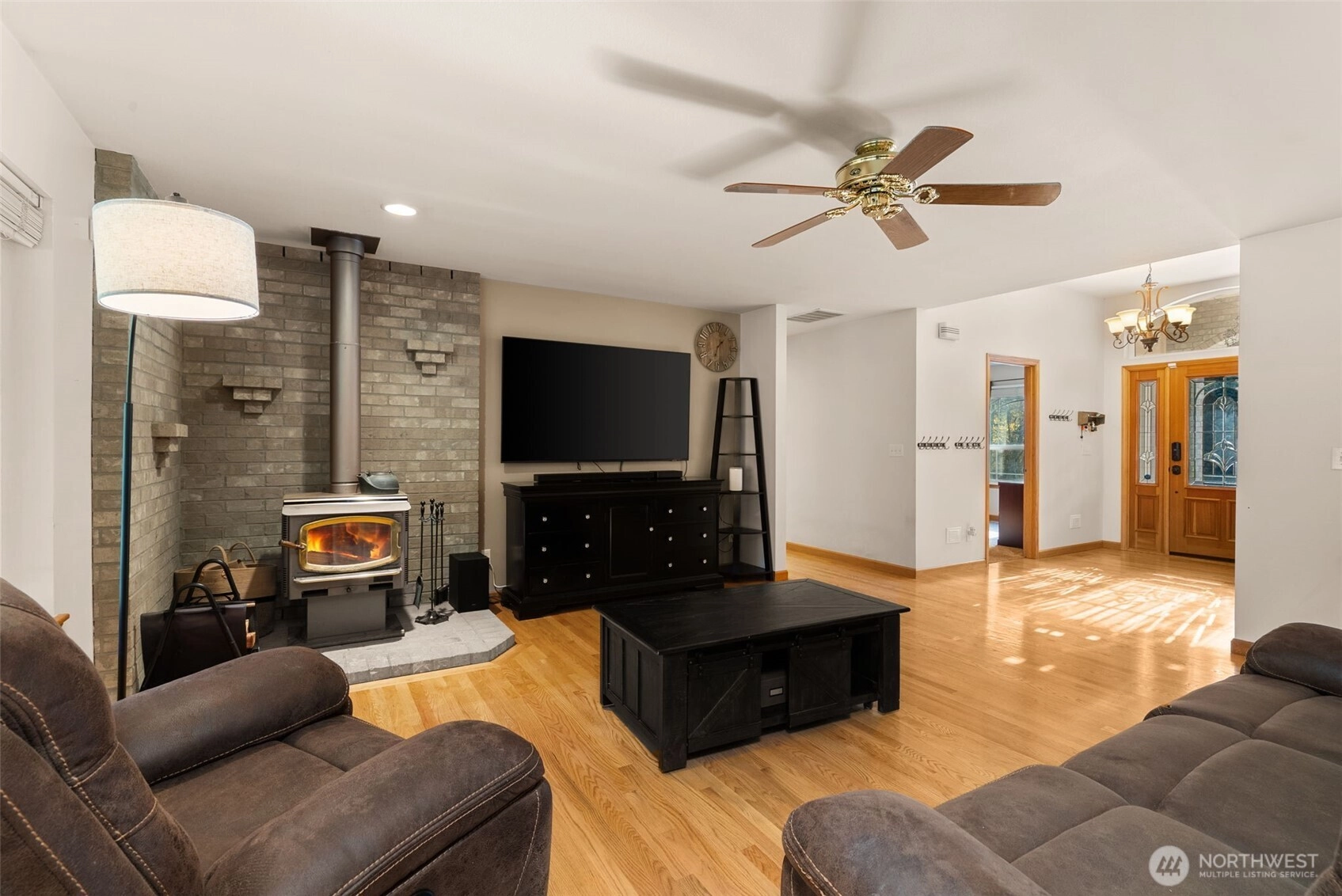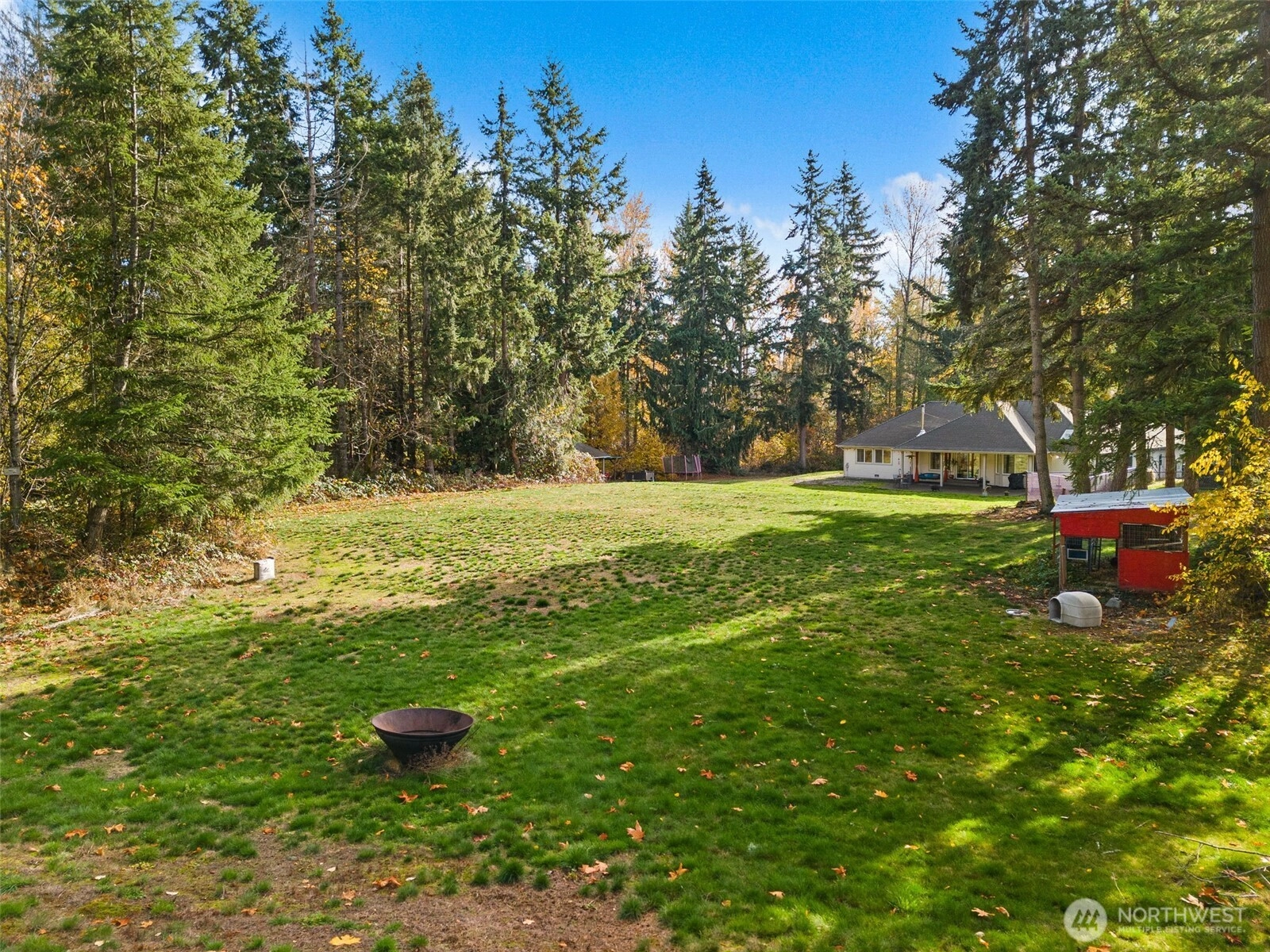 Escape to this private retreat on over 4 acres w/ this well-maintained rambler offering 3 bedrooms, 2 baths, and TWO versatile offices/flex rooms—ideal for remote work or hobbies. Enjoy spacious single-level living w/ a wide-open great room, hardwood floors, & a cozy wood-burning stove framed by large windows overlooking serene wooded surroundings. The kitchen features a large island, solid cabinetry, & newer appliances. The primary suite includes a spa-style bath w/ tiled walk-in shower, jetted tub, dual vanities, & a generous walk-in closet. Outdoors, enjoy the covered patio, large dog run, usable acreage, detached outbuilding, & room for gardens, animals, or a future shop. Bonus: direct back-road access to Bonney Lake with total privacy.
