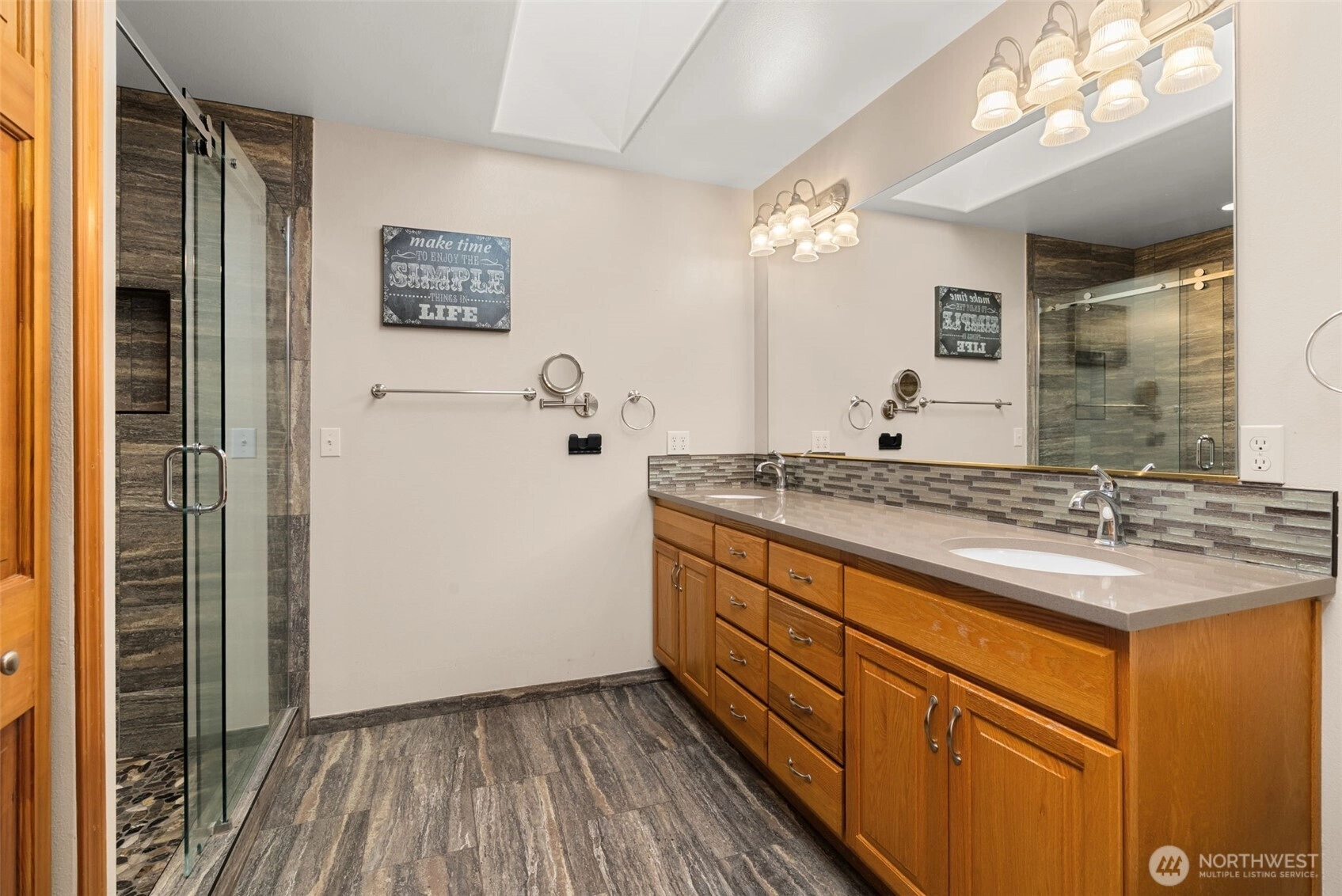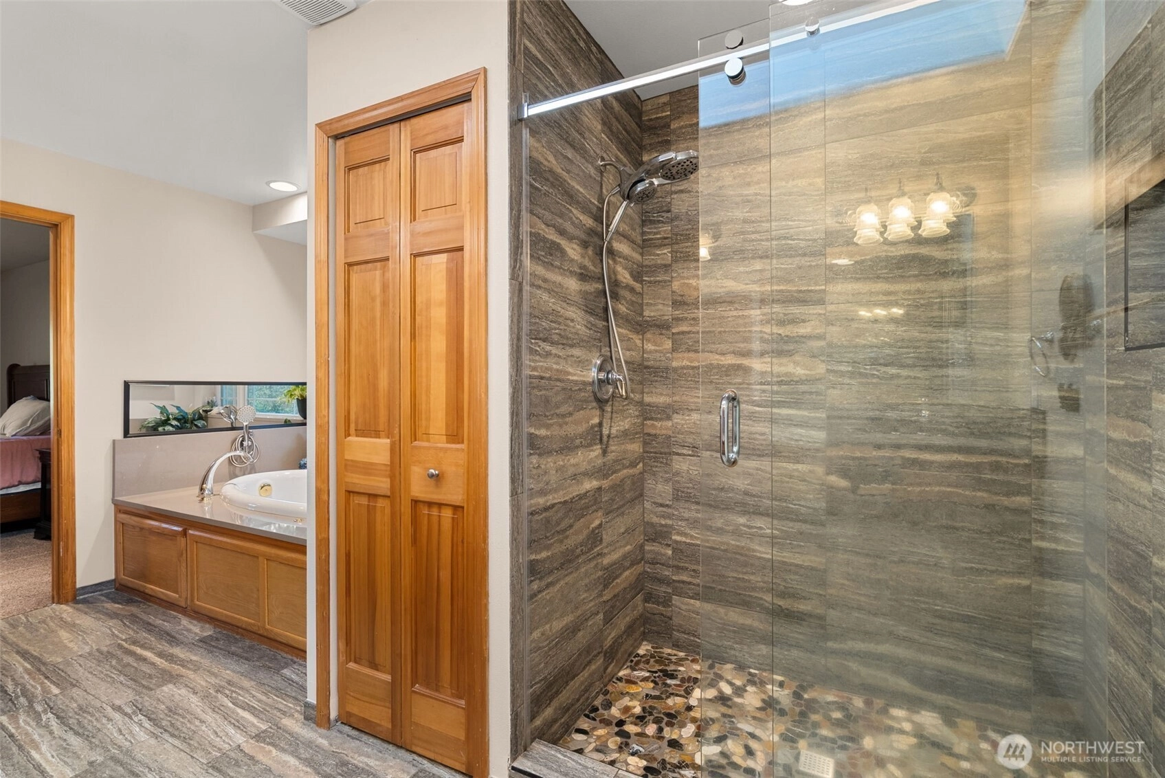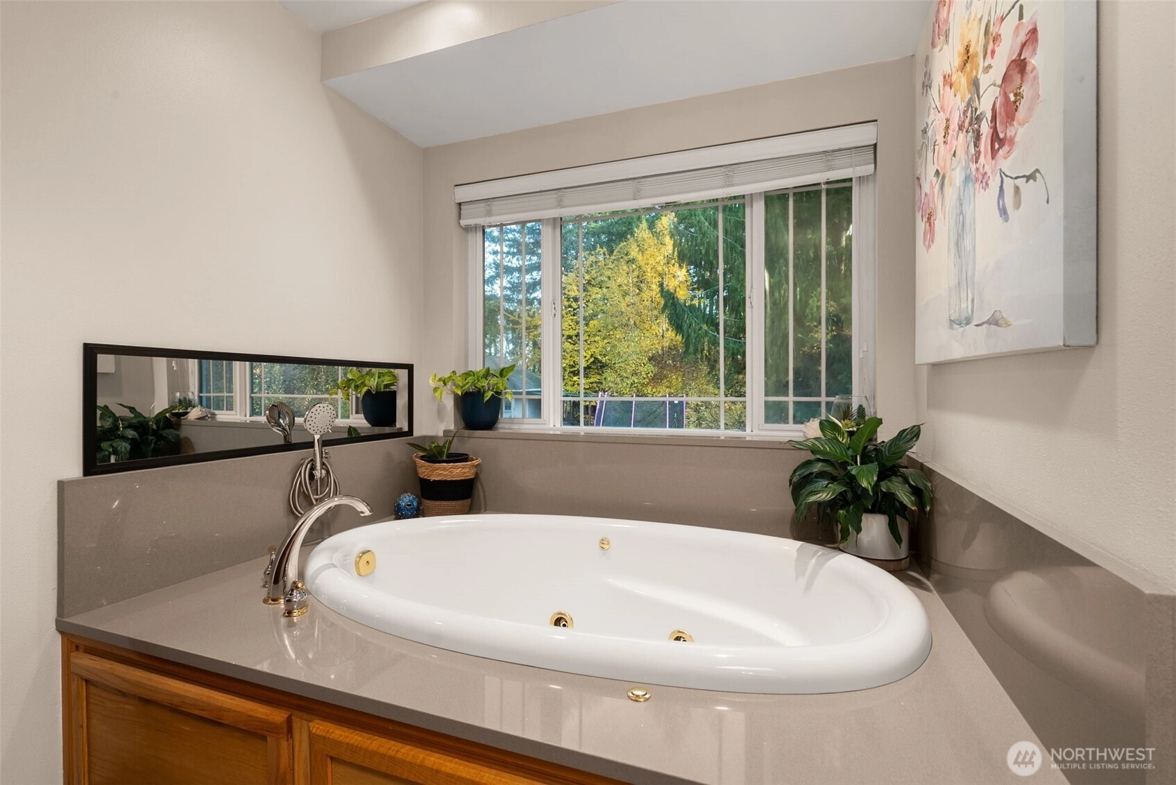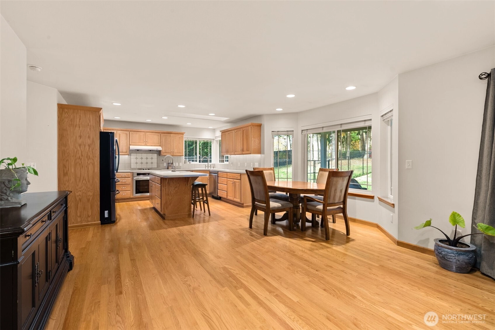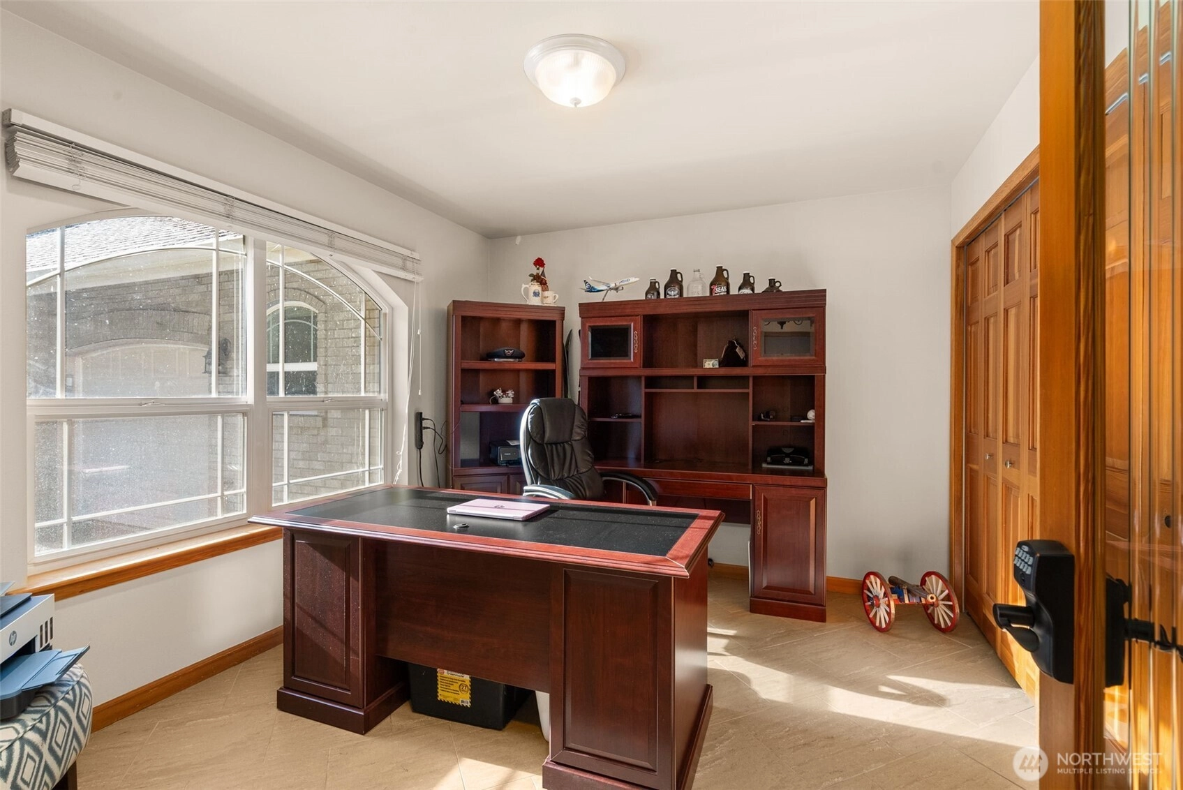 Escape to this private retreat on over 4 acres w/ this well-maintained rambler offering 3 bedrooms, 2 baths, and TWO versatile offices/flex rooms—ideal for remote work or hobbies. Enjoy spacious single-level living w/ a wide-open great room, hardwood floors, & a cozy wood-burning stove framed by large windows overlooking serene wooded surroundings. The kitchen features a large island, solid cabinetry, & newer appliances. The primary suite includes a spa-style bath w/ tiled walk-in shower, jetted tub, dual vanities, & a generous walk-in closet. Outdoors, enjoy the covered patio, large dog run, usable acreage, detached outbuilding, & room for gardens, animals, or a future shop. Bonus: direct back-road access to Bonney Lake with total privacy.