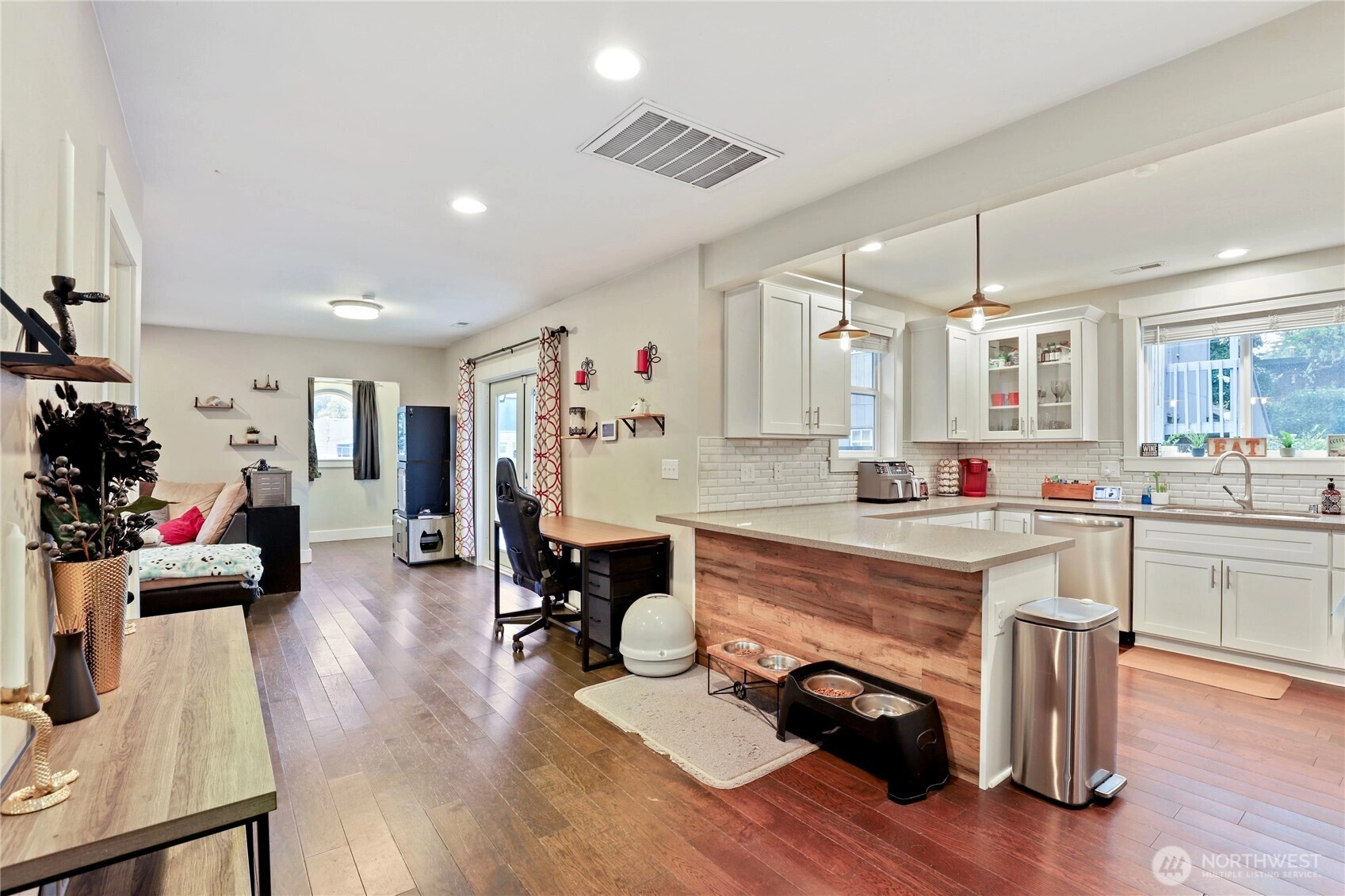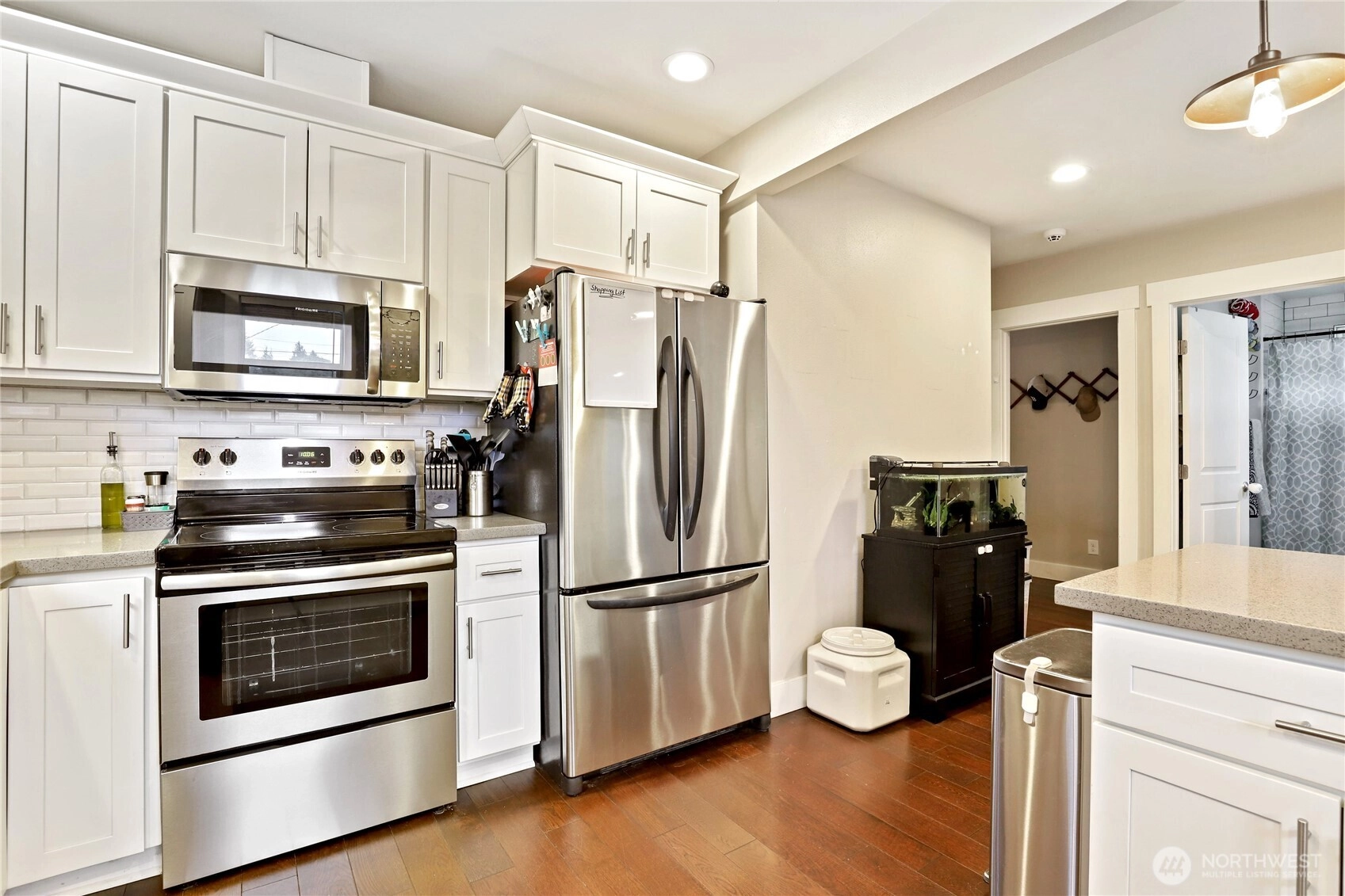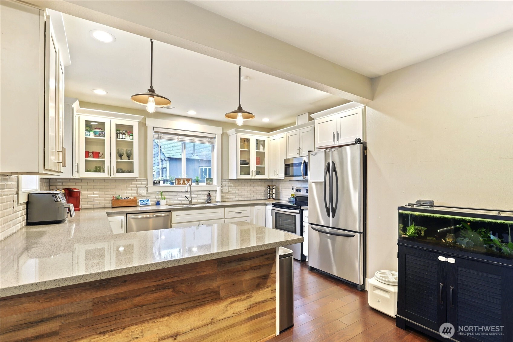 Come see this fully updated 2 bed/1 bath Craftsman home near lively shops and restaurants! Open floor plan, gorgeous hardwood floors, dinning area with French doors leading to an open deck. Massive kitchen with custom tile backsplash, stainless steel appliances, quartz countertops. Primary bedroom has private deck & walk-in closet. Dedicated laundry room, newer water heater, updated plumbing, electrical. Fully insulated garage with loft storage, new lighting, electric car charging hookups, bonus attached shop leading to a fenced backyard. 18 min walk to PSNS, 10 min to Bremerton ferry terminal.