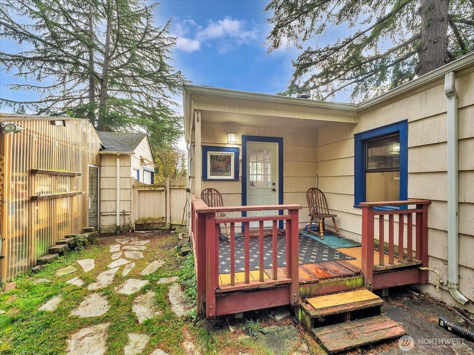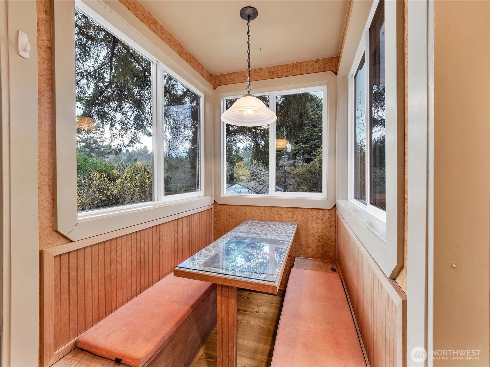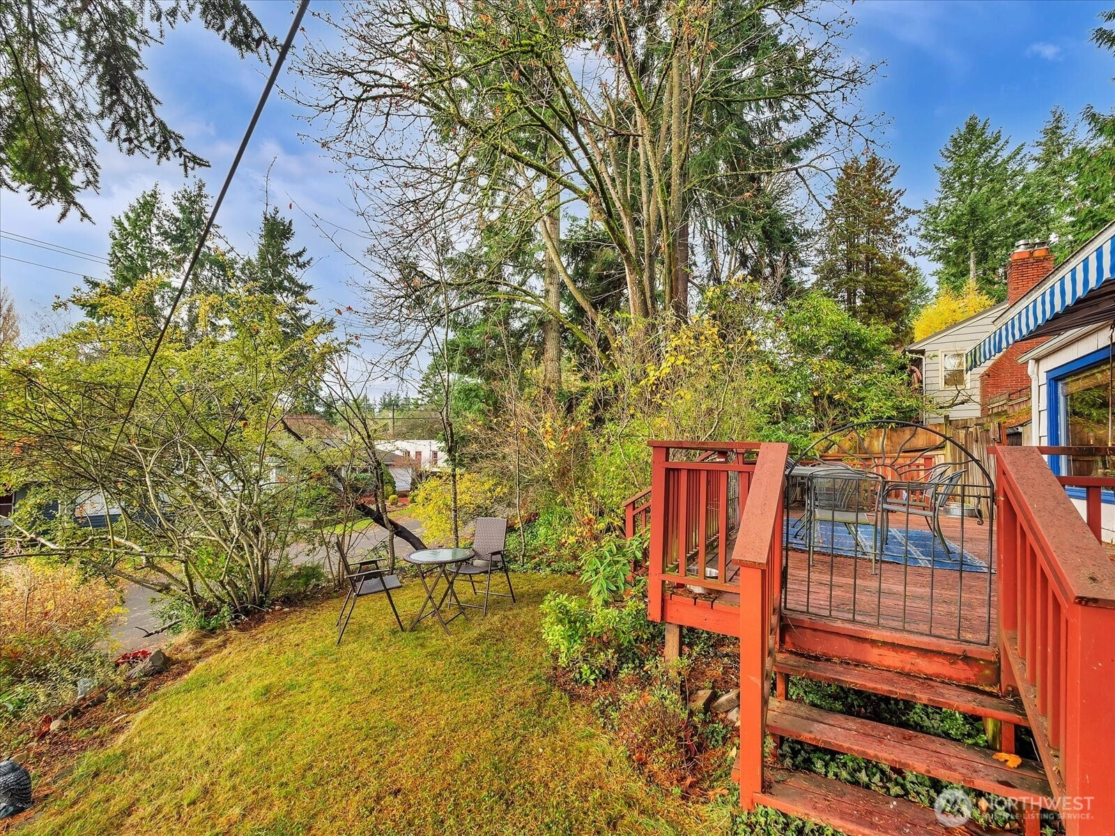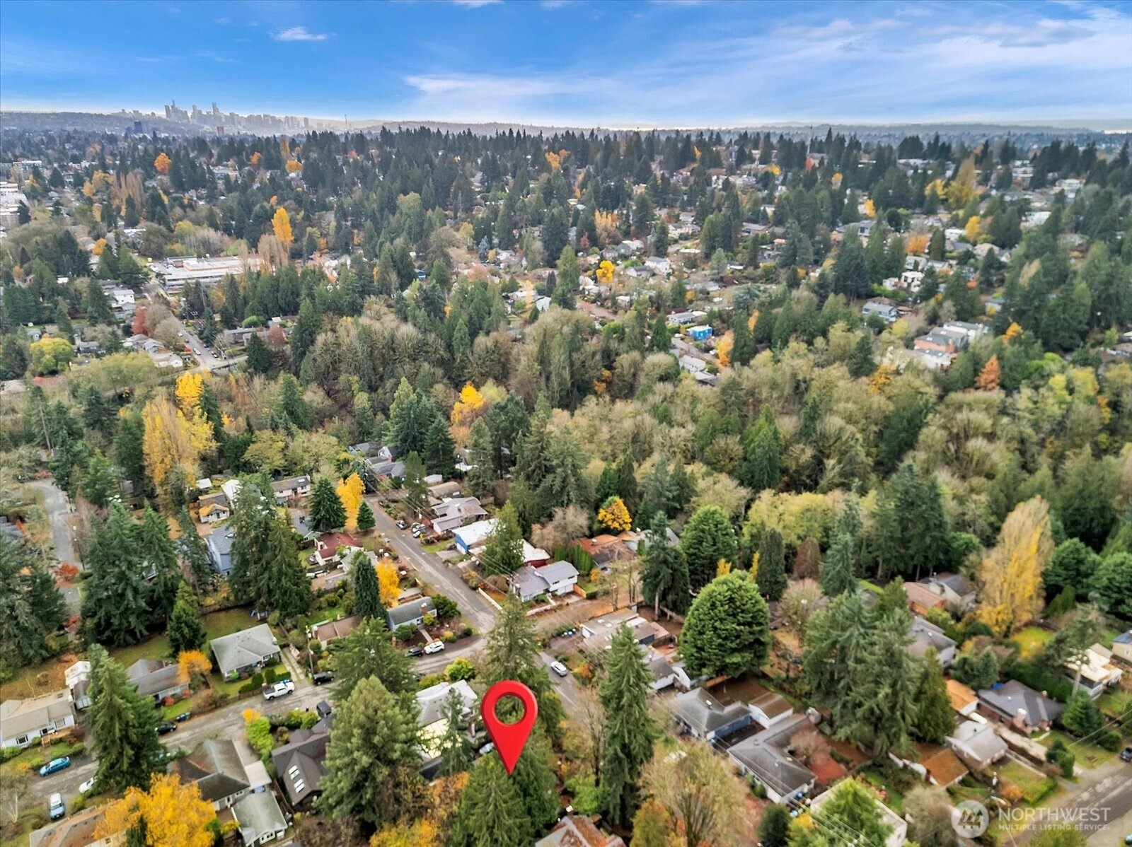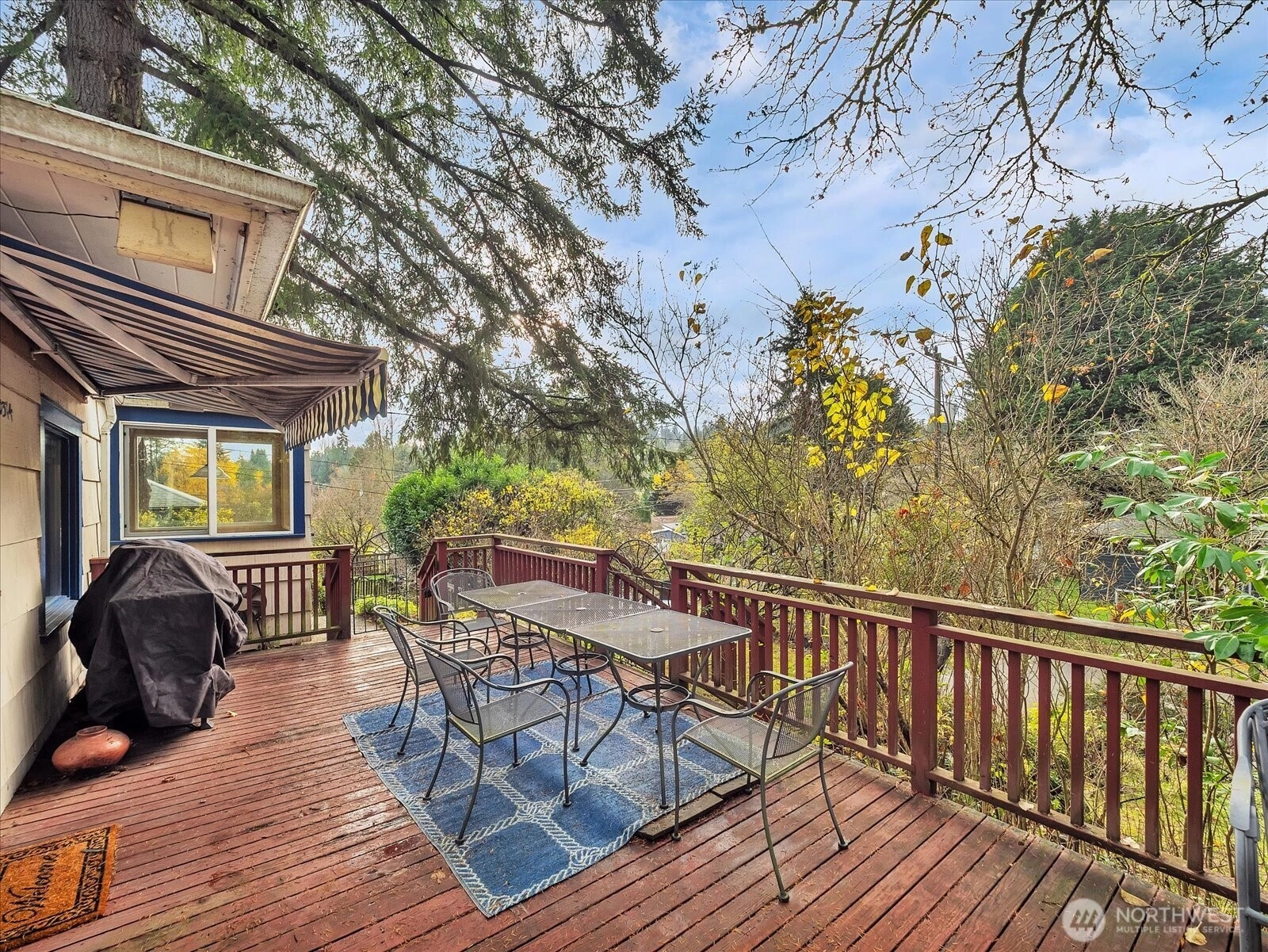 Charming home in the desirable neighborhood of Victory Heights! This uniquely located bungalow is tucked away from the road and surrounded by mature plants and trees. Enjoy views of Thornton Creek Ravine from the deck and windows. The flat backyard is ideal for entertaining, pets, and play. This commuter-friendly location is only a short drive to Green Lake, dining, and shopping. Inside, you will find a cozy, new gas fireplace, a chef's kitchen that shines with a custom pantry, & a built-in dining table with bench seating — perfect for everyday meals or hosting. Generous parking includes a detached garage plus driveway space. This is a fantastic opportunity for builders, investors, first-time homebuyers, or those looking to downsize.