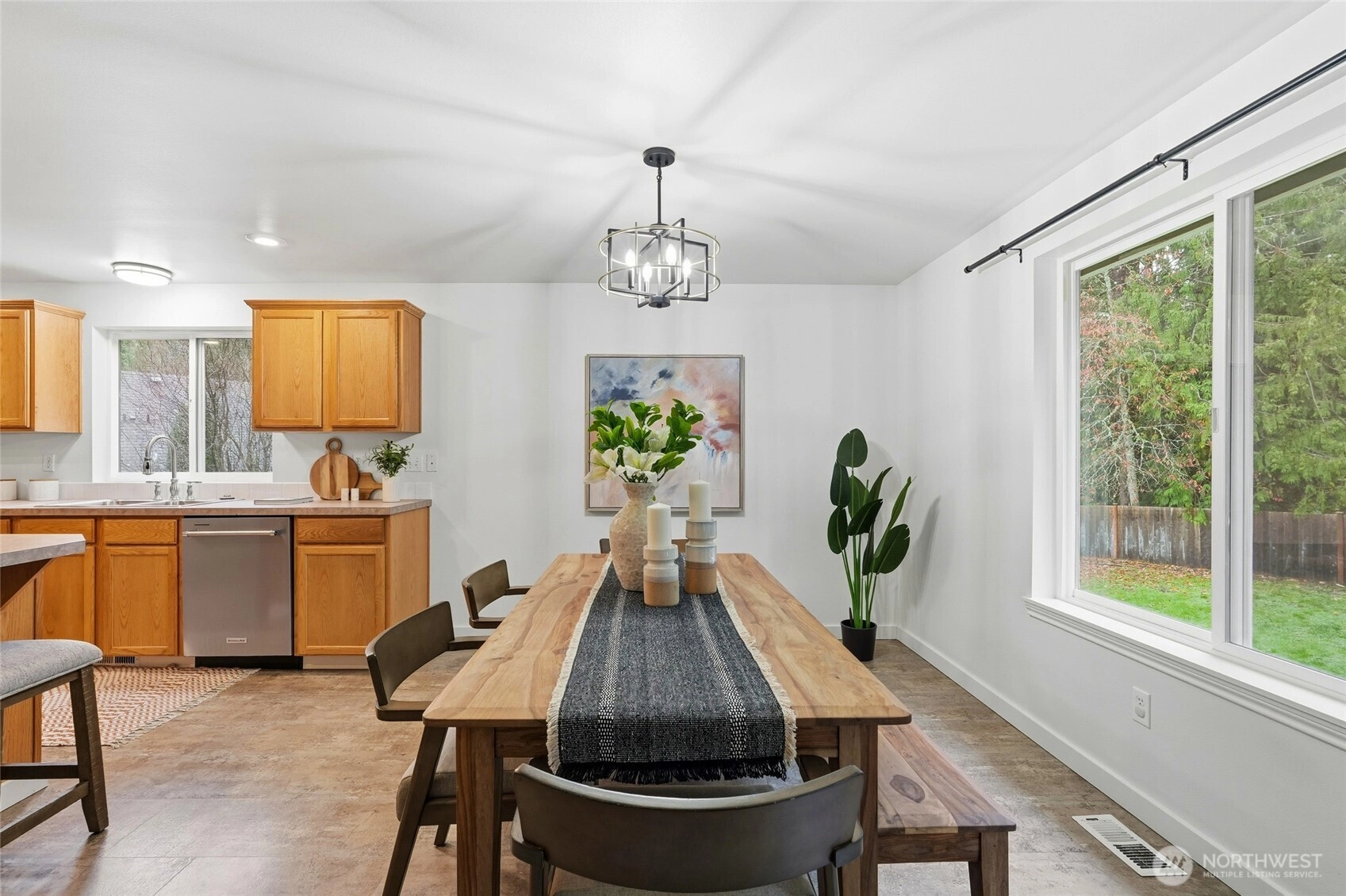Situated in a quiet cul-de-sac and backed by evergreens, this spacious Lake Tapps home offers comfort, privacy and over 2,000 square feet that lives like a single family home. The main level feels bright and welcoming with fresh paint, modern lighting, and new kitchen appliances. The primary bedroom is conveniently located on the main floor with a double vanity. Upstairs, two bedrooms provide flexible space for guests, work, or play. The finished lower level adds a generous bonus room, new flooring, and a large flex area. Enjoy a fully fenced yard, a new furnace, a newer heat pump, a newer water heater, and the HOA that covers water, septic, front yard care, and private lake access at nearby Jenks Park. Imagine the life you’ll create here!