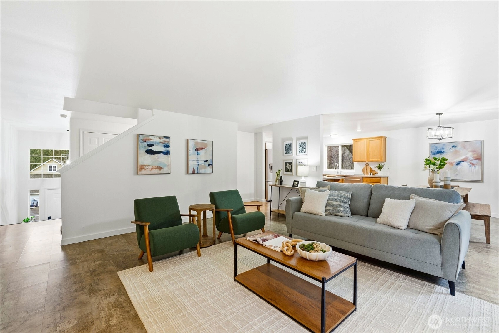Situated in a quiet cul-de-sac and backed by evergreens, this spacious Lake Tapps home offers comfort, privacy and over 2,000 square feet that lives like a single family home. The main level feels bright and welcoming with fresh paint, modern lighting, and new kitchen appliances. The primary bedroom is conveniently located on the main floor with a double vanity. Upstairs, two bedrooms provide flexible space for guests, work, or play. The finished lower level adds a generous bonus room, new flooring, and a large flex area. Enjoy a fully fenced yard, a new furnace, a newer heat pump, a newer water heater, and the HOA that covers water, septic, front yard care, and private lake access at nearby Jenks Park. Imagine the life you’ll create here!