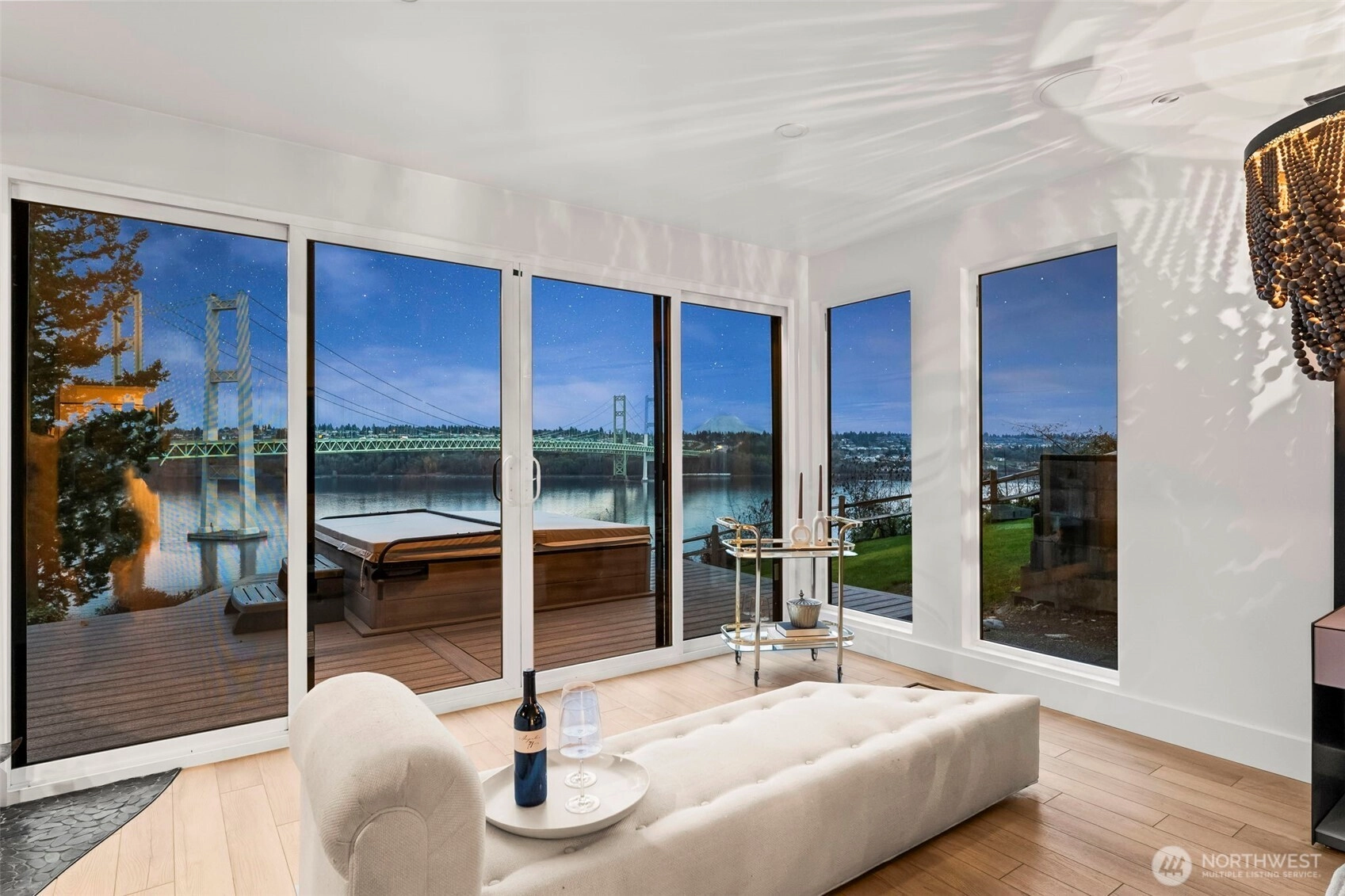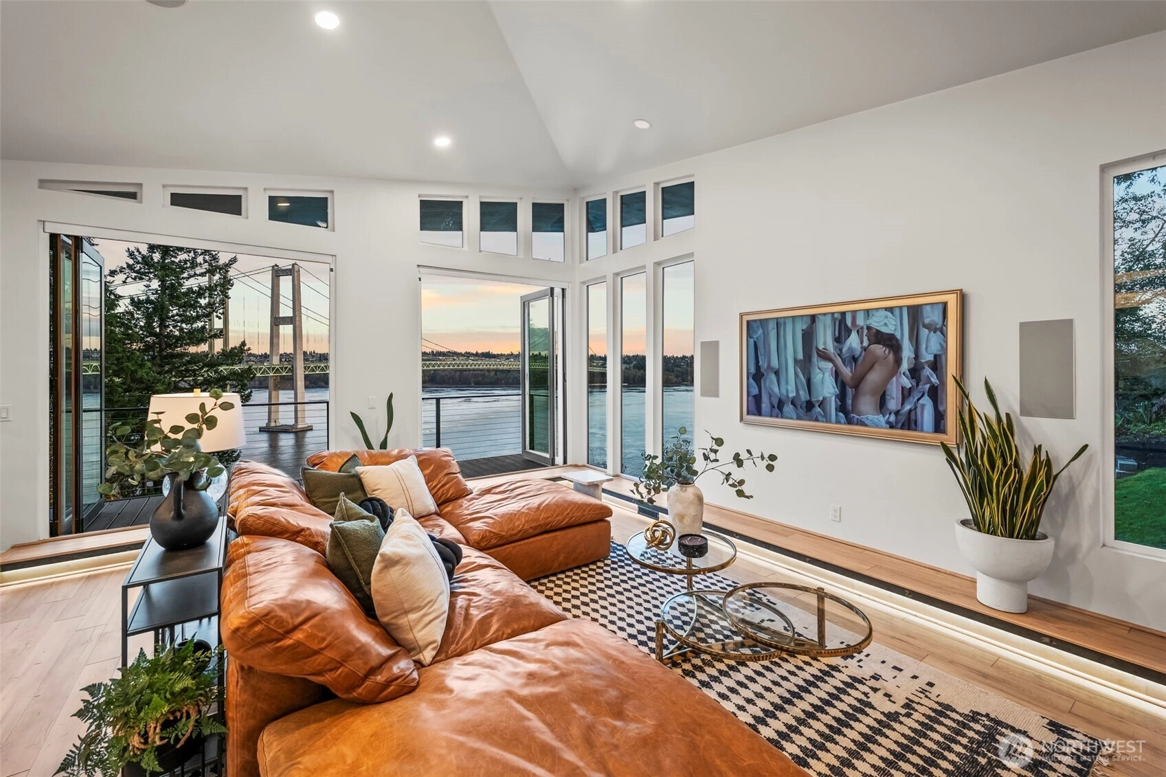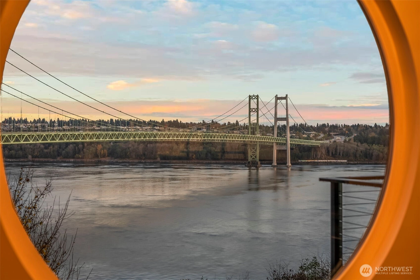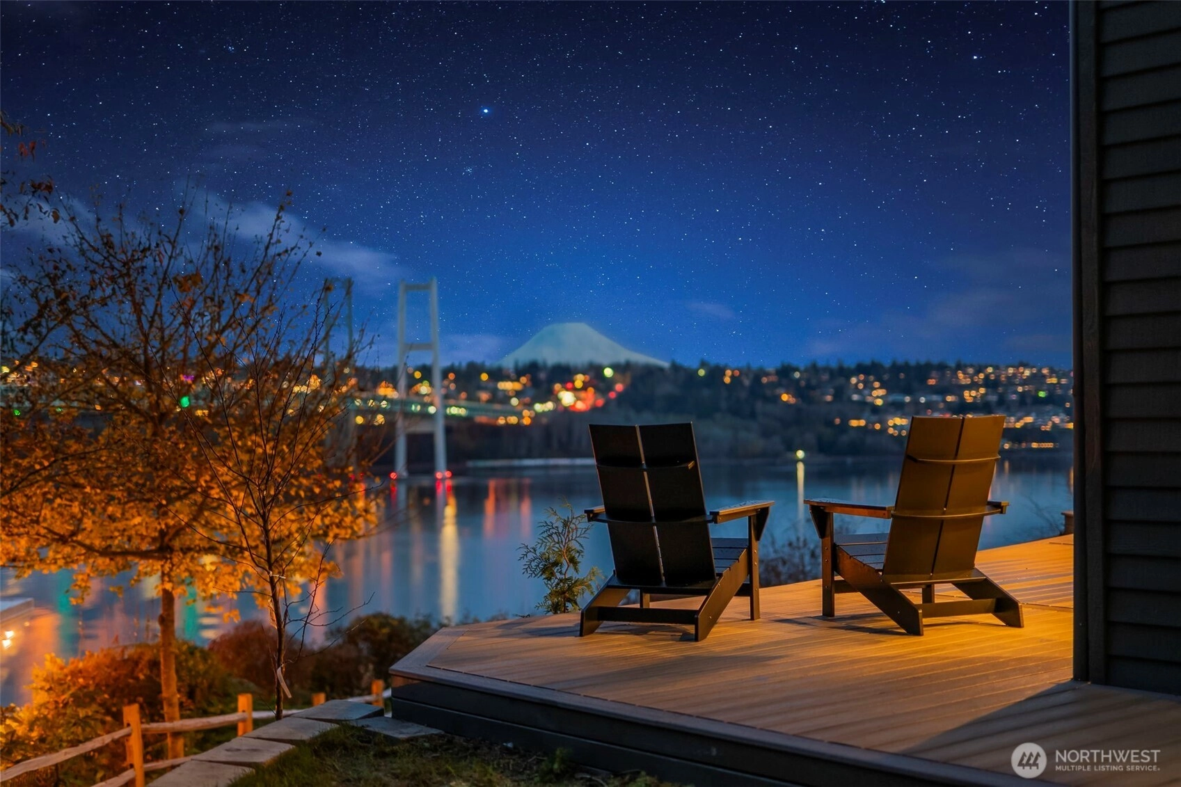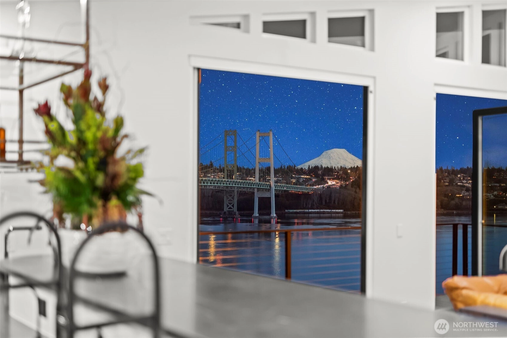 Perched above the Tacoma Narrows, this elemental Mid-Century Modern masterpiece offers sweeping views of the Narrows Bridge and Mount Rainier from every room. Set on over an acre of pristine waterfront, the 2-bedroom, 2.5-bath home marries serene, sculptural design with high-end finishes. Multiple decks create effortless indoor-outdoor flow, while the chef’s kitchen with Fisher & Paykel appliances and leather-honed granite elevates culinary life to an art form. An attached two-car garage and a striking laundry room with dual washers and dryers complete this exceptional, thoughtfully reimagined retreat.