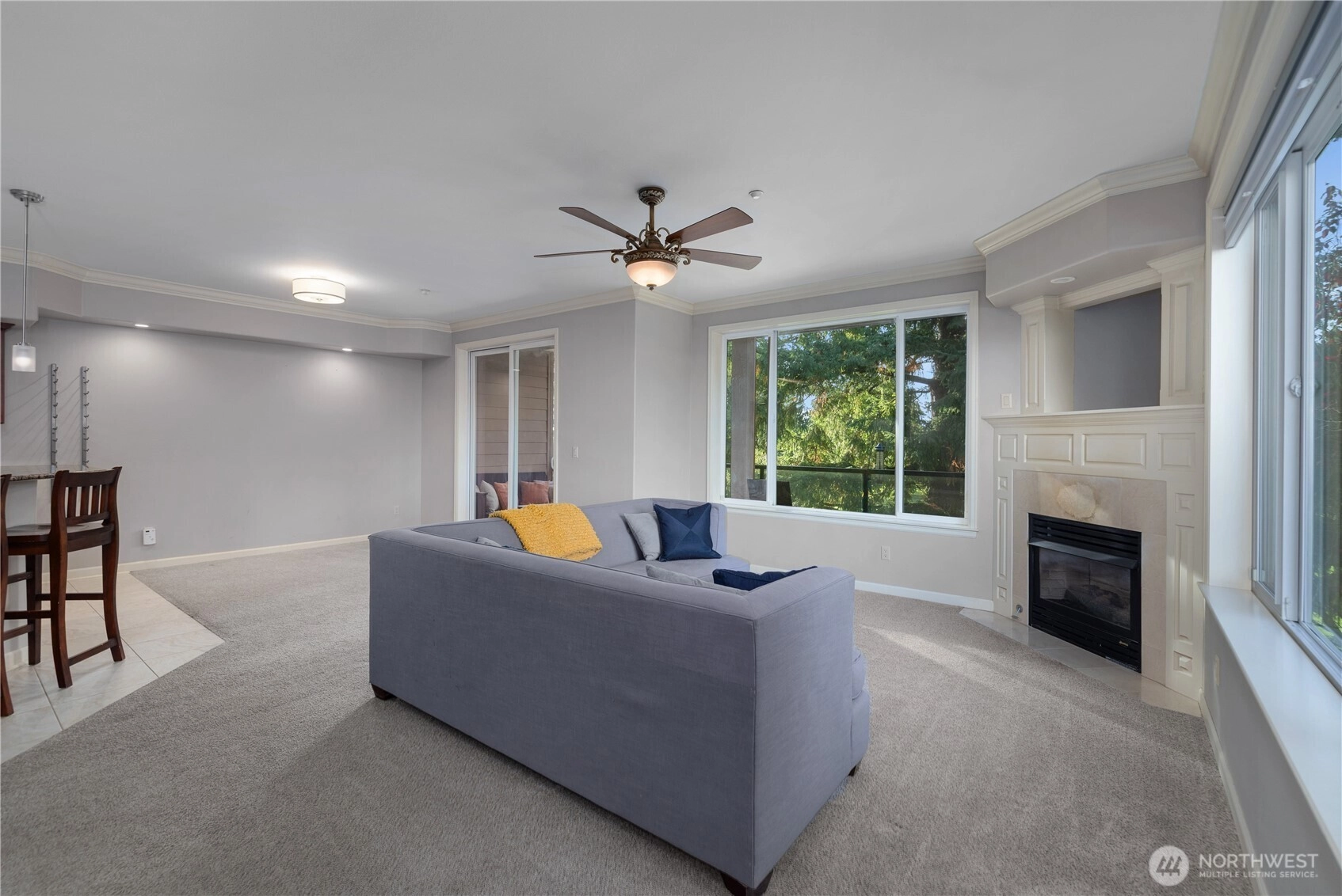 Spacious Golf Course Condo with great views! This quality built corner unit features an open concept kitchen, family rm, dining area & an island w/breakfast bar. These condos have dual walls to ensure quiet condo living & the heated radiant floors are great for a healthy living environment. Upgrades include granite counters, SS appliances, gas range, pendant lighting & trash compactor. Large deck overlooks the golf course. Primary bath w/soaking tub & vessel sinks leads to the large walk-in closet. All the closets have built-ins. 3rd room can be a den/office w/French doors or just use as 3rd bedroom. Well appointed gym has everything you need in the building to stay fit. Gated garage offers 2 parking spots & storage unit. Easy I-5 access.