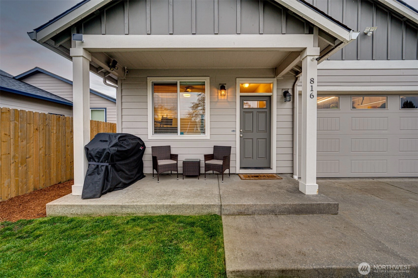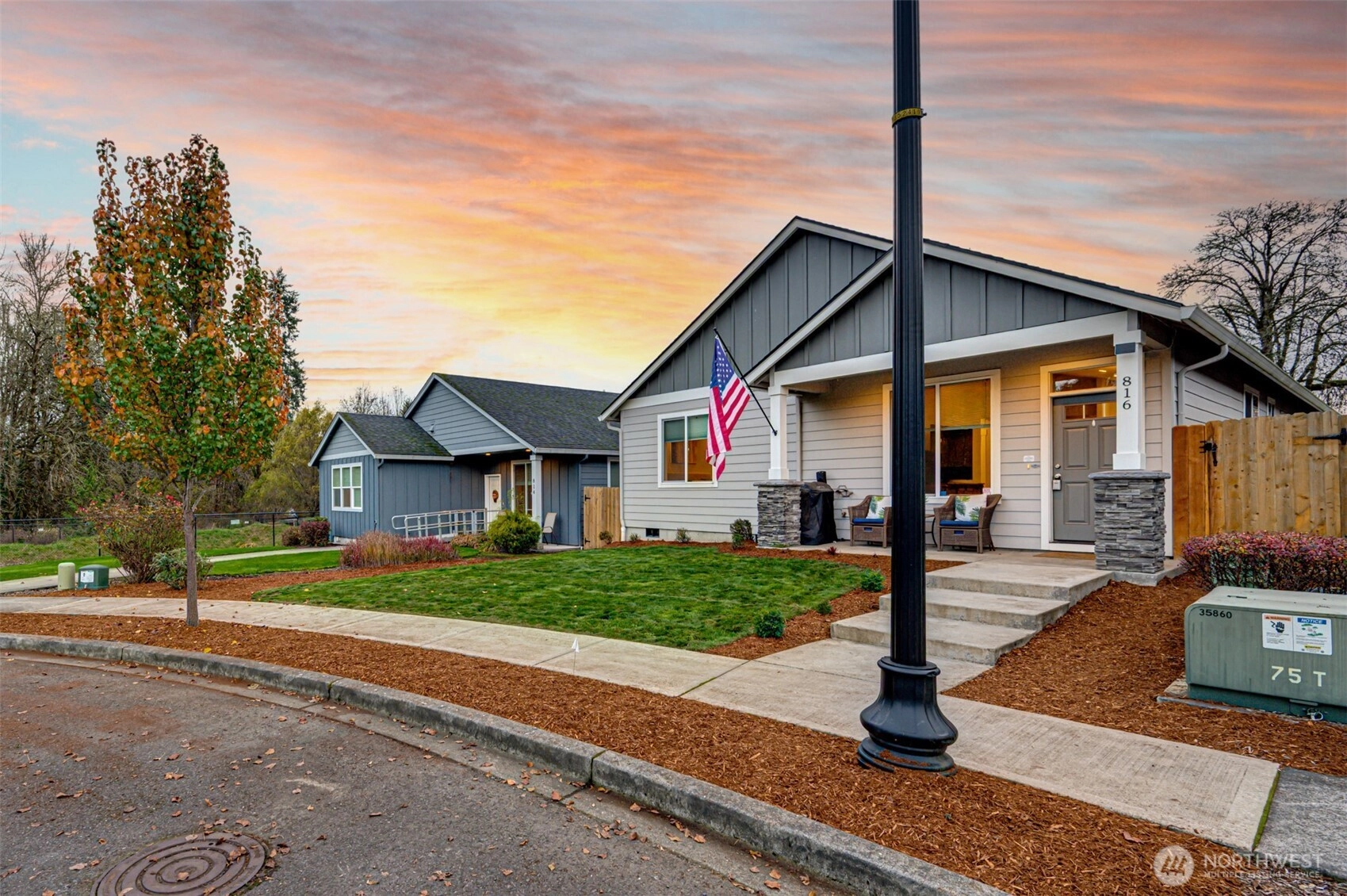Built in 2019, this 3-bedroom, 2-bath home is well-designed with a vaulted, open great-room layout. The kitchen includes a gas range, stainless-steel appliances, and generous counter and cupboard space. LVP flooring extends through the main living areas, with carpet in the bedrooms for added comfort. A covered back patio & fenced yard with gated alley access offer practical outdoor use. Permanent, programmable roofline lighting sets the perfect atmosphere for holidays & celebrations year-round. Located on a low-maintenance lot in a quiet cul-de-sac just moments from town, within walking distance to downtown shops & restaurants. This home is a solid fit for a first-time buyer or anyone looking to downsize while keeping everyday convenience.