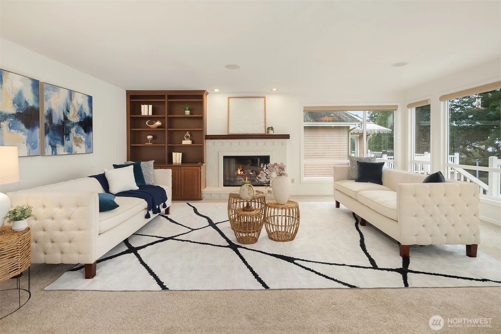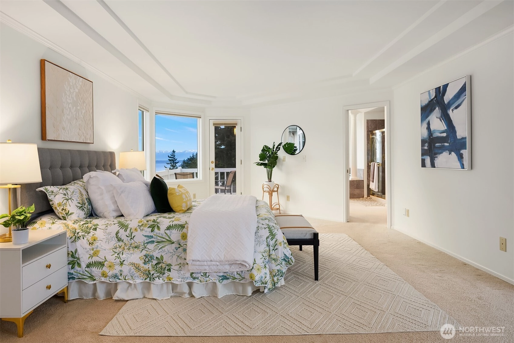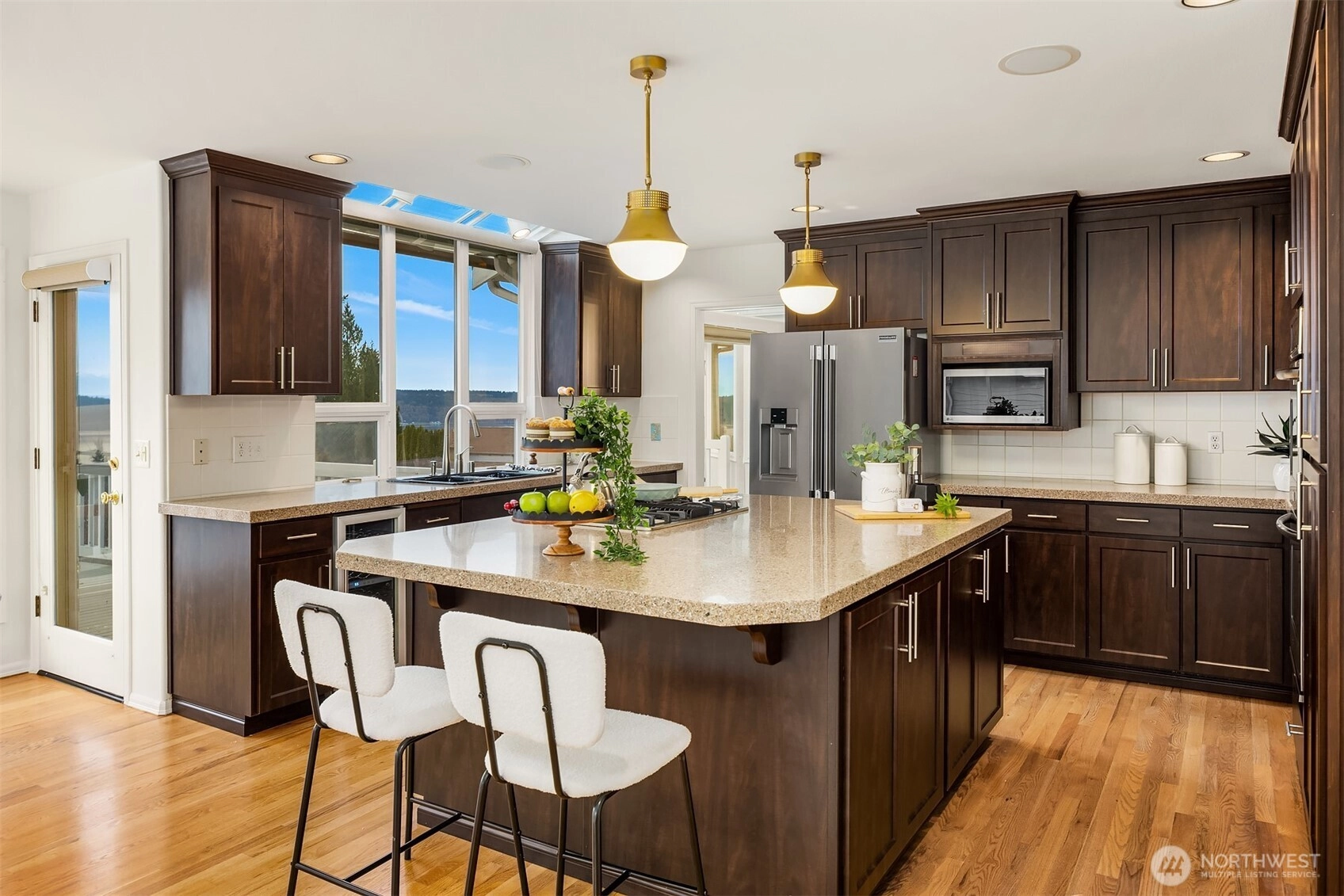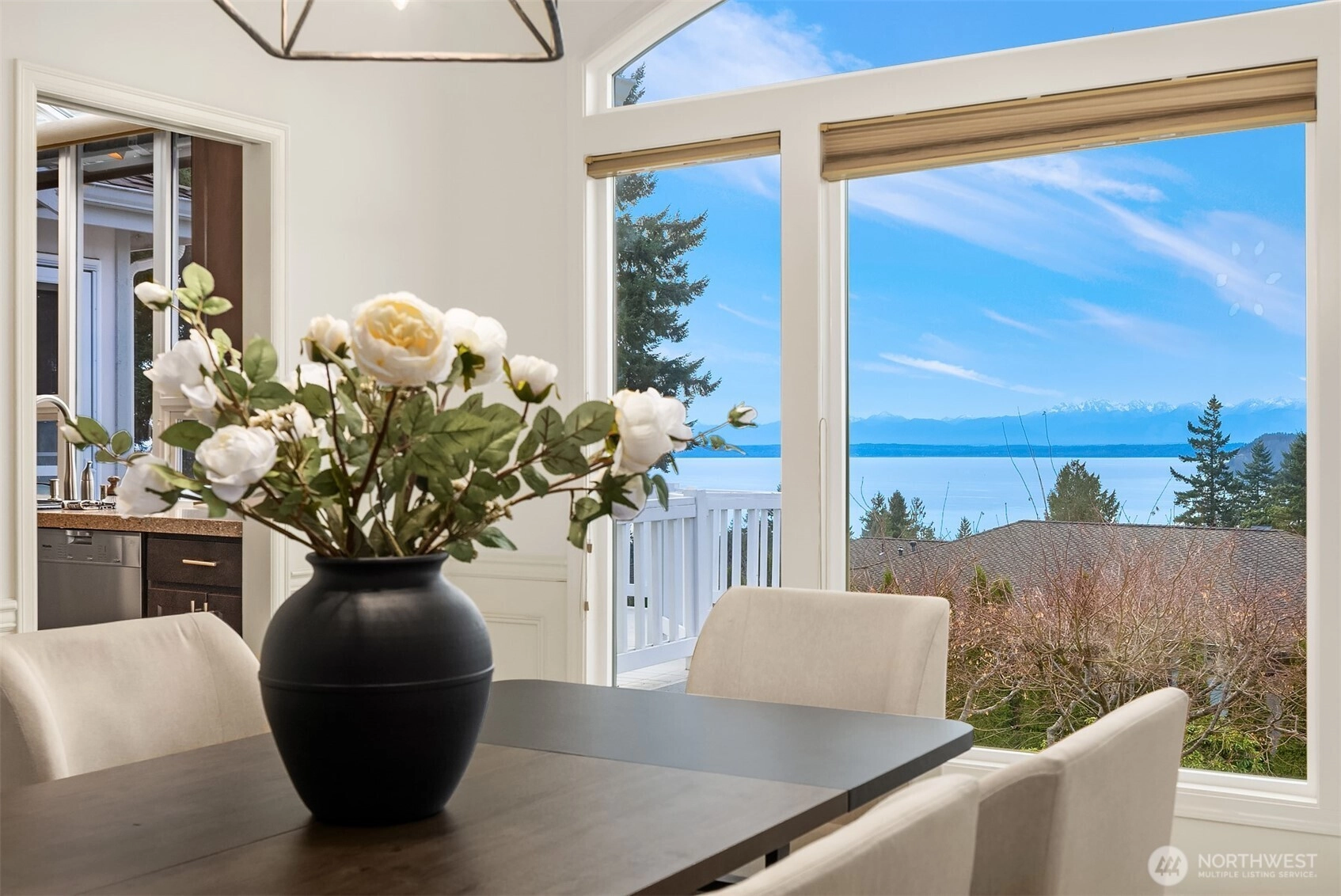 Amazing Mukilteo view home with fabulous floor plan designed to maximize vistas of the water & mountains. Expansive main-floor primary suite with vaulted ceilings, 5-piece bath and view deck. Updated kitchen w/ quartz counters, gas top, double oven, new stainless appliances. Main floor also features oak floors, two fireplaces & a powder room. The lower level features 3 additional bedrooms, including a 2nd primary suite, remodeled bathroom, large bonus rec room. Lower potential kitchenette with addition of appliances, perfect for an ADU. Large 3-car garage with shop bench. Huge hidden stand-up storage in the basement, not included in the SF. New 2024 presidential roof, new gas furnace & central A/C. Quiet private street of just 7 homes.