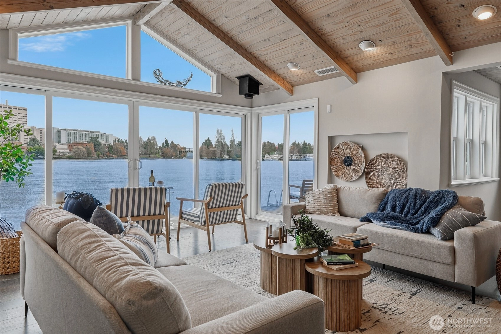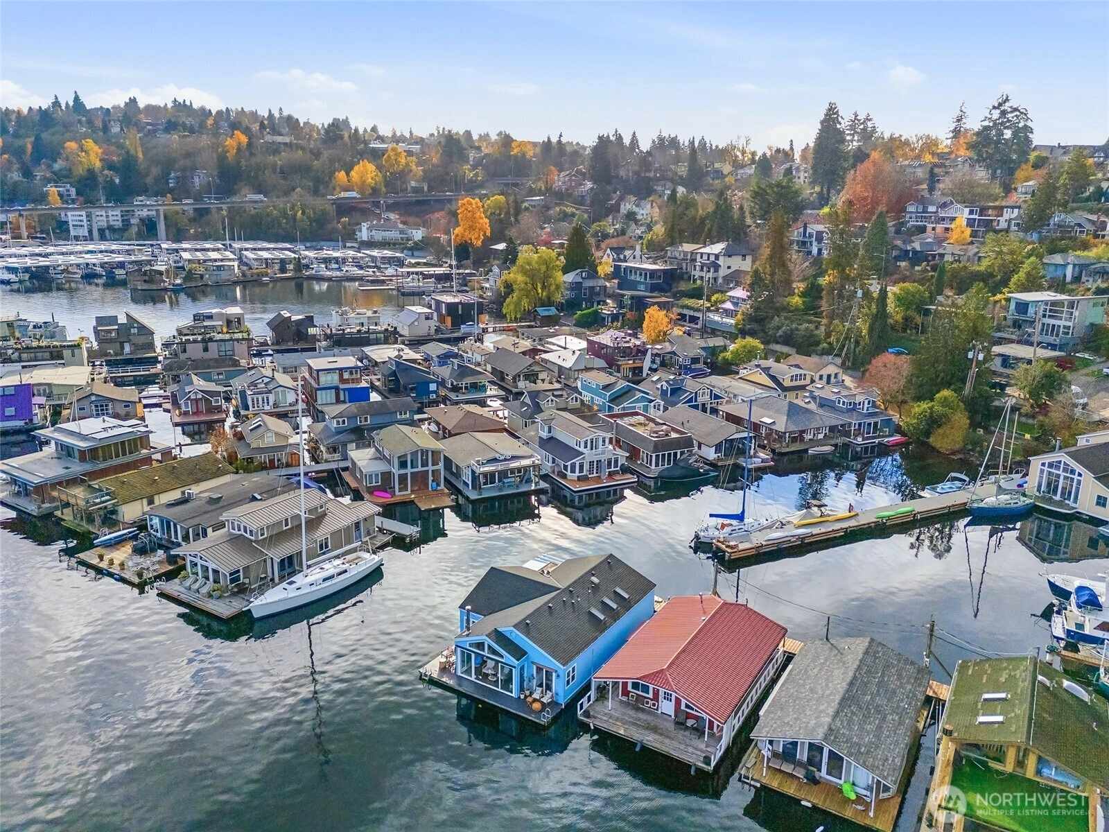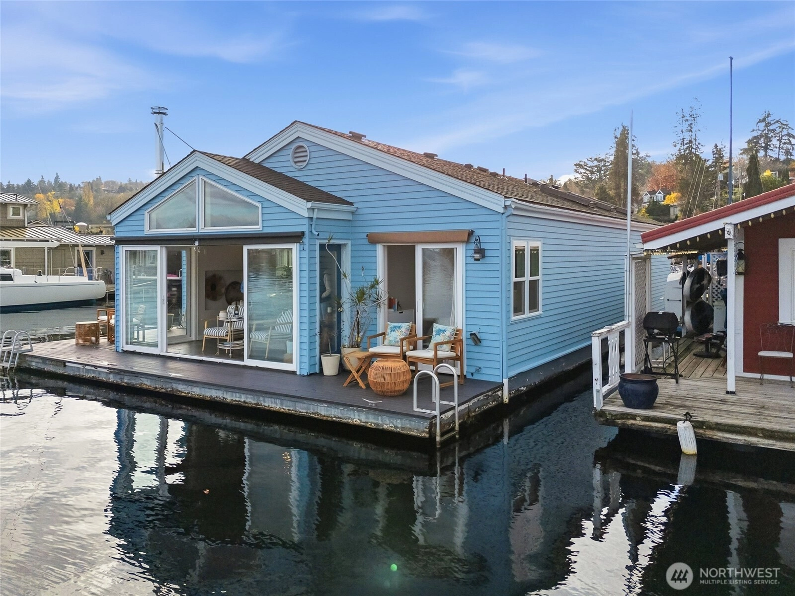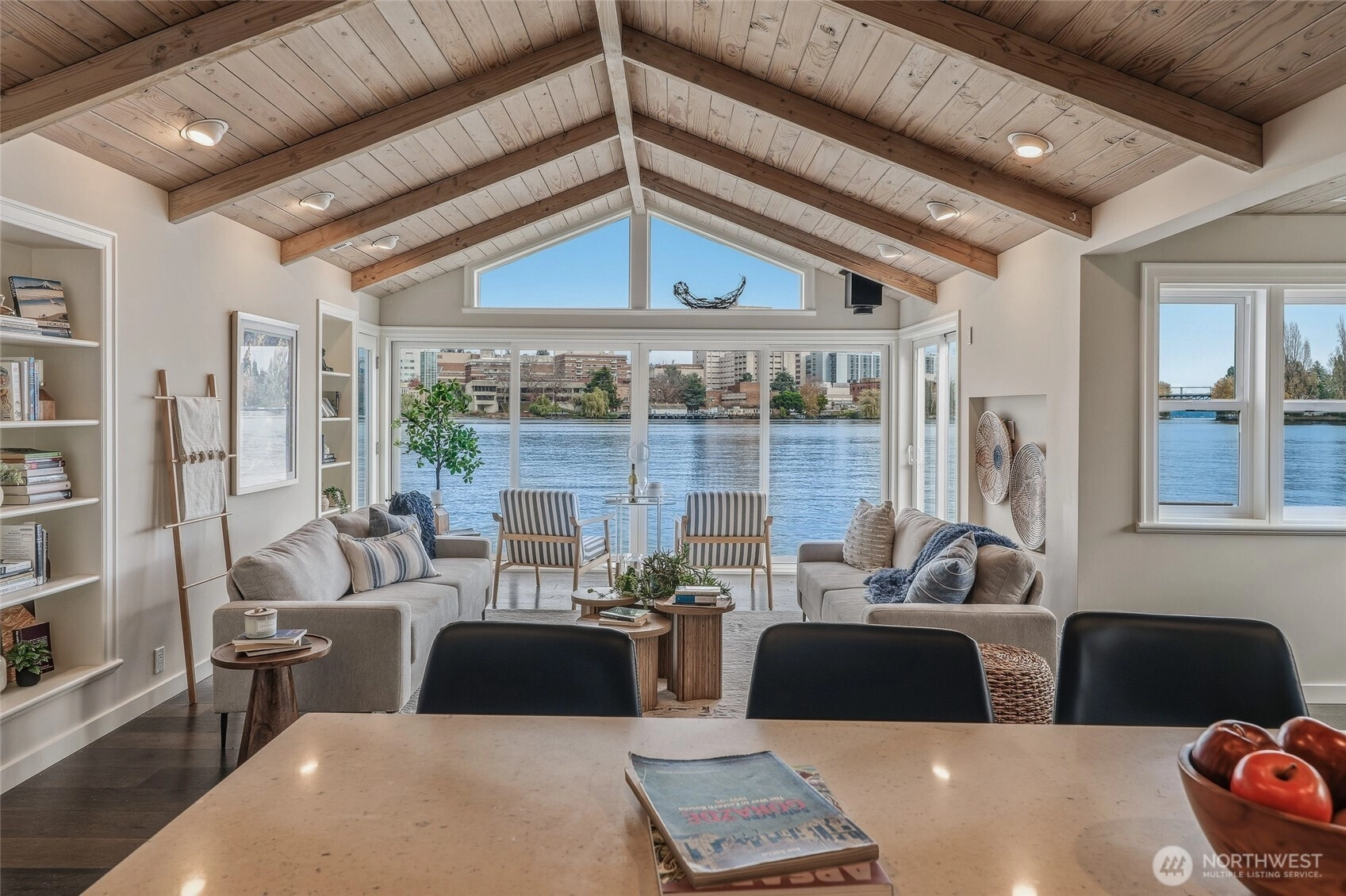 The lake reflects the sky in this light-filled front row floating residence, featuring an expansive living room & open kitchen beneath beautiful vaulted ceilings. A true rarity, this home provides single level living with beautiful wood floors throughout. All 3 bedrooms enjoy views framed by brand-new windows, perfect for watching winter migratory birds & all the water action. Loads of storage including attic access. Enjoy 38 feet of low-bank bulkhead waterfront & 2 outdoor seating areas—including one directly off the primary bedroom. Fresh interior and exterior paint enhance the timeless design by architect Eric Hogeboom. Includes a dedicated boat slip, completing this exceptional waterfront lifestyle.