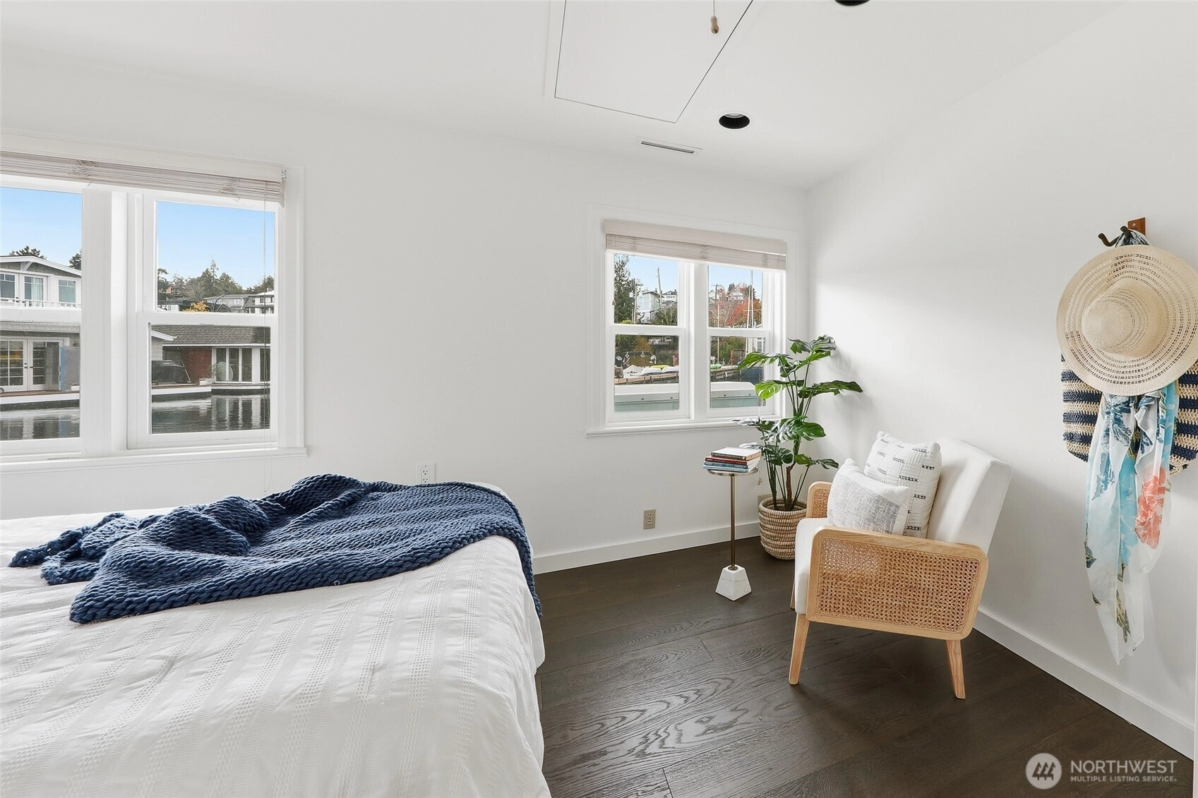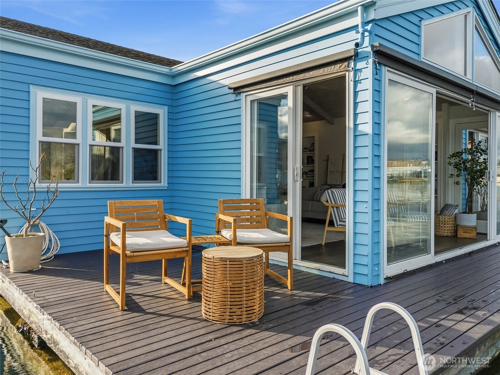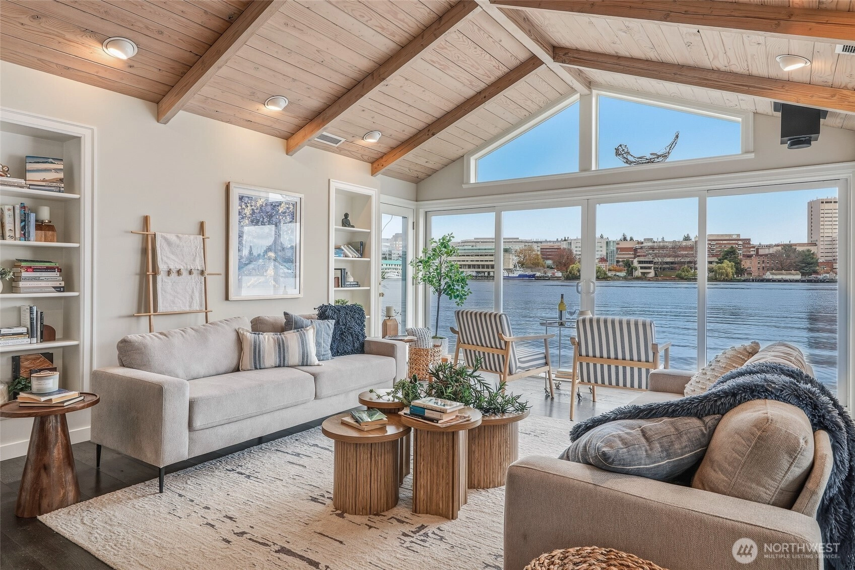 The lake reflects the sky in this light-filled front row floating residence, featuring an expansive living room & open kitchen beneath beautiful vaulted ceilings. A true rarity, this home provides single level living with beautiful wood floors throughout. All 3 bedrooms enjoy views framed by brand-new windows, perfect for watching winter migratory birds & all the water action. Loads of storage including attic access. Enjoy 38 feet of low-bank bulkhead waterfront & 2 outdoor seating areas—including one directly off the primary bedroom. Fresh interior and exterior paint enhance the timeless design by architect Eric Hogeboom. Includes a dedicated boat slip, completing this exceptional waterfront lifestyle.