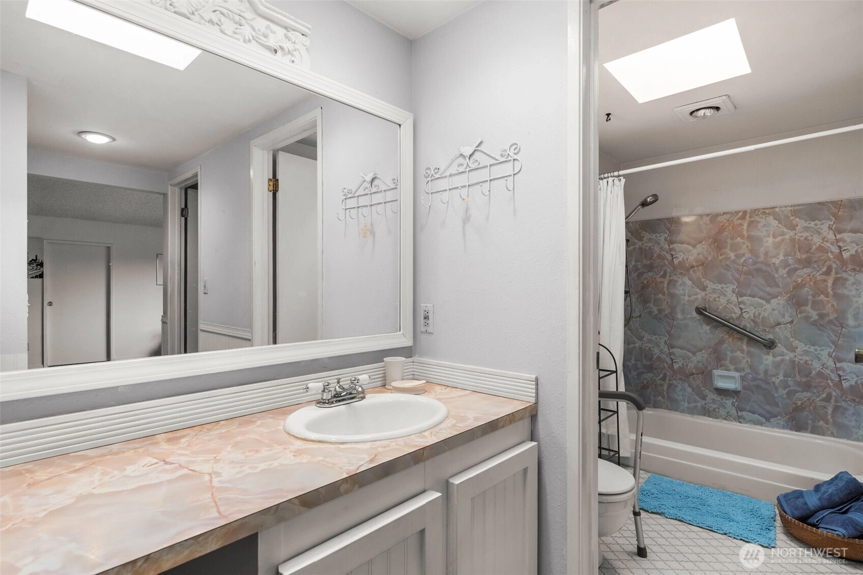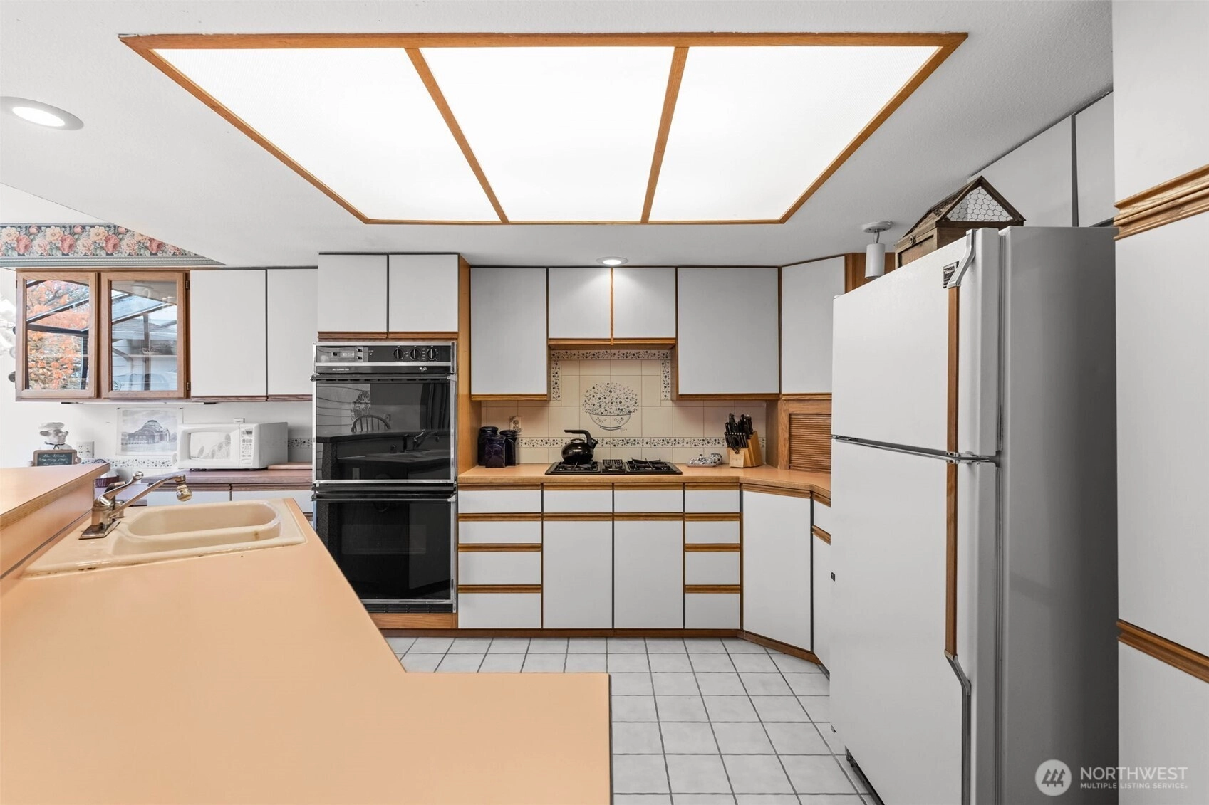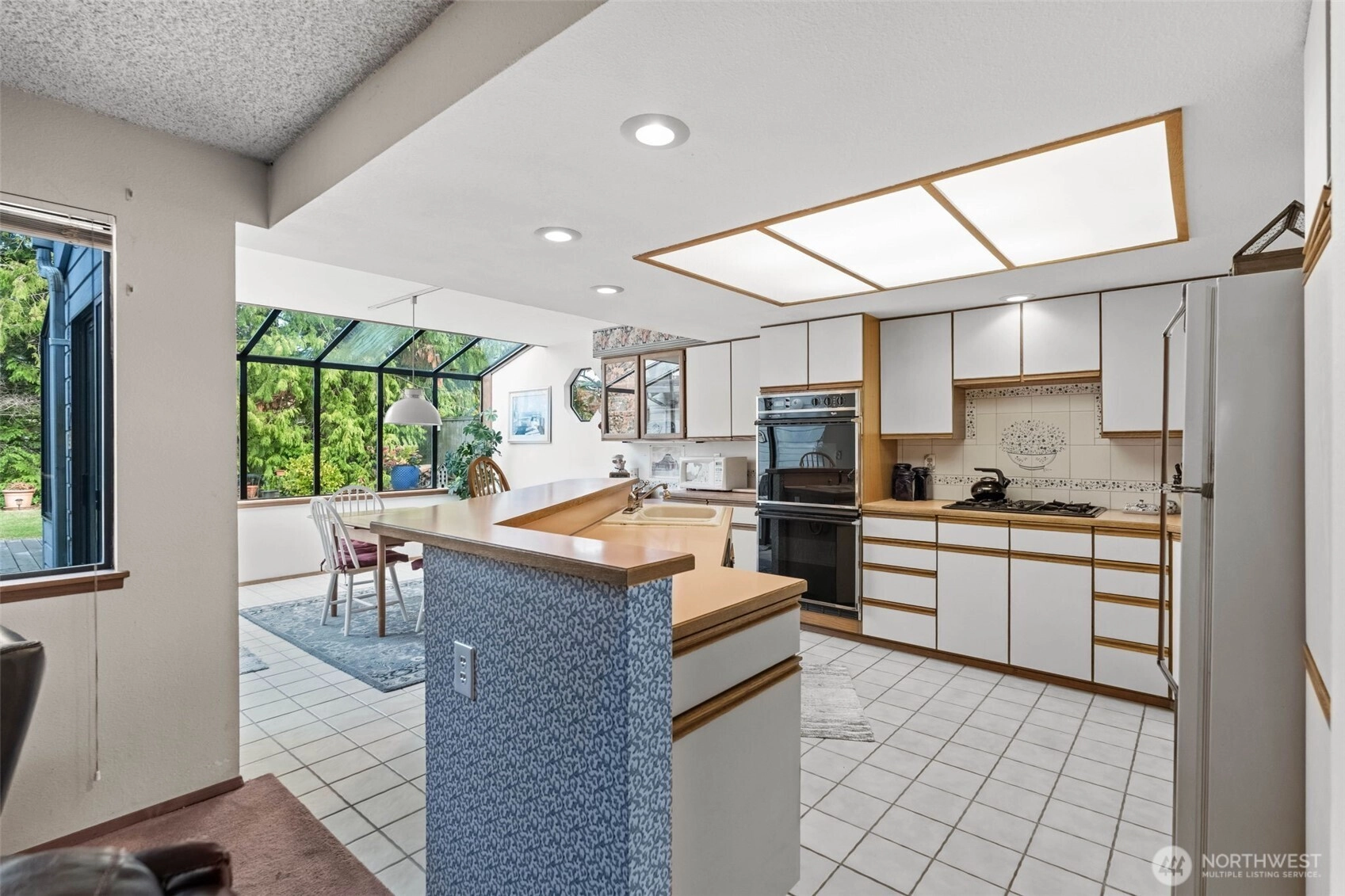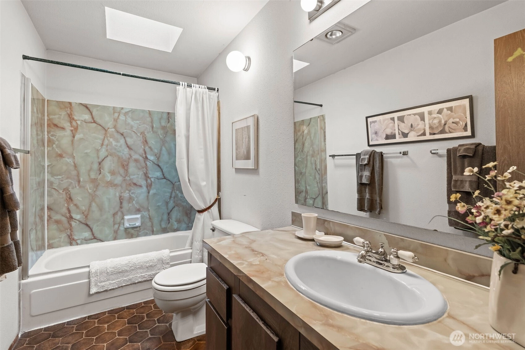 Discover the potential in this spacious NW Contemporary on a serene private lot. Light-filled main level offers a living room with fireplace and a bright sunroom off the kitchen. Upstairs features a large primary suite with walk-in closet and full bath, two additional bedrooms, full hall bath, and a loft-style den/office (possible 5th bedroom). Lower level includes a generous bedroom with separate backyard entrance, family room with second fireplace, and half bath—ideal for multi-gen living. Large backyard with deck offers great space for entertaining/gardening. Major updates include new water line, furnace, water heater, and a 3-yr old roof. Prime location near I-5, I-405, and Sea-Tac Airport. Bring your vision and make this home shine!