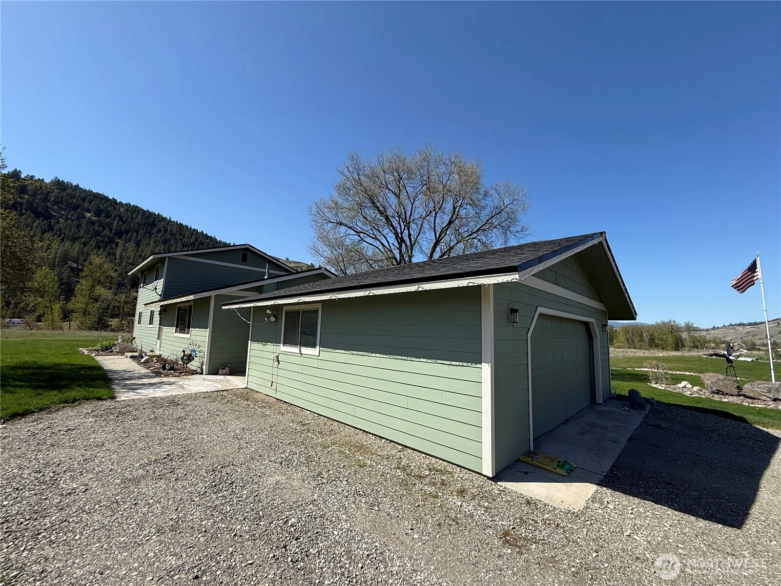 What a remarkable property. Almost too much to list. Large 4 bedroom home with primary bedroom on the main floor that has both a large bonus room and three-quarter bath attached. The large, bright kitchen has plenty of cabinet and counter space with eat-at breakfast bar. Large family room with pellet stove just off the kitchen. Door off the kitchen leads to the detached 2-car garage which makes unloading grocery more efficient. There's a large deck off the side of the home, perfect for BBQ's and entertaining. Beautifully landscaped yard with creek that runs through the front and side yard. Huge pass through shop with extra tall doors and concrete floor. You'll enjoy easy year around access off of the state highway.