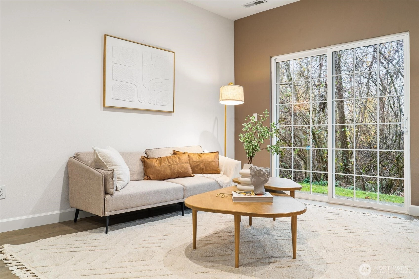 Beautifully modernized townhome offering a sleek, contemporary living experience. Enjoy open-concept living with a stunning kitchen featuring stainless steel appliances and sleek finishes throughout. This two-story home showcases luxury flooring and elegant details in every room. The grand primary suite includes a walk-in closet and a spa-inspired ensuite, complemented by a second stunning ensuite bathroom in the additional bedroom. Cozy up by the gas fireplace and unwind on the serene covered patio that backs to lush green space. With a one-car garage, easy freeway access, and an unbeatable location, the seller has done it all—simply move in and enjoy.