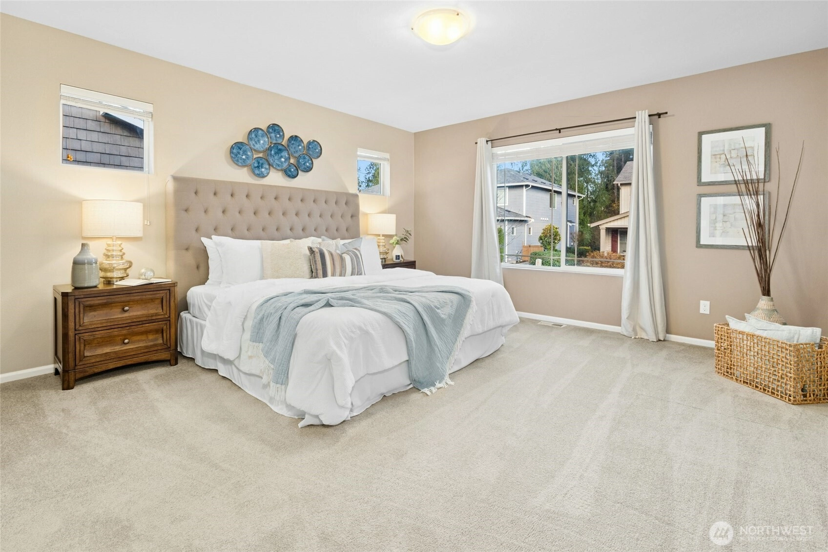 Tucked into the tranquil Cascara 55+ ARCH community, this contemporary home blends comfort, style and ease. An open great room with soaring ceilings sets the stage for everyday living, flowing into eat-in cook’s kitchen with beautiful rich wood cabinetry, stone counters, ss appliances and island. The main-floor primary suite offers a true retreat with ample closet space, five-piece bath and soaking tub. Upstairs adds another two bedrooms, full bath, and a flexible loft for work or hobbies. Single car garage and driveway parking. Enjoy quiet mornings on the private patio overlooking. With thoughtful upgrades, AC, and access to nearby trails, shops, and Redmond Ridge golf, this home elevates your everyday. Must see, restrictions apply.