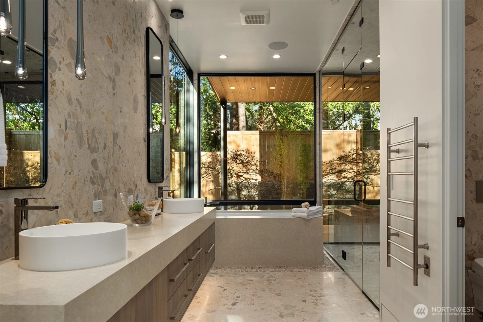 Bylington Development presents the "Forest House". A refreshing style rarely seen in new construction inspired by the rich and deep history of Japanese influence on Pacific Northwest architecture. A quiet and calming style of luxury craftsmanship that understands the natural world is a source of peace and inspiration. From the moment you step into the foyer you will notice the meticulous attention to detail that can only be attained by experienced and highly trained artisans. Primary suite on the main floor, great room with 14' ceilings, formal dining, and "Dojo". 6 ensuites plus loft. All-season, outdoor covered patio, gated auto-court, and 4 car garage can be expanded to 8 with lifts. Coveted Bellevue schools, minutes to downtown Bellevue