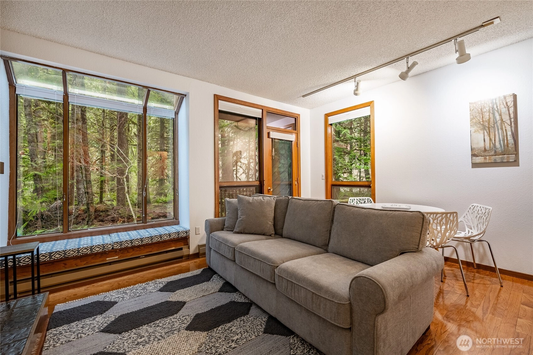 Immaculate corner unit 1 bed condominium at the Snowater Resort, comes turn-key & furnished. Located on the Nooksack River adjacent to the Mt. Baker Snoqualmie National Forest. Easy access to year-round outdoor recreation at Mt. Baker Ski Area and the backcountry. The resort grounds include tennis, pickleball, basketball, racquetball courts, 2 indoor swimming pools, jacuzzi, sauna, and gym. Cook out at the riverfront community BBQ and picnic area or enjoy the quiet at the historical log cabin. Trails surround the property. The perfect place for relaxation and recreation in every season. Capital improvements recently completed: New roof, completed chimney chase & painting project, new screen doors. No special assessment. STR possible.