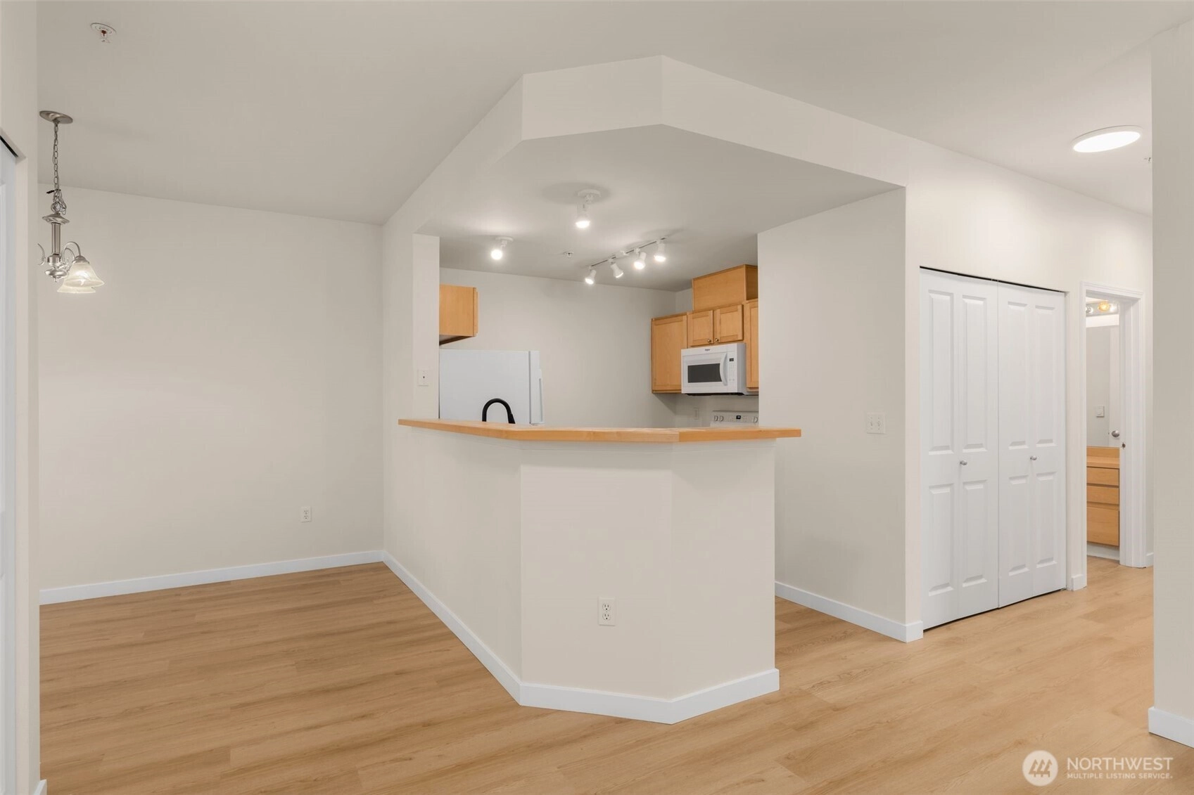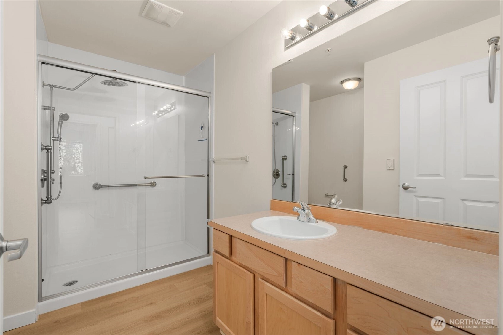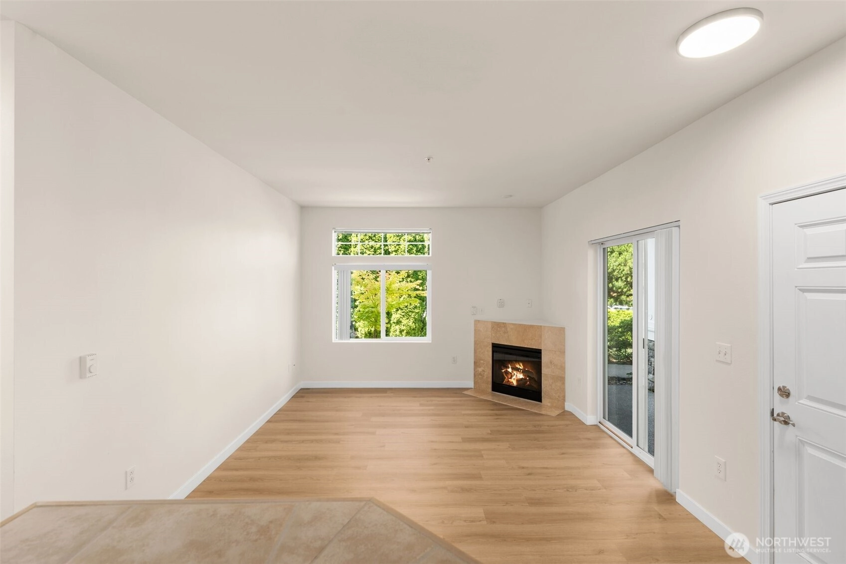 Corner end unit totally move-in ready with fresh paint and brand new LVT flooring throughout (no carpet)! Enter to living room with wonderful natural light, cozy fireplace w tile surround & slider to patio. Open design kitchen: wood cabinetry, new fridge, newer range & microwave. Fantastic layout w/two bedrooms including generous Primary Suite can fit a king sz bed, walk-in closet, it's own full bath: double sinks & oversized soaking tub. Head down the hall to the Guest Bedroom, new hallway bath w new custom walk-in glass shower w rainhead, & laundry in-unit. Popular Carrara at Lakeland, and easy one-level living. Detached garage parking. Community w/parks, Clubhouse. Enjoy an active Lakeland lifestyle!