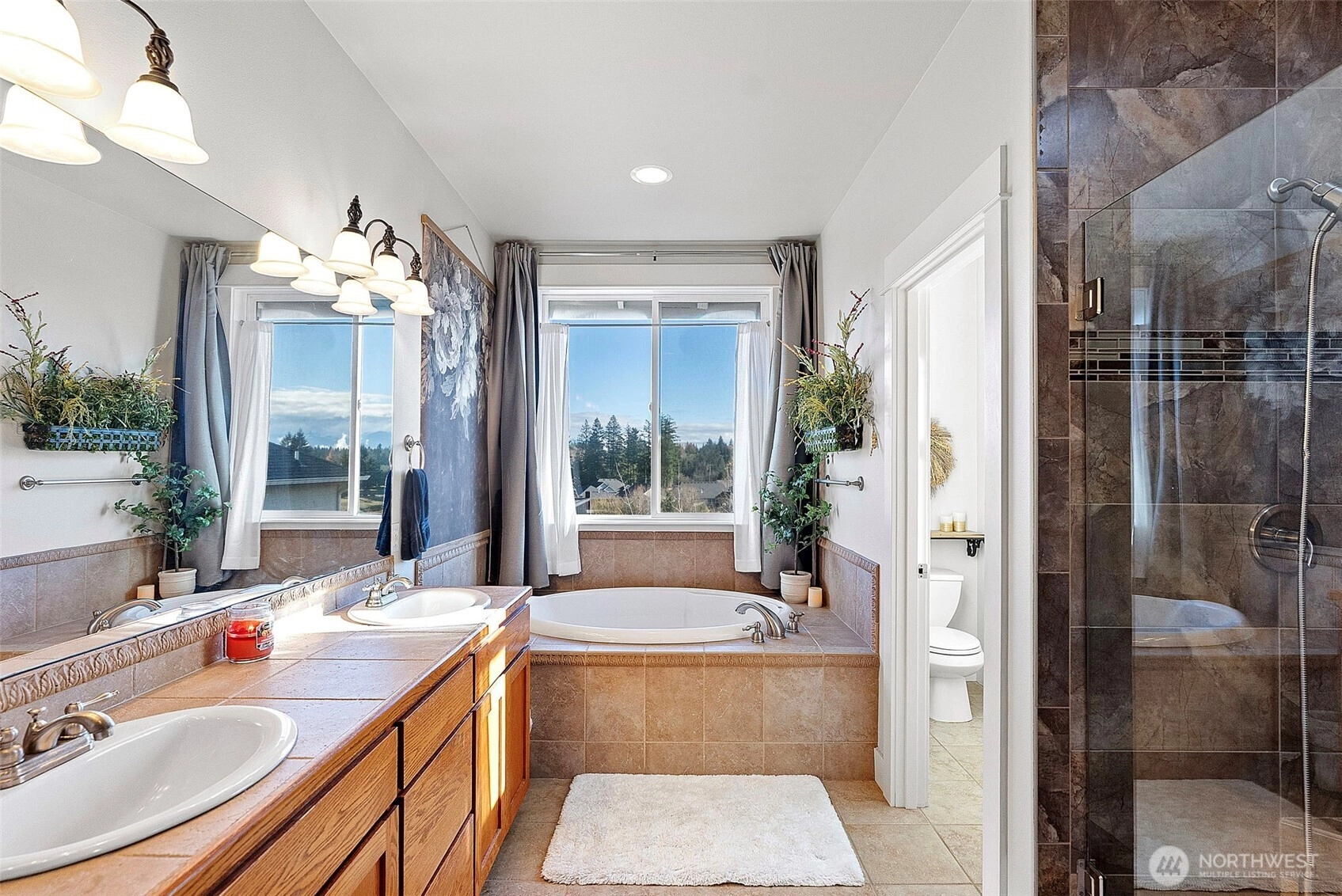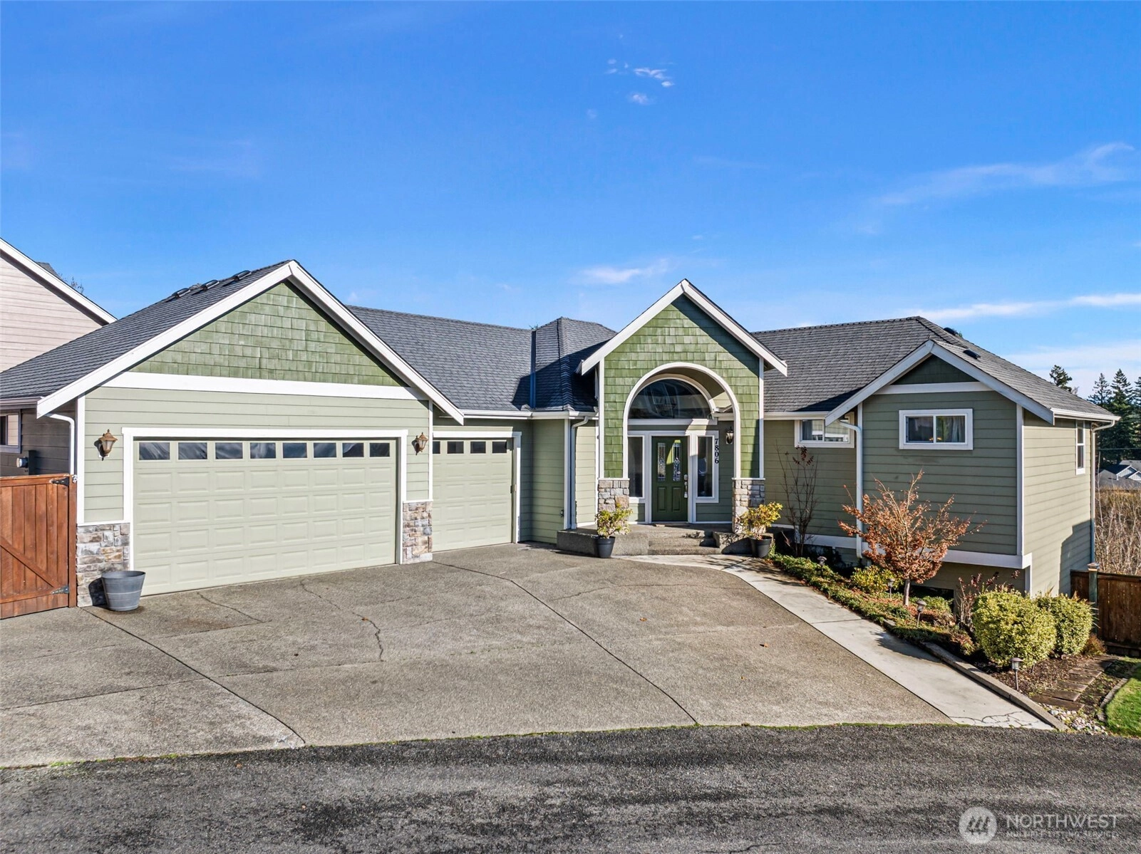 Where comfort, style, & views converge! This beautifully designed 2716 sq foot 3 bed 2.5 bath 1 story w/full daylight basement is nestled in the desirable Springhaven community of Bonney Lake. Main level welcomes you w/an open living room anchored by clerestory windows & cozy gas fireplace. Step through sliding door onto the deck & soak in stunning views of Mt Rainier, an unforgettable backdrop! Primary bedroom located on main level w/5-piece ensuite +huge walk-in closet. Laundry rm & garage also on main level! Downstairs offers lower deck, huge rec room complete w/wet bar +mini-fridge, 2 bedrooms, 1 w/access door to full bath, perfect for guests! New furnace +A/C in 2024! 3 car garage+ behind gate RV/ boat parking. This home IS a rare gem!