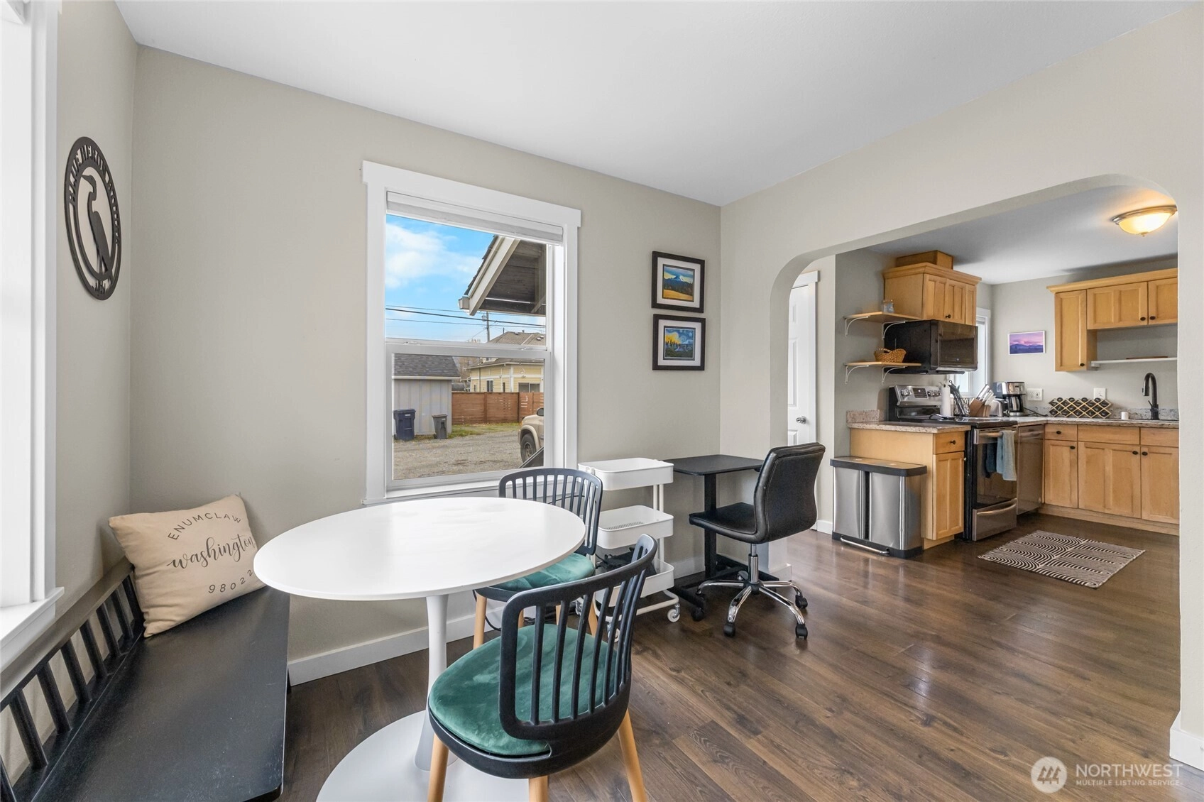 Home Seller Advantage Program in place. This program increases buyer purchasing power and supports smoother, faster sales. Welcome Home to this Charming Craftsman Bungalow in the Heart of Downtown Enumclaw! This beautifully updated 650 sq.ft. home offers 2 bedrooms, 1 bathroom, and a cozy living room filled with natural light. The stylish kitchen features granite countertops, stainless steel appliances, and a convenient dining area—perfect for daily living or entertaining. Step outside to a fully fenced yard with mature landscaping, creating a private and inviting outdoor space. Its prime location puts you just moments from restaurants, shops, parks, schools, and local amenities. Enjoy quick access to the Enumclaw Golf Course, Mud Mountain Dam Park, Mt. Peak hiking trails, and Crystal Mountain. Don’t miss your chance to own a charming piece of Enumclaw history!