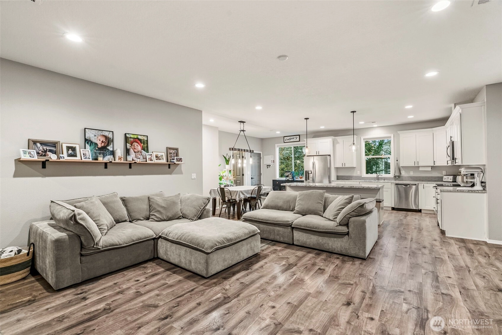 Discover the perfect blend of function, style, and comfort in this inviting 3 bedroom, 2 bath home featuring high ceilings, an open layout, and generous room sizes. The elevated design sits a one level plan above a massive garage with space for 5–6 cars plus! Perfect for hobbies, storage, or extra workspace. Relax in the fenced backyard around the firepit or watch squirrels and birds from the kitchen window. Two closets in the primary bedroom! Lots of storage throughout. Clean and bright with neutral color choices and easy care materials. This home offers convenient access to nearby schools, parks, churches, downtown Woodland, and freeway connections. Minutes from Lewis River and Horseshoe Lake for summer fun. Home in the center of it all!