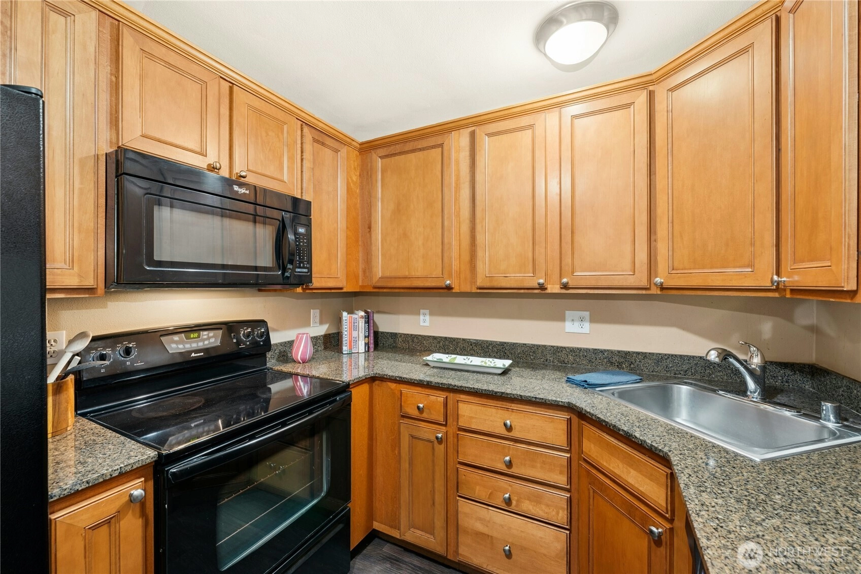 Prime location - Marina Place overlooks the Des Moines Marina, which is just steps away. While this unit doesn't have a view, it is a rare opportunity to own a great unit in a safe, secure building with more expensive units located at the marina. It is an easy walk to all the restaurants and shopping downtown Des Moines has to offer. Nicely updated with a full-sized kitchen featuring upscale cabinetry, like new appliances, granite counters, and there is an in-unit washer/dryer. The living room and bedroom are both large, making this unit feel and live big. There is an oversized private garage with a large storage closet. The HOA is well run so the monthly dues are reasonable, making it easy to own in a superior building cheaper than rent.