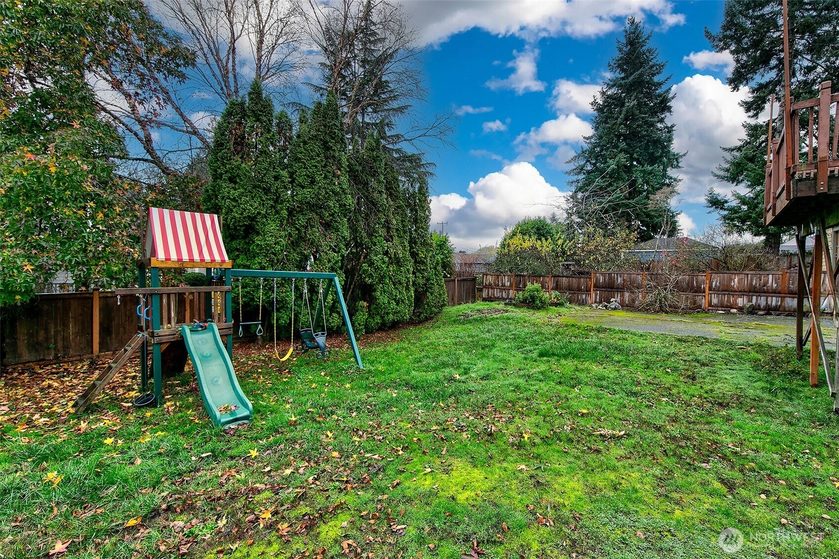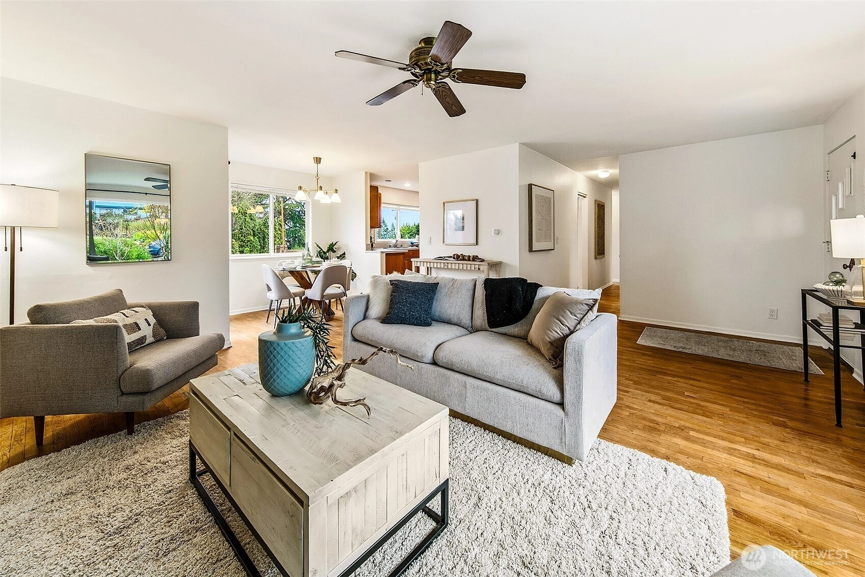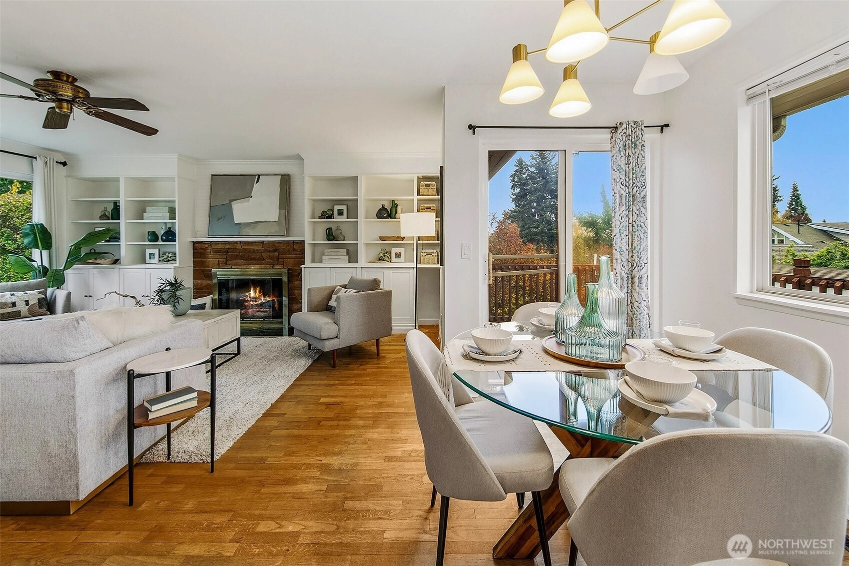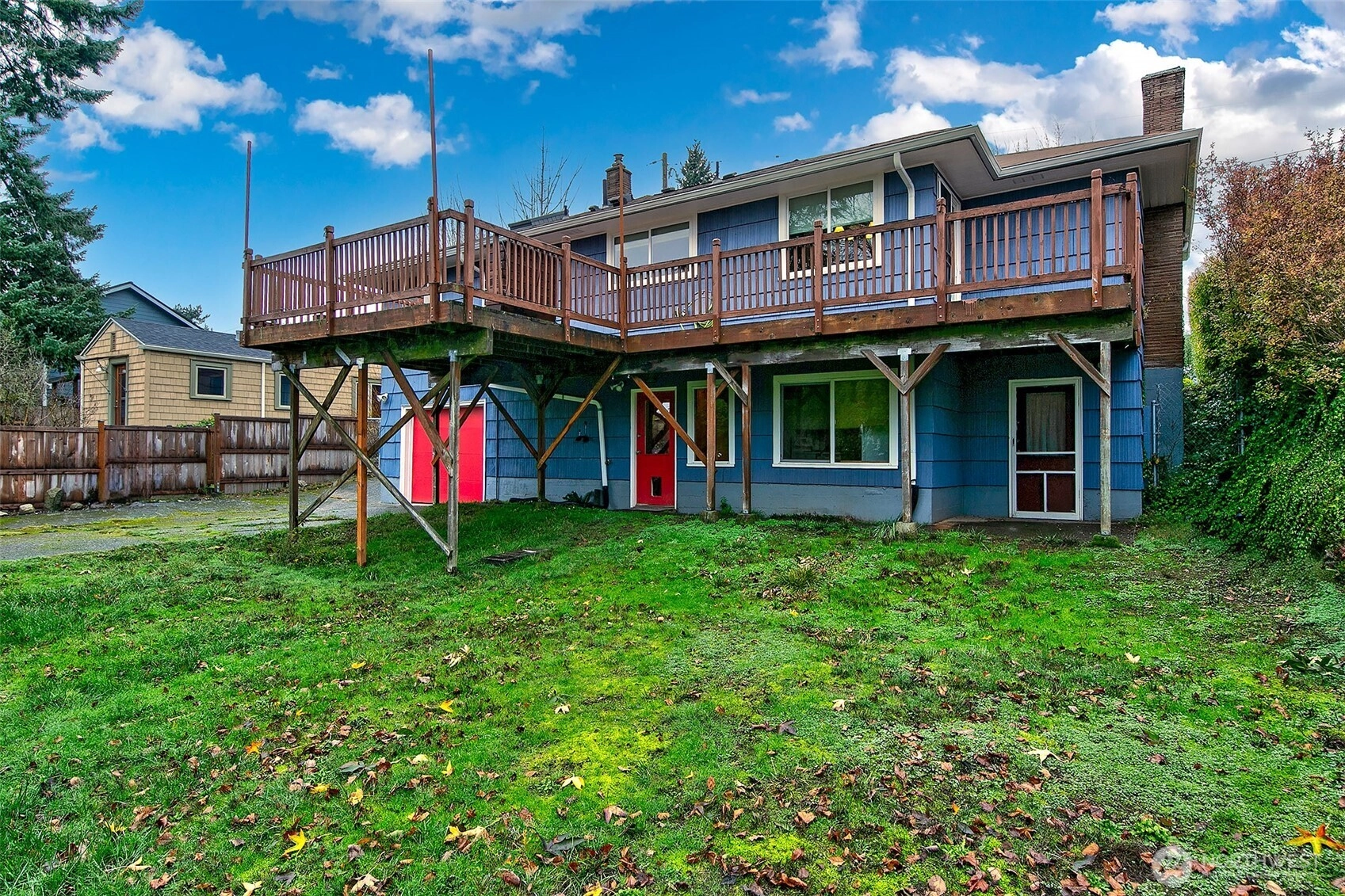 Welcome to this classic 1955 rambler nestled on a quiet street in the Fauntleroy/Gatewood neighborhood of West Seattle. Step inside to find hardwood floors, large picture windows that flood the living spaces with natural light, and a cozy gas fireplace with built-ins, perfect for cool Seattle evenings. The kitchen features clean lines and efficient design, opening to a spacious dining area, large deck and huge private backyard - ideal for gatherings or outdoor living. Three comfortable bedrooms and a remodeled full bath on the freshly painted main floor. Daylight lower level with rec room, 3/4 bath and kitchenette perfect for entertaining and relaxing. One car attached garage. Great location near parks, schools and shopping!