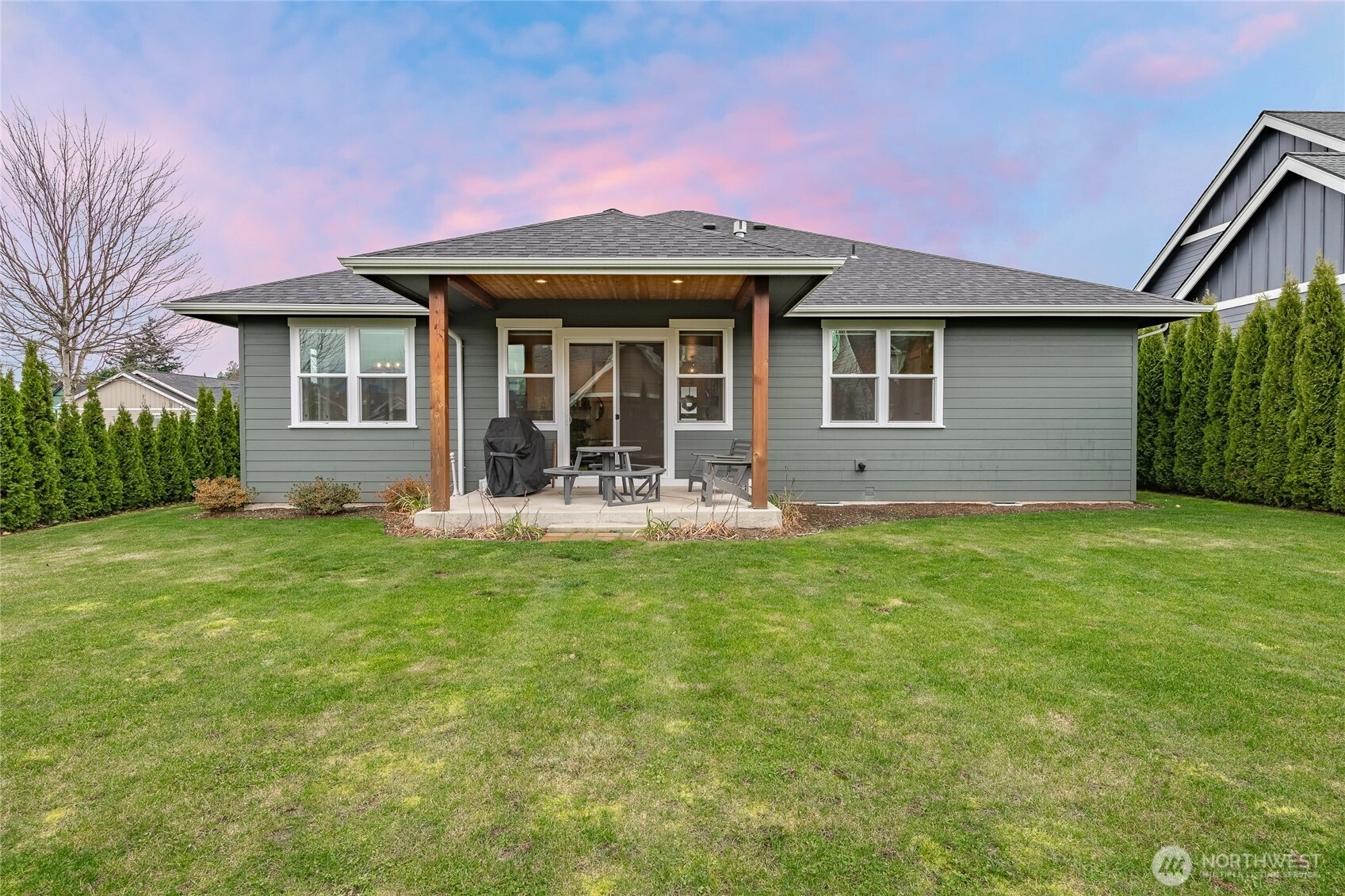 Welcome home! Located in pristine Lynden, this lovely single level home is quality construction from top to bottom. The elegant kitchen has abundant soft closed cabinetry, quartz counter tops, large island, black SS appliances, beverage cooler, tiled backsplash & walk-in butler's pantry. The floorplan is open between the kitchen, living & dining room, warmed by a gas fireplace. Many windows bring in lots of natural light & outdoor beauty. The primary has a huge walk-in closet, spacious bathroom w/a tub & walk-in tiled shower. Other items include AC, washer & dryer, under eve lighting, 10’ ceilings w/ 8’ doors throughout, tankless water heater, outdoor sprinklers & large, covered patio. Close to schools. This home is an entertainers' dream!