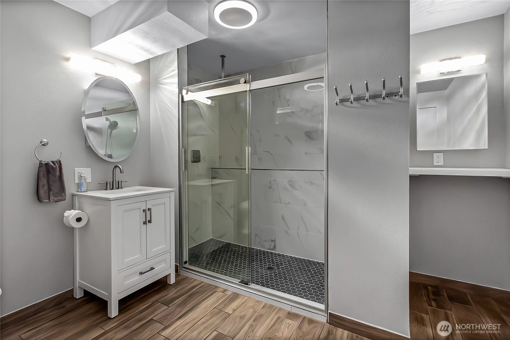 Beautifully updated inside and out with Two Primary Suites! Located in Stonewood, fabulous University Place neighborhood. 4 bedrooms, 3.5 baths, 2 car attached carport. Upgrades include creating the Primary Bedroom Suite on the lower level, remodeled 3/4 bath, new walk-in closet. New 1/2 bath on the lower level. Remodeled kitchen with Quartz counters, appliances, fixtures, new LVP flooring, new pantry. New chimney cap and flu, brick work cleaned. Honeywell thermostat. Heat Pump/AC. Full bath up. Junior Primary Bedroom w 3/4 bath up. Keyless entry. Washer/Dryer stay. New water heater 2021. Family Rm down + Wet Bar + pellet stove. New Trex Deck. New gutters. Fenced yard, 2 storage sheds. 40' ft flag pole included. Close to private schools.