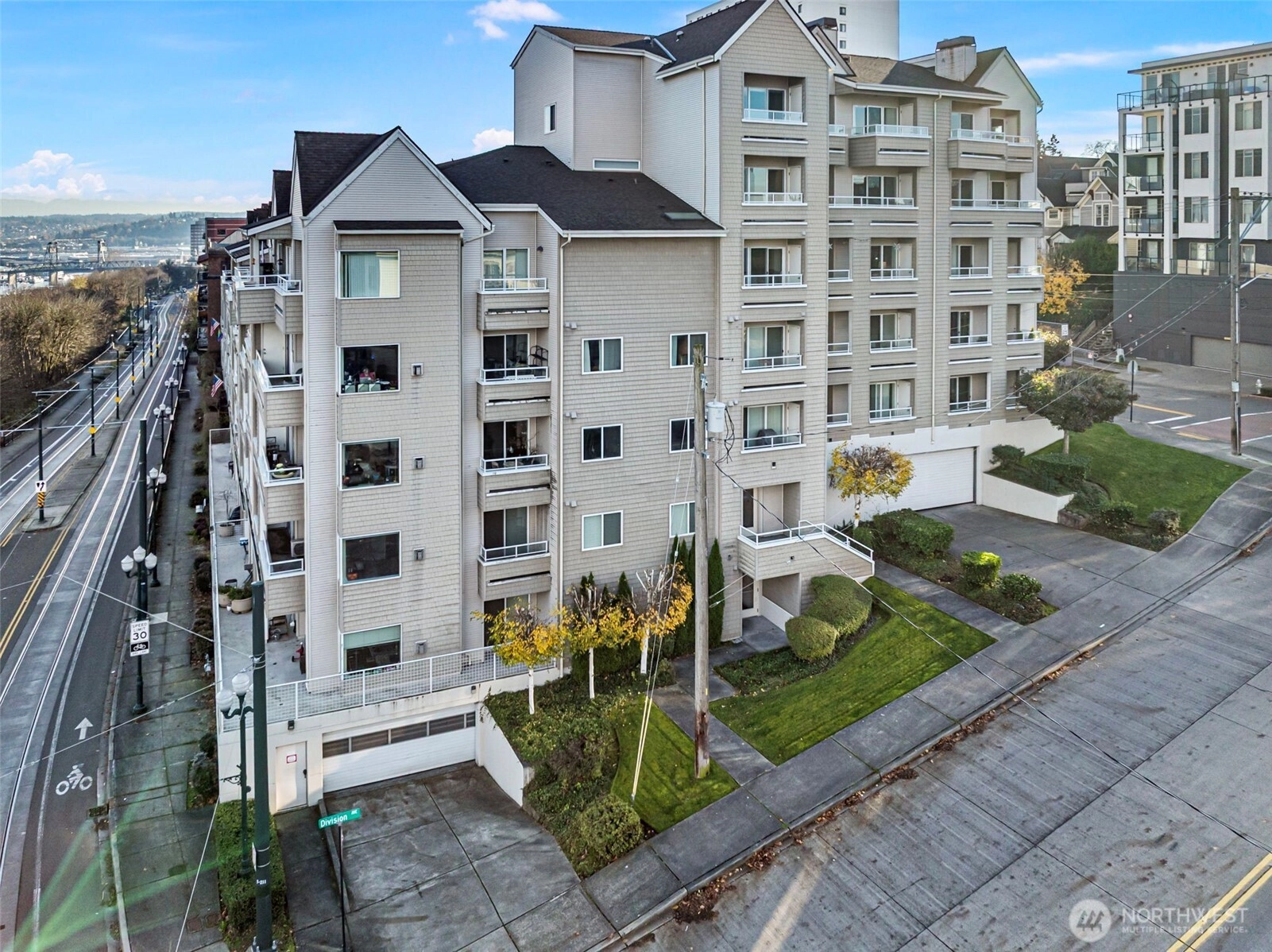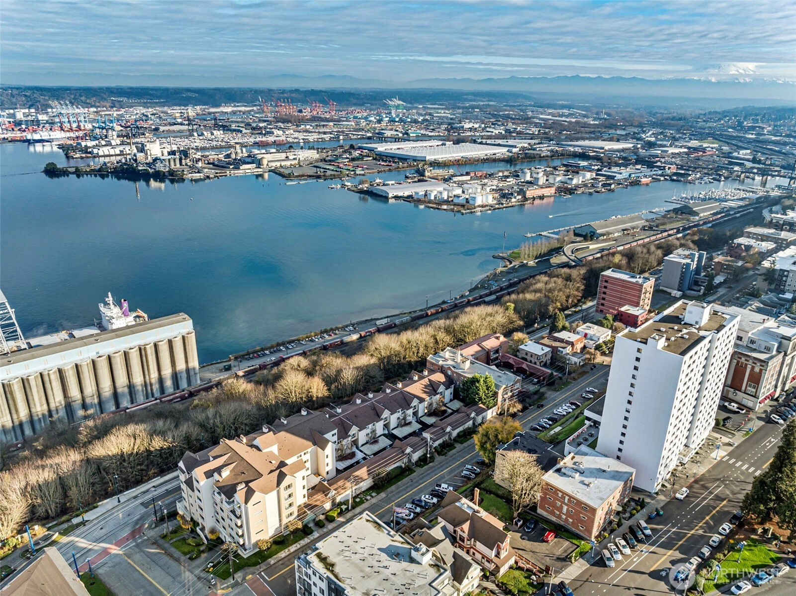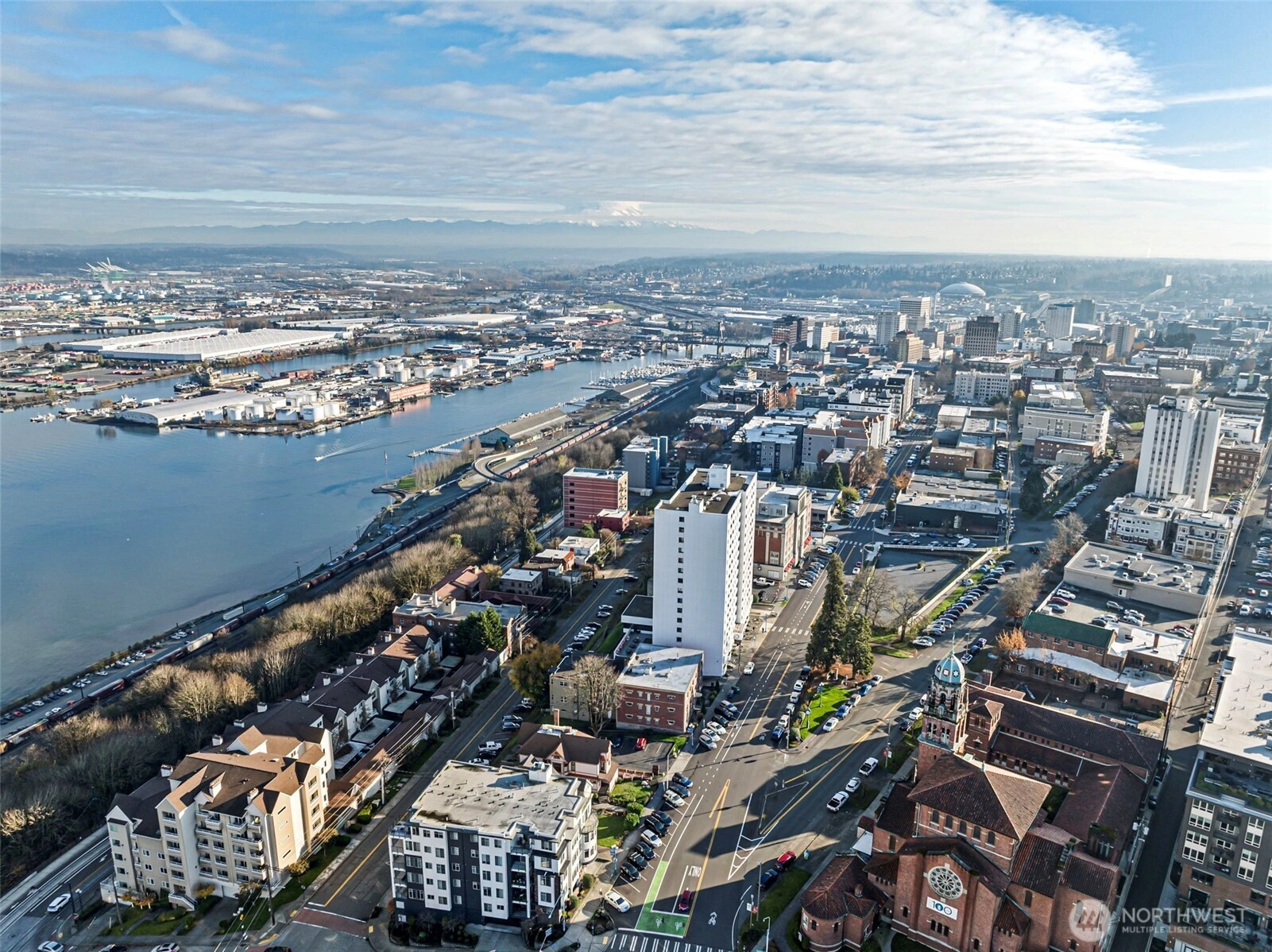 VIEWS VIEWS VIEWS from this top floor, end corner unit!! Big views of Mt. Rainier, the Cascades, Commencement Bay, and the Port of Tacoma. Light and bright in every room with TWO private balconies. Quiet and updated with beautiful flooring and fresh carpeting. Large primary bedroom with two generous closets and en suite bath. Second front bedroom with additional large closet space. Close proximity to the new light rail line, shopping, restaurants, and grocery in the Stadium District, Wright Park, and the downtown. Private parking in the underground garage with additional storage unit.