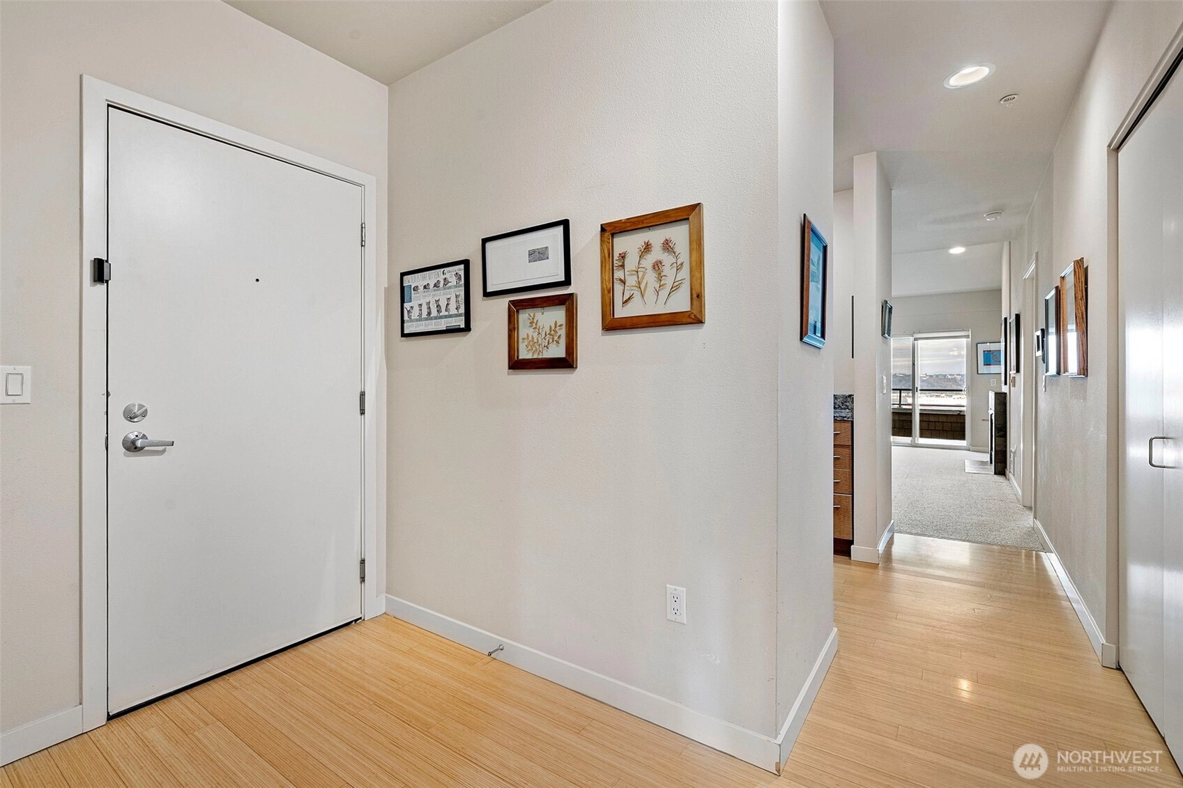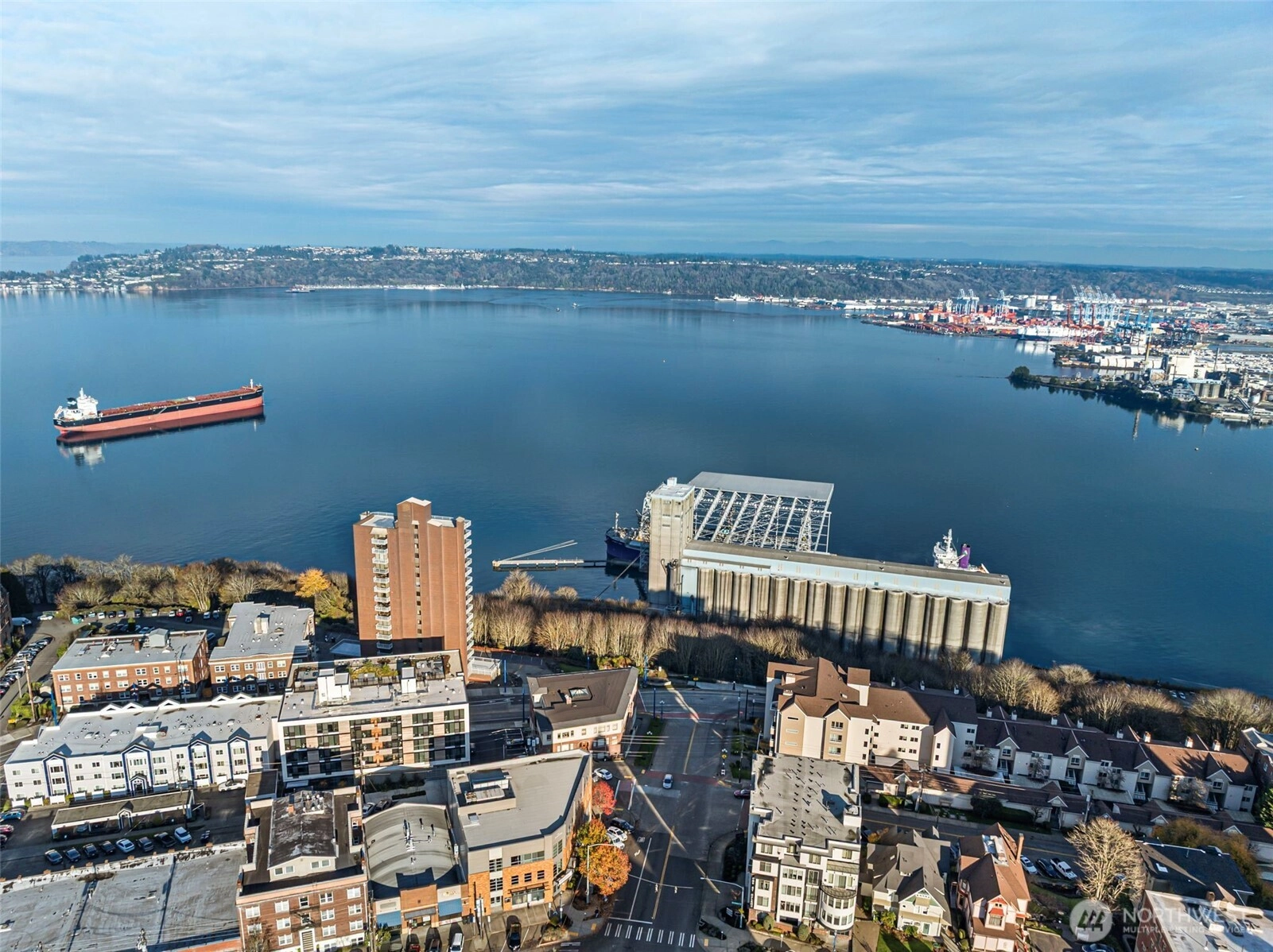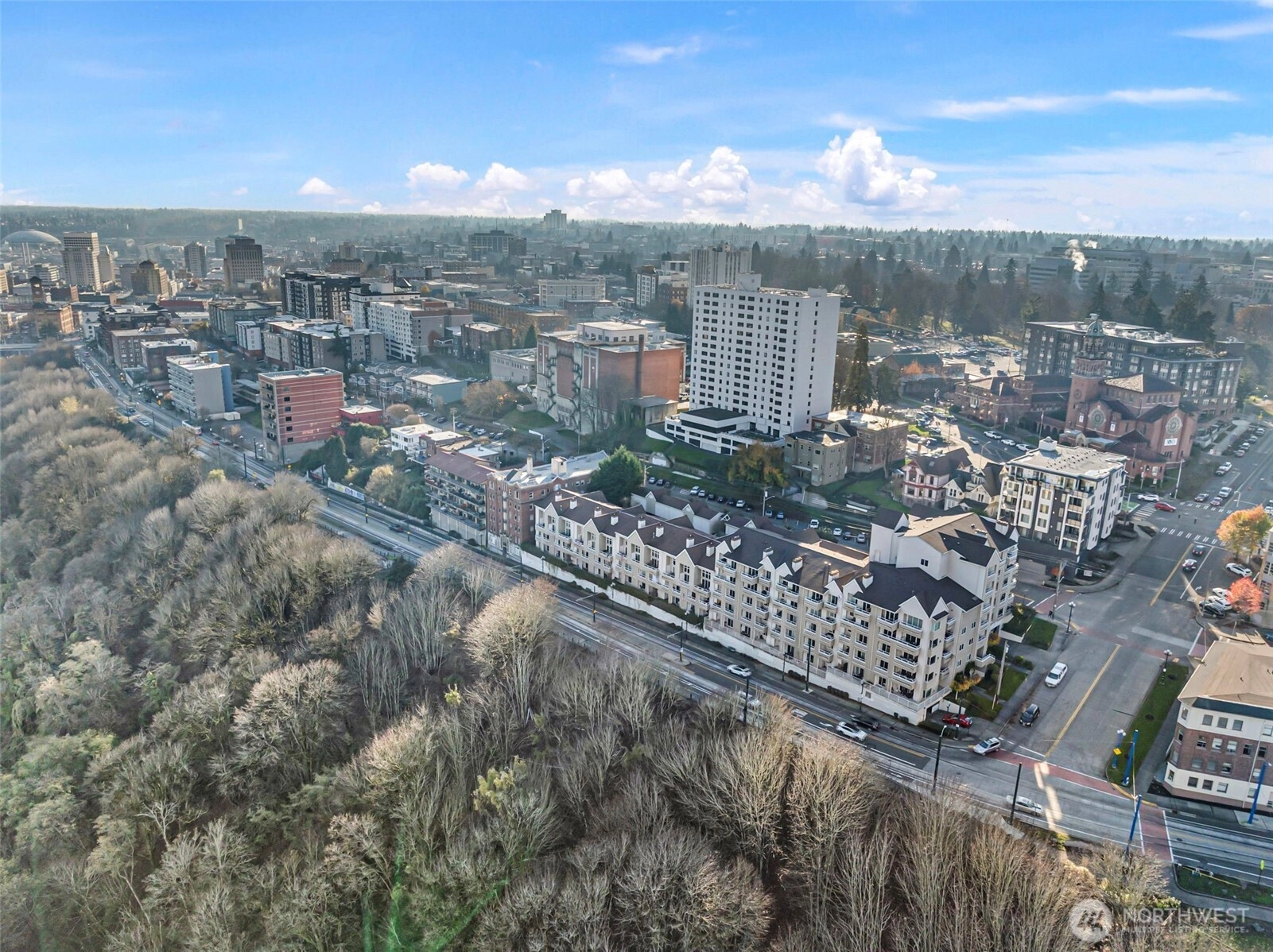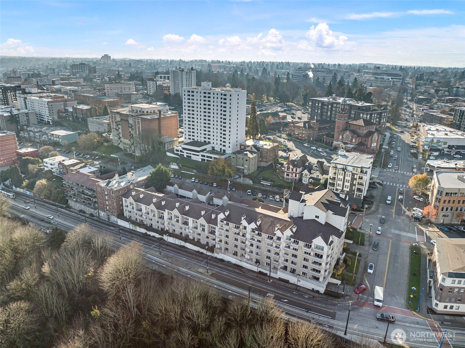 VIEWS VIEWS VIEWS from this top floor, end corner unit!! Big views of Mt. Rainier, the Cascades, Commencement Bay, and the Port of Tacoma. Light and bright in every room with TWO private balconies. Quiet and updated with beautiful flooring and fresh carpeting. Large primary bedroom with two generous closets and en suite bath. Second front bedroom with additional large closet space. Close proximity to the new light rail line, shopping, restaurants, and grocery in the Stadium District, Wright Park, and the downtown. Private parking in the underground garage with additional storage unit.