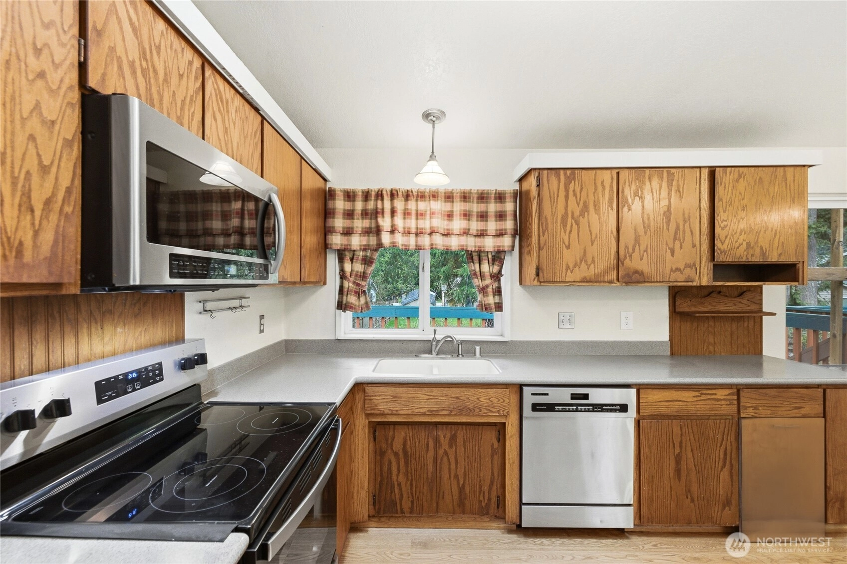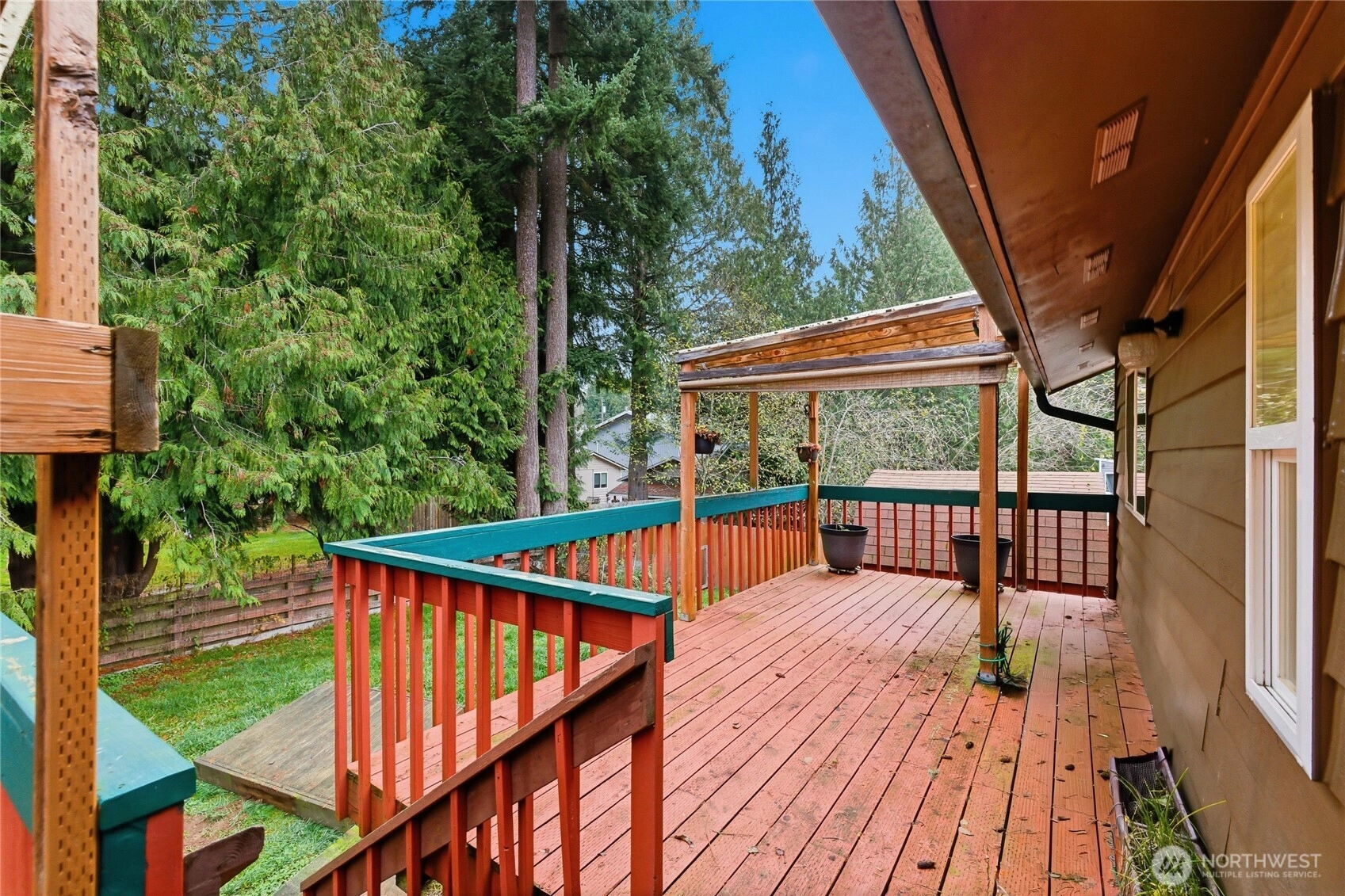 Move-in ready! Fresh interior & exterior paint plus a new roof with a transferable warranty set the stage. Relax on the front porch or enjoy the expansive back deck overlooking a level, fully fenced yard with fruit trees. Inside, a cozy wood stove warms the living room, while the primary suite offers a private bath. Lower level adds a den, rec room with fireplace, and 3/4 bath. Upgrades include windows, Leaf guard gutters with warranty, garage door & motor, and chimney rebuild. 10x12 hobby shed, garage with workspace, and storage room off deck provide versatility. Wired for generator and RV parking with hookup. Community amenities include boat launch, playground & trails—everything you need for comfort and adventure!